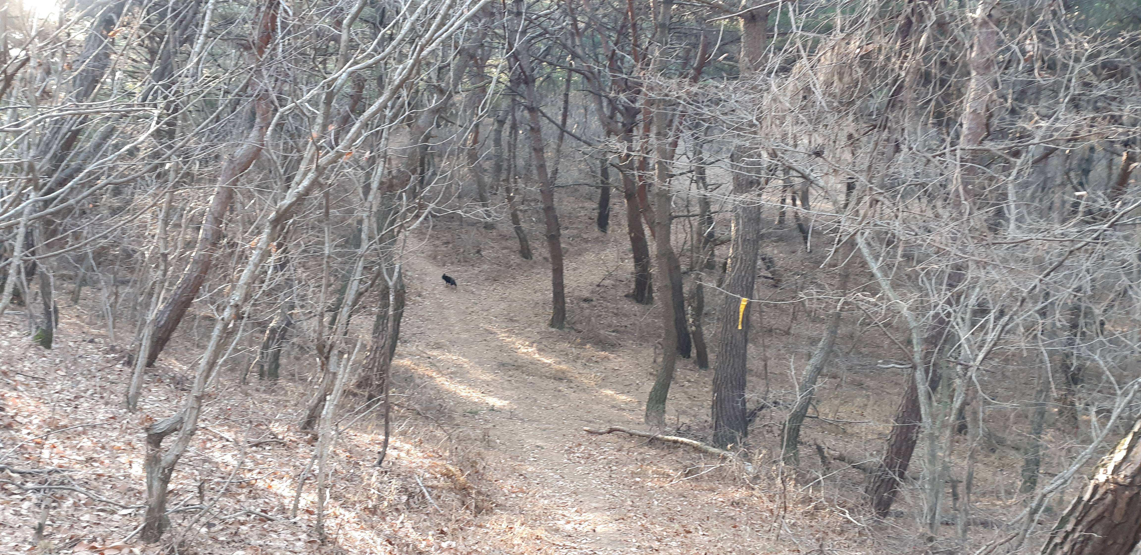 지맥길에서 벗어나 신원산으로 오르는 안부에는 들개가 인기척에 놀라 멀리 도망친다(09:19)