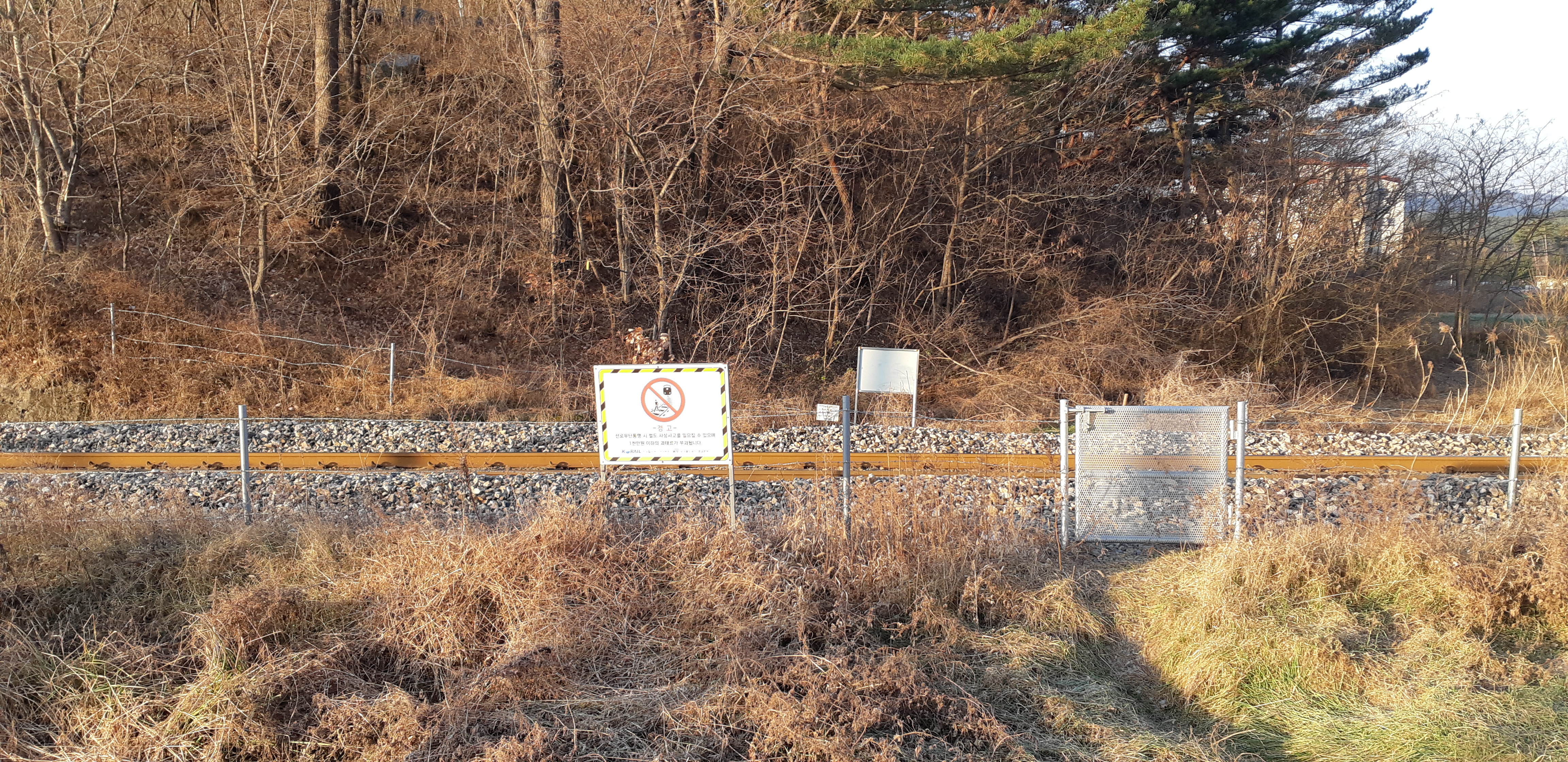호미지맥 원고개에 위치한 동해남부선 철로를 넘어 산으로 든다/철길로 들어서는 철문은 자물통은 없다(08:25)