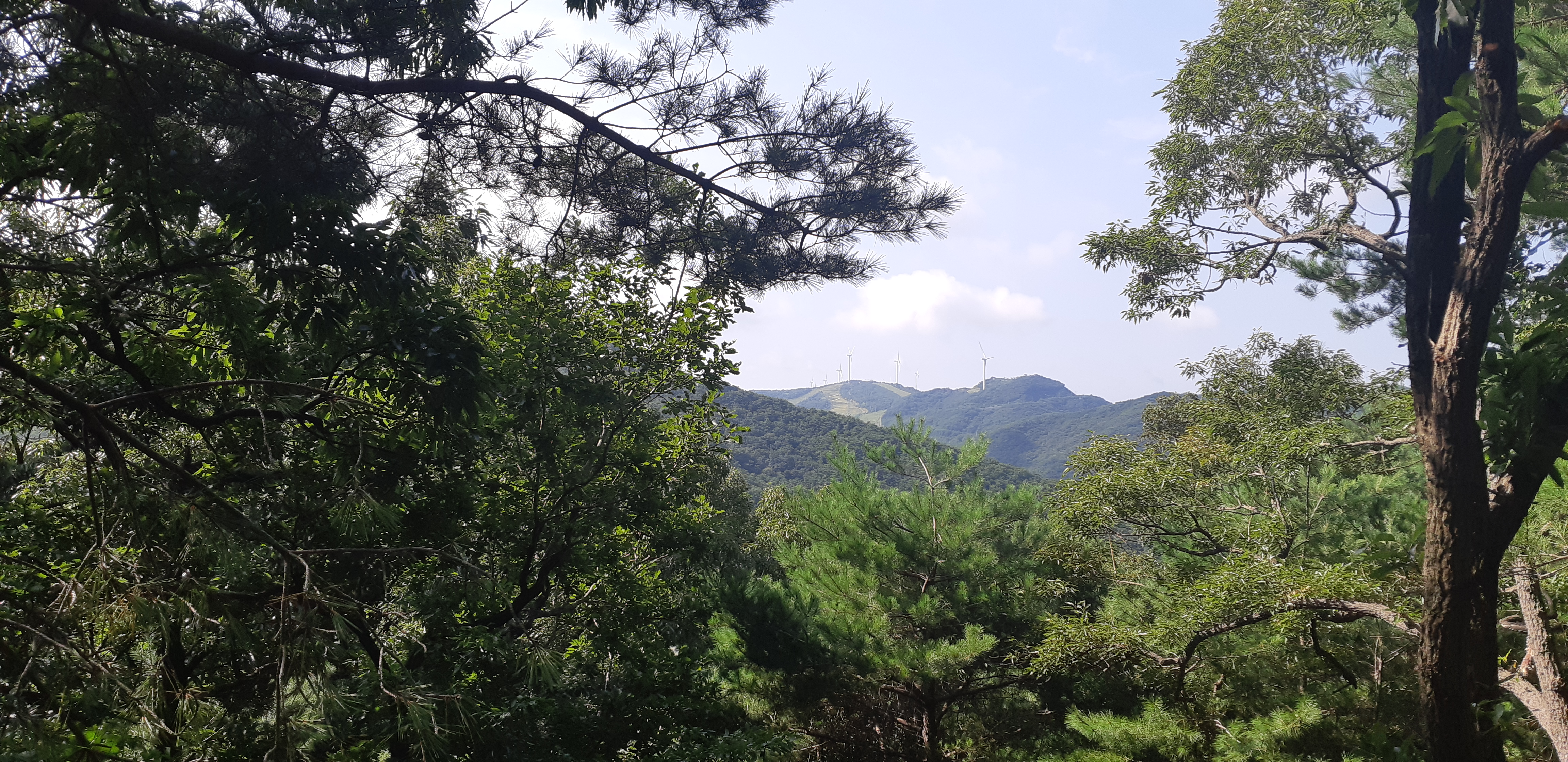 내림길에서 나무가지 사이로 에덴밸리 스키장의 풍력발전기가 쉴사이 없이 돌아간다(09:35)
