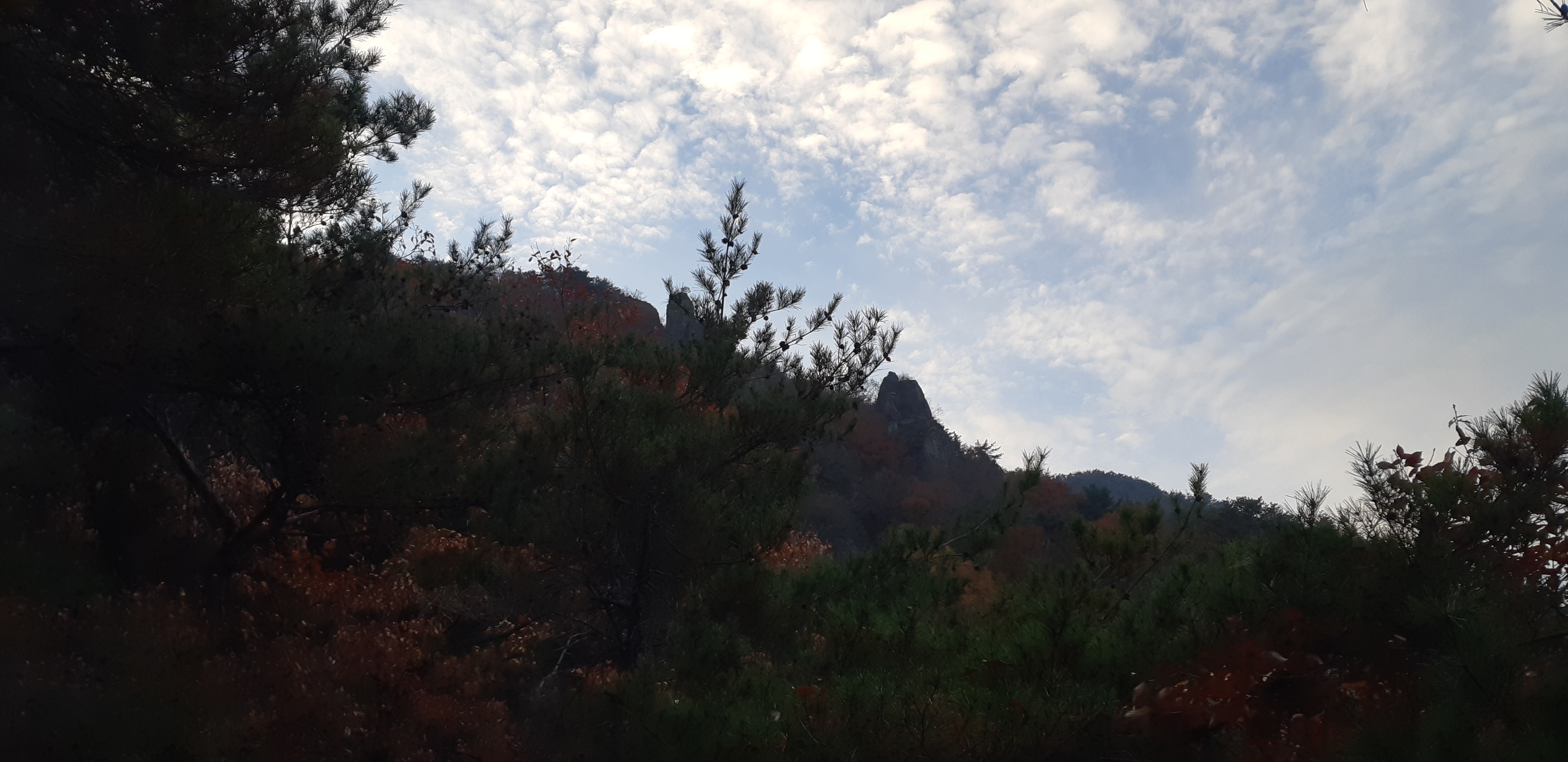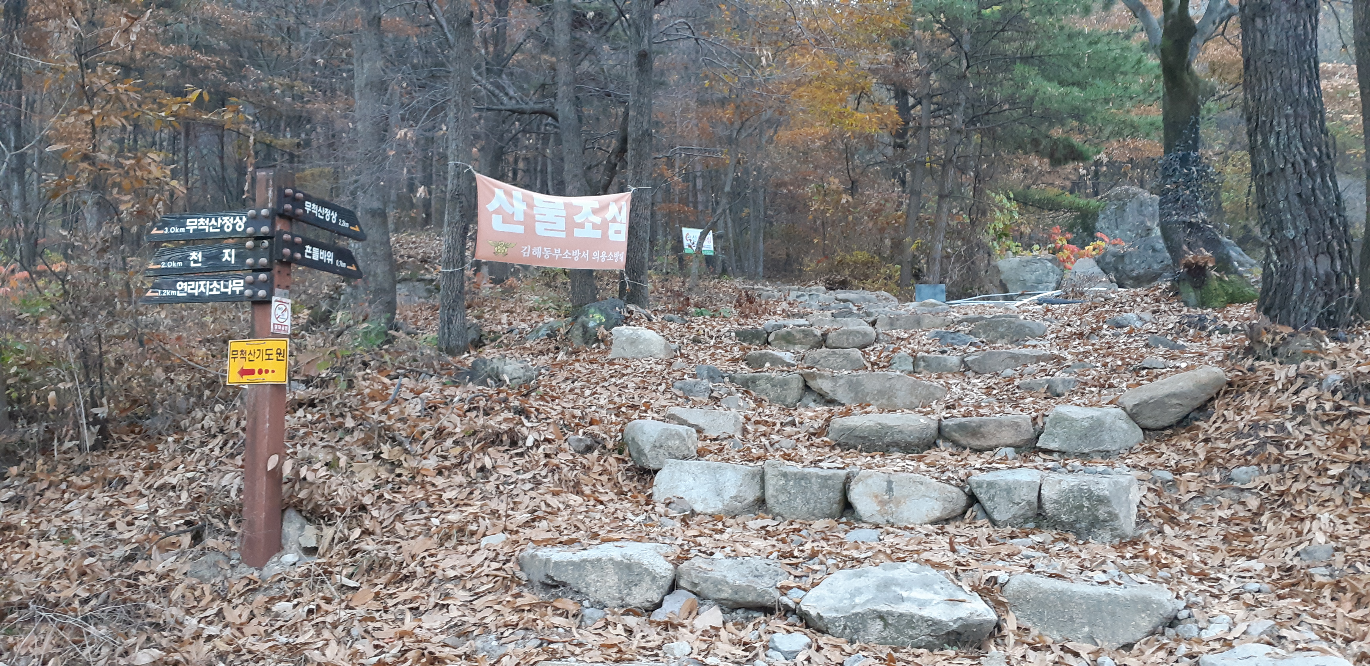 산행 준비를 갖추고 시간이 충분하니 몸을 천천히 가열시키면서 오른다. 이곳 무척산은 3회 정도 올랐지만 모두 10여년 가량 흘러 기억이 가물가물한 지경이다. 모은암 방향으로 오르면서 공룡알바위, 장군바위를 둘러보고 통천문을 통과하니 연리지(連理枝)인 부부소나무가 나온다. 이곳을 지나 잠시 오르면 천지 폭포가 보인다만 갈수기라 수량이 적어 아쉽다. 천지 폭포를 돌아 올라가면 가락국의 수로왕(首露王)과 연관된 무척산 아래의 천지(天池)가 자리한다. 이때 울리는 전화를 받아보니 오후의 일이 오전으로 당겨졌다는 연락이다. 마음이 급해졌고 급히 무척산(無隻山) 정상을 찍고 주차장에 내려서면서 미끄러운 낙엽 길에 엉덩방아를 찧었는데 한 동안 아픔을 느꼈다. 내려서는 길은 1시간가량 걸렸고 오전 시간으로 당겨진 업무를 별 탈 없이 마무리 할 수가 있었다는 게 다행이다.