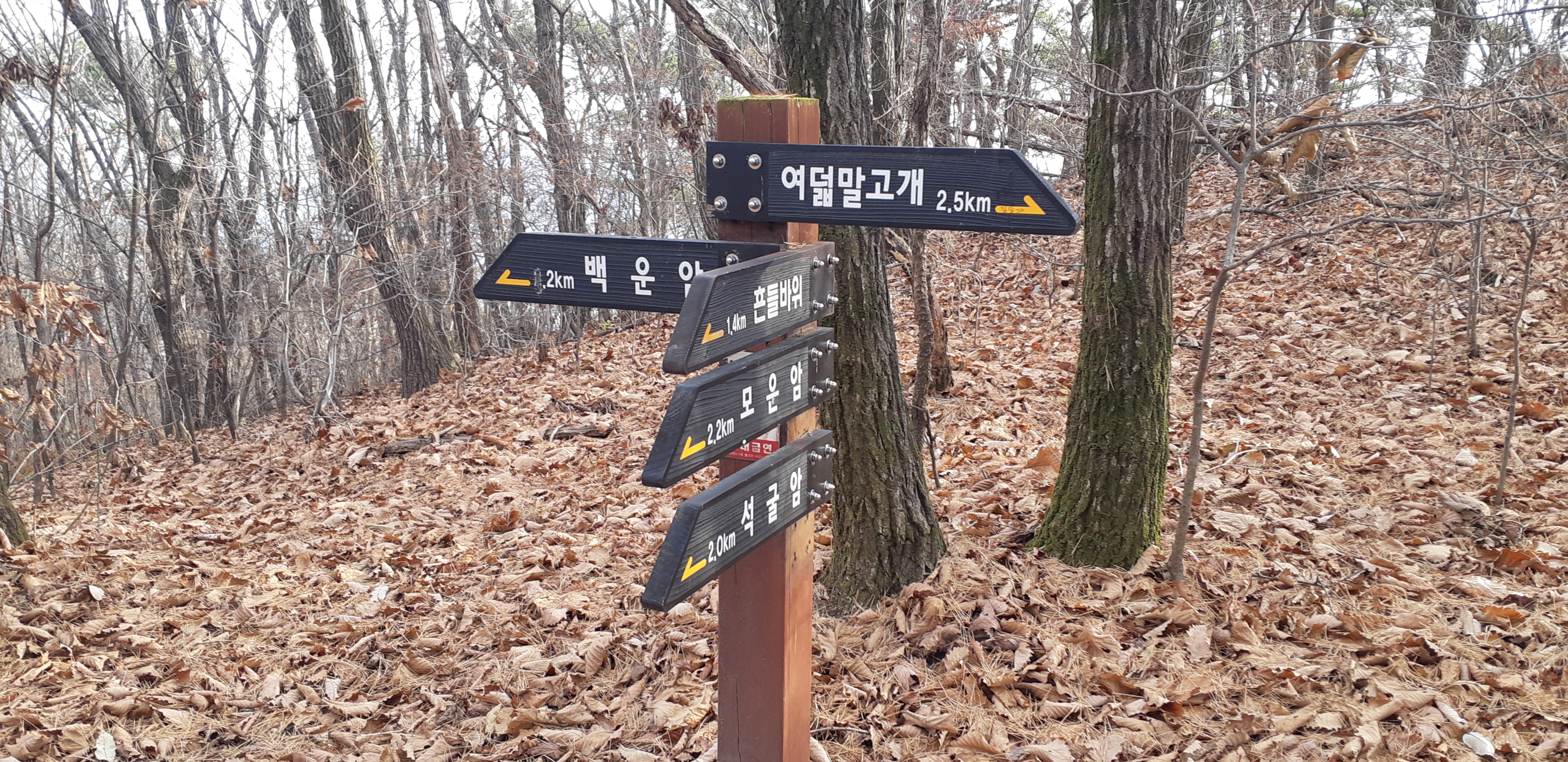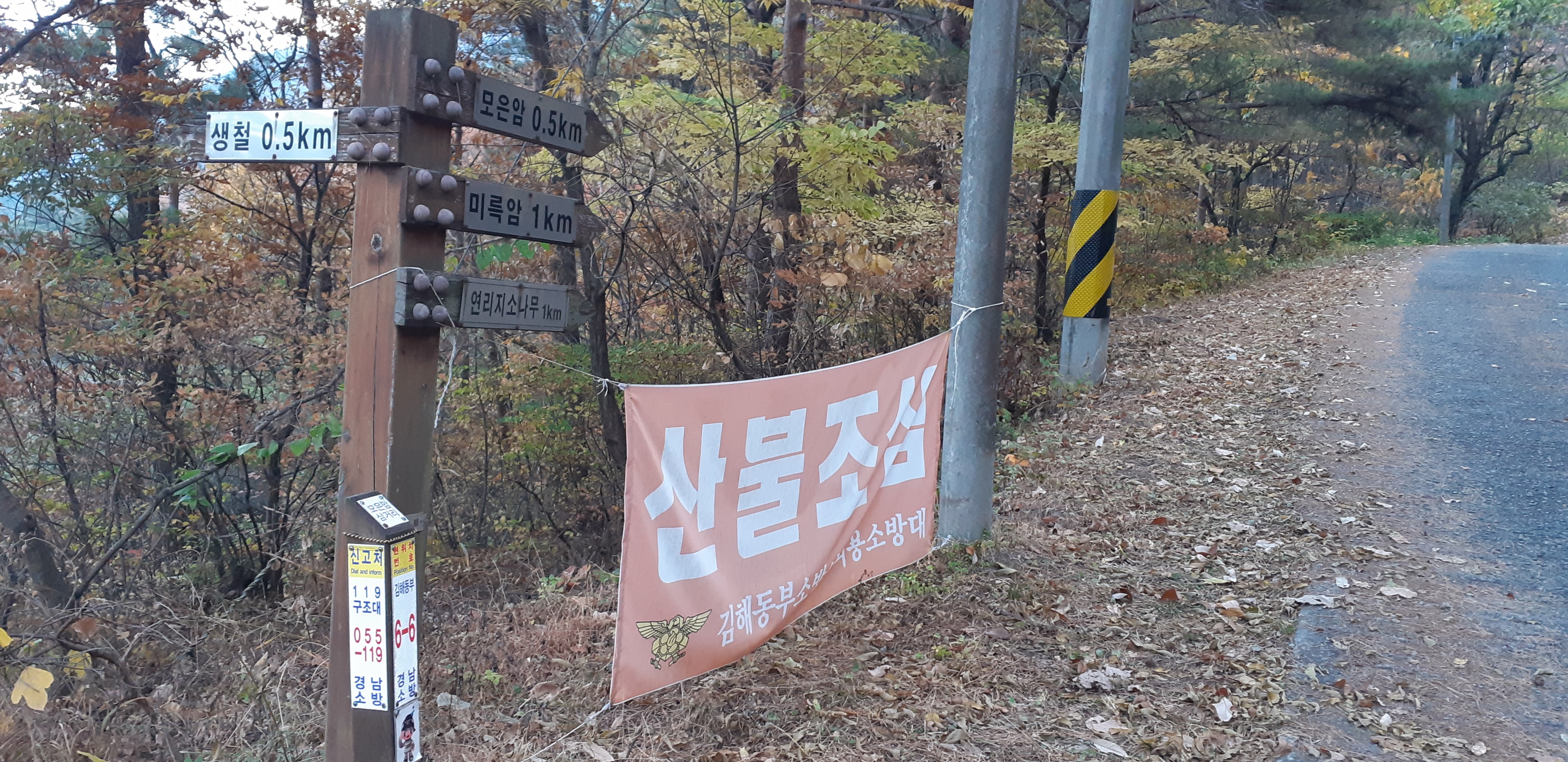 생철리 갈림길의 이정표/모은암 방향으로 올라간다(07:25)