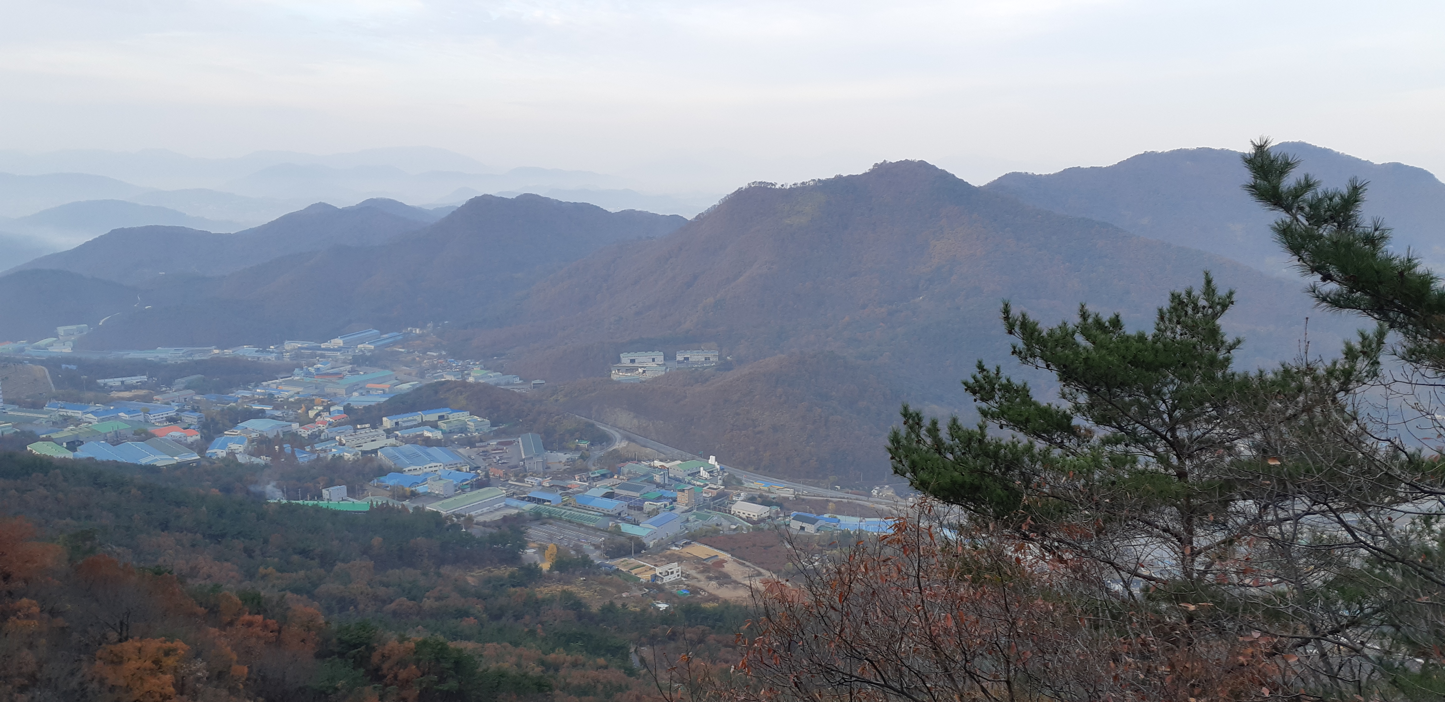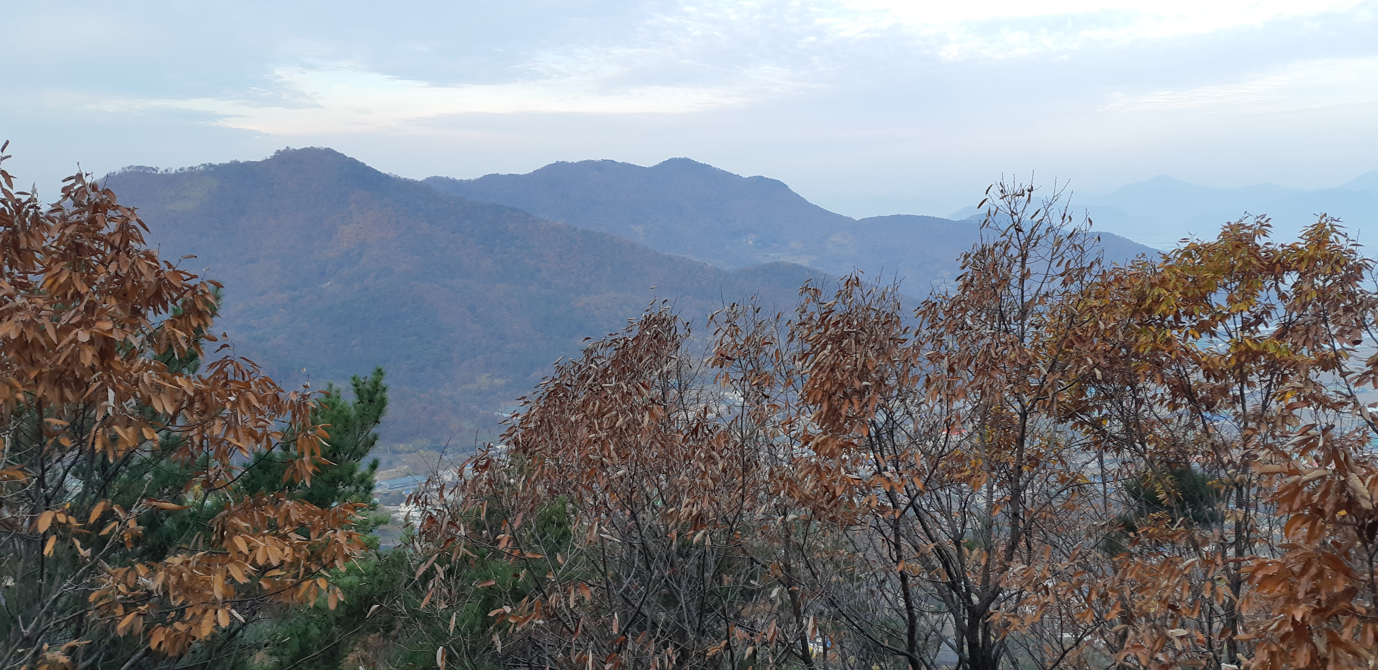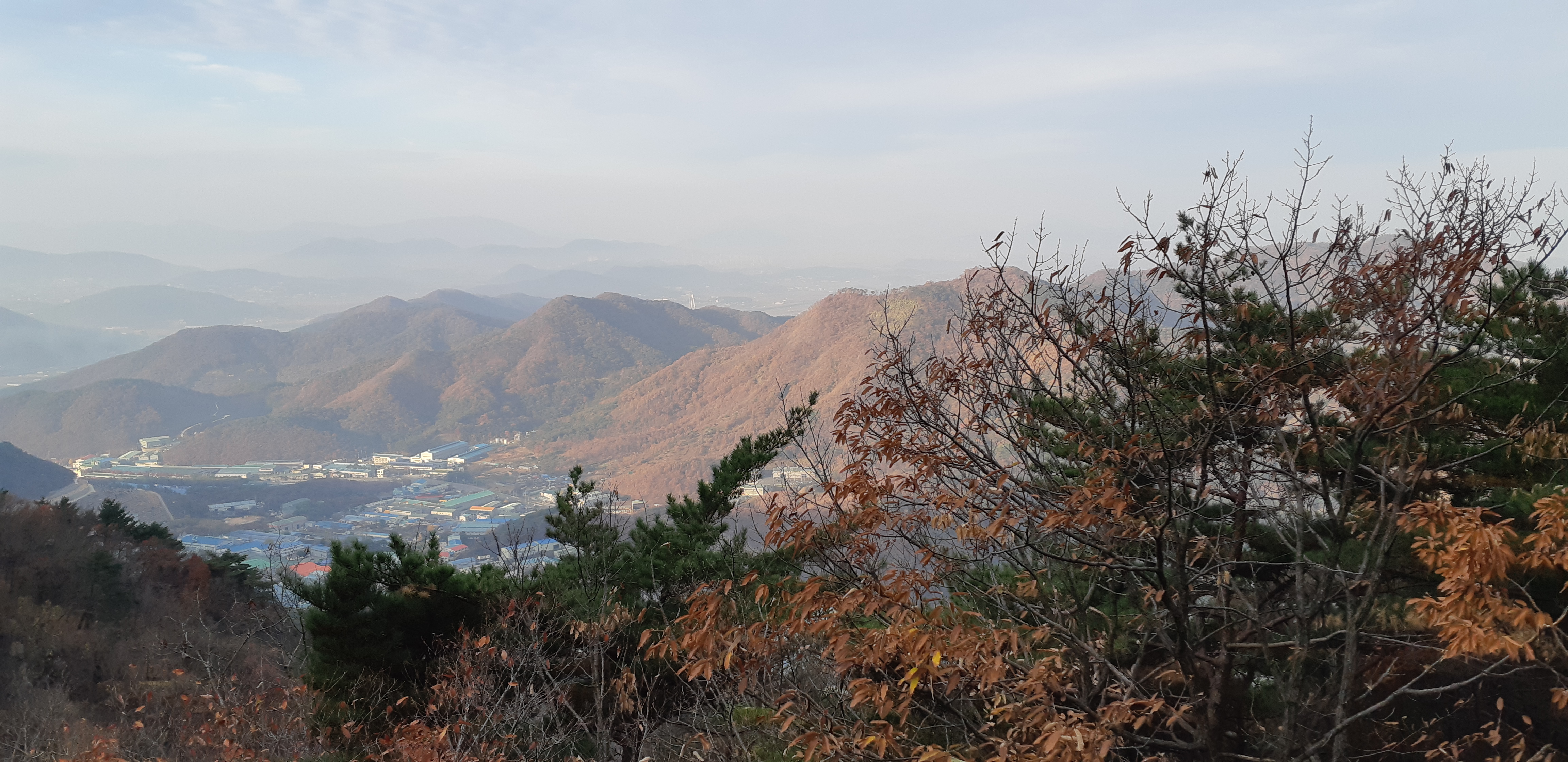생철리 너머로 멀리 진영읍 소재지가 희미하게 조망된다(08:15)