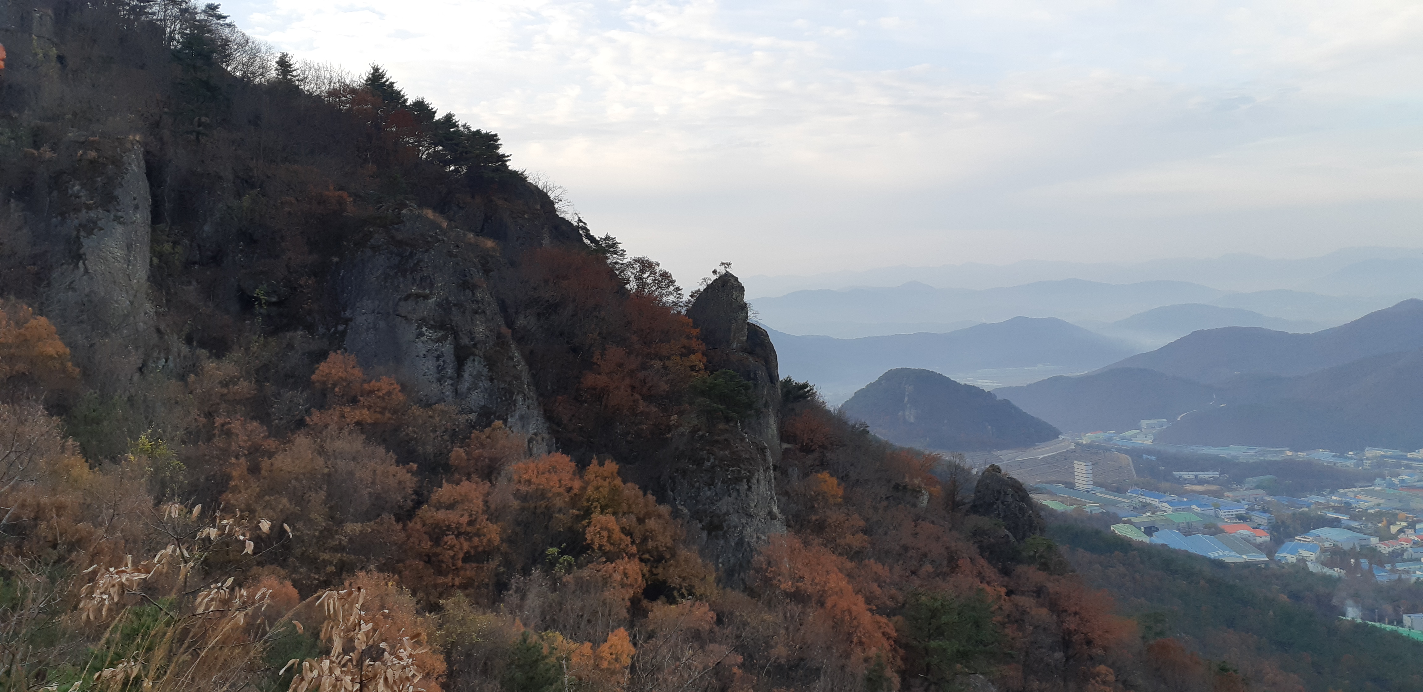 무척산 오름길의 기암과 오른쪽 생철리(08:02)