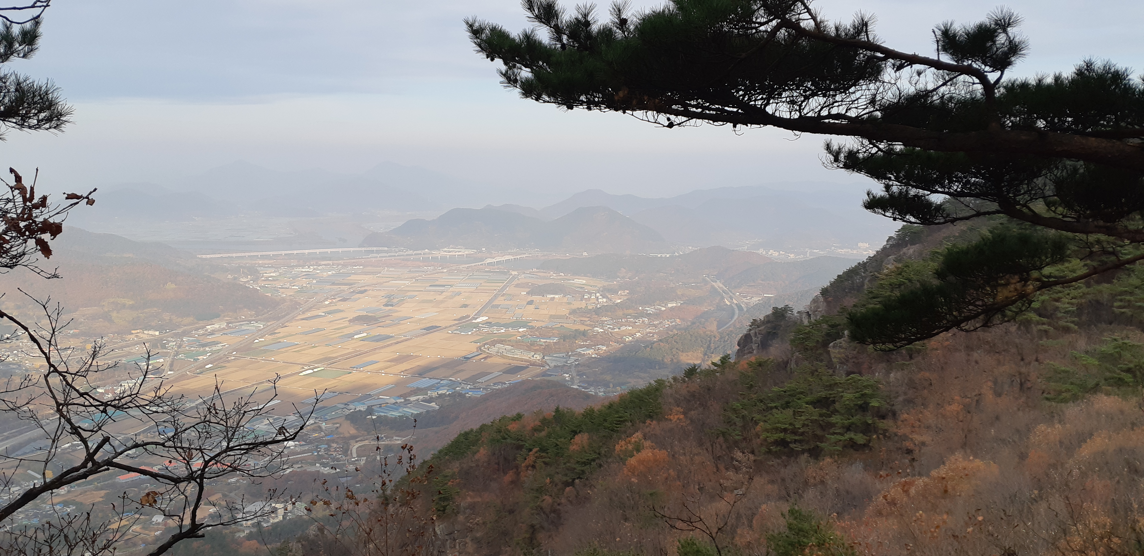 천지 폭포 위 전망대에서 바라본 생림면 마사리 들판뒤로 낙동강이 흐르고 낙동강 철교와 삼랑진교가 보인다(08:27)
