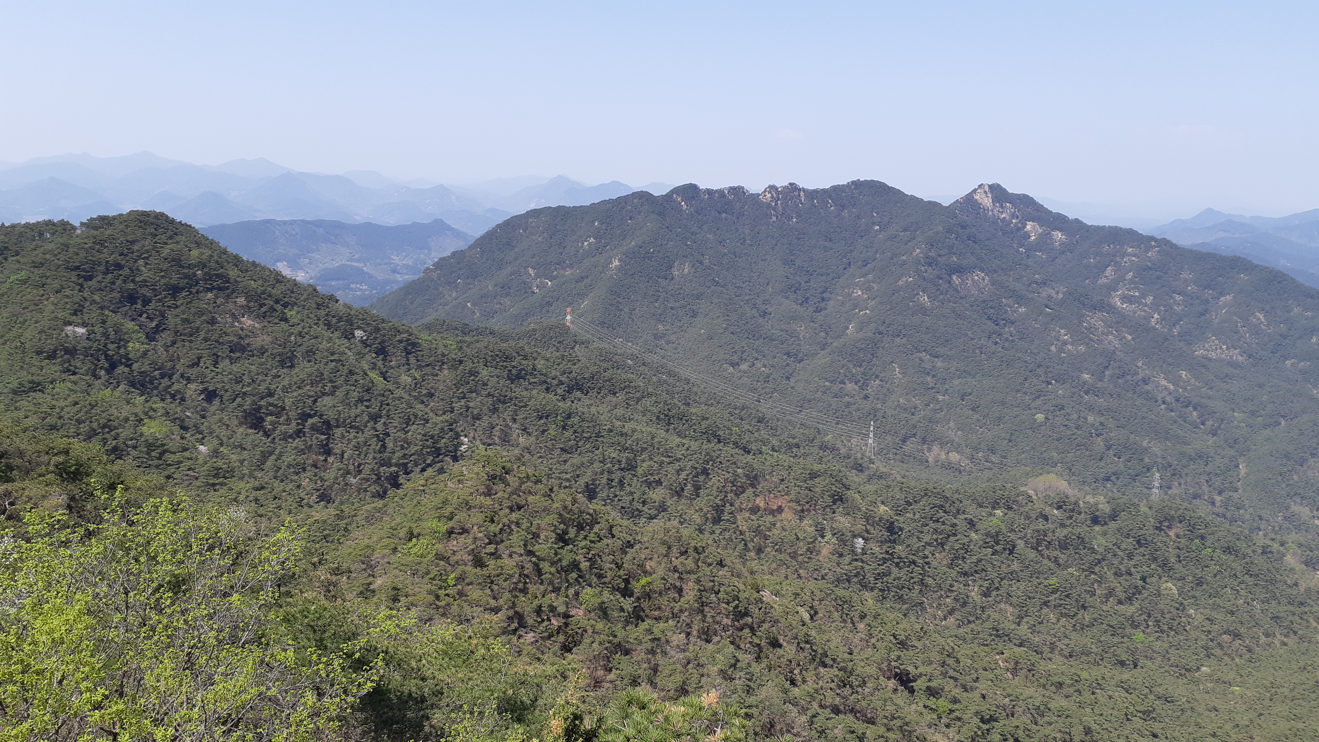 지나온 능선들로 오른쪽 부터 문덕봉~고정봉으로 이어지다 그럭재 안부로 뚝 떨어졌다 다시 올랐다(13:50)