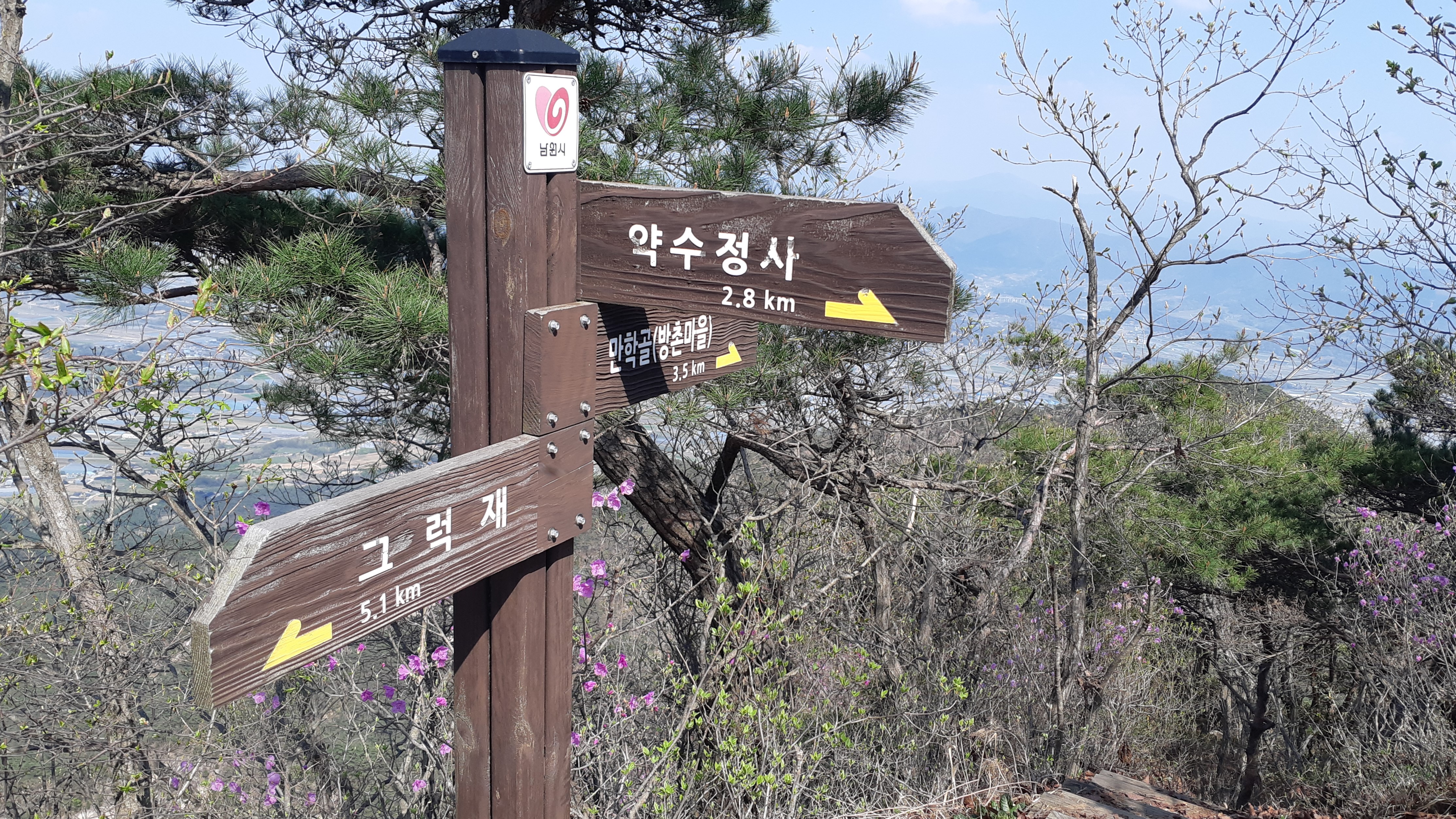 만학골 갈림길의 이정표/이곳에서 천황지맥은 상귀3가로 향하고 왼쪽 만학골로 내려간다(15:13)