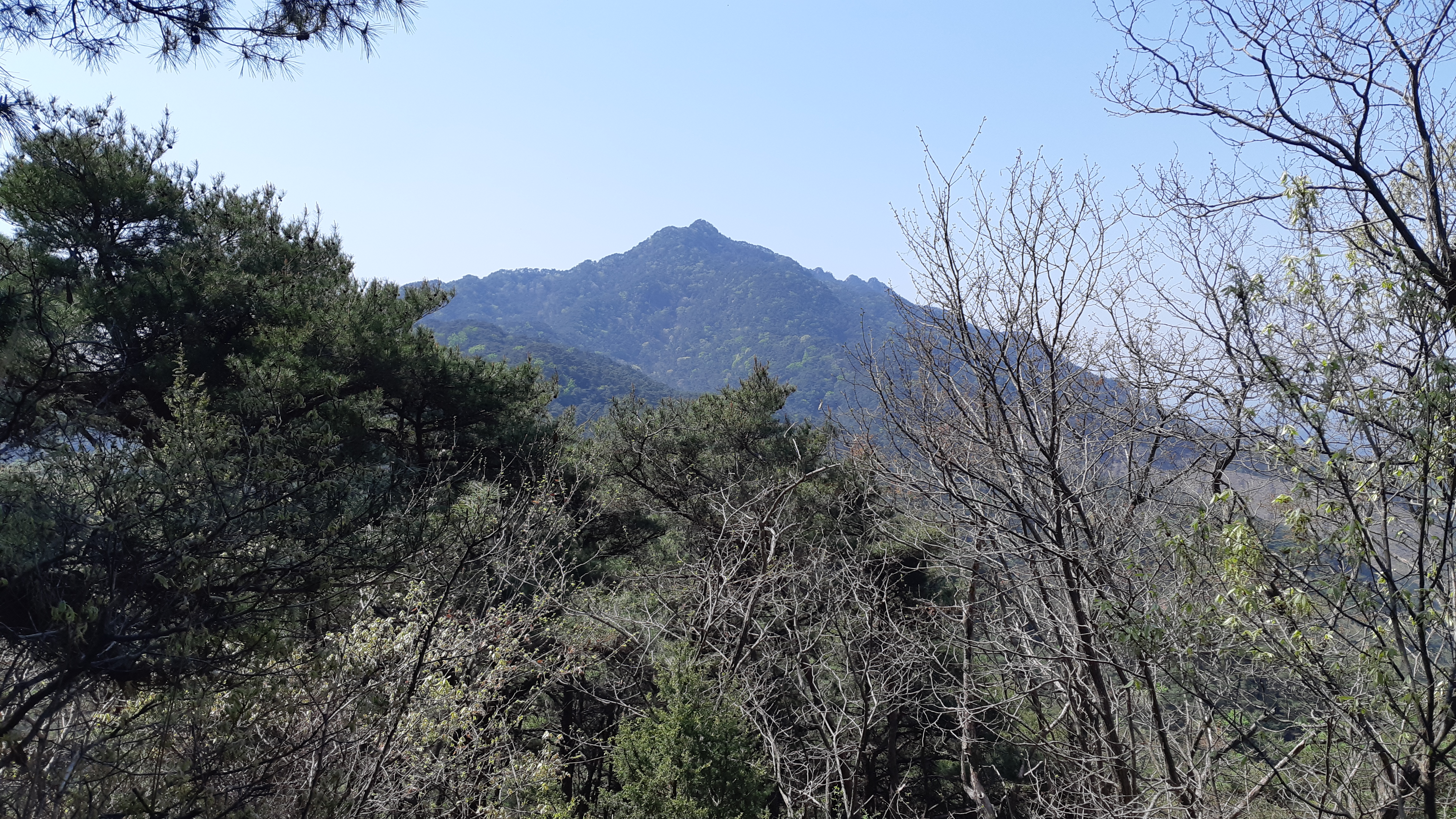 나뭇가지 사이로 오늘 가려는 앞쪽 문덕봉에서 왼쪽의 고리봉까지 조망된다만 과연 멀고도 멀게 보인다(10:33)
