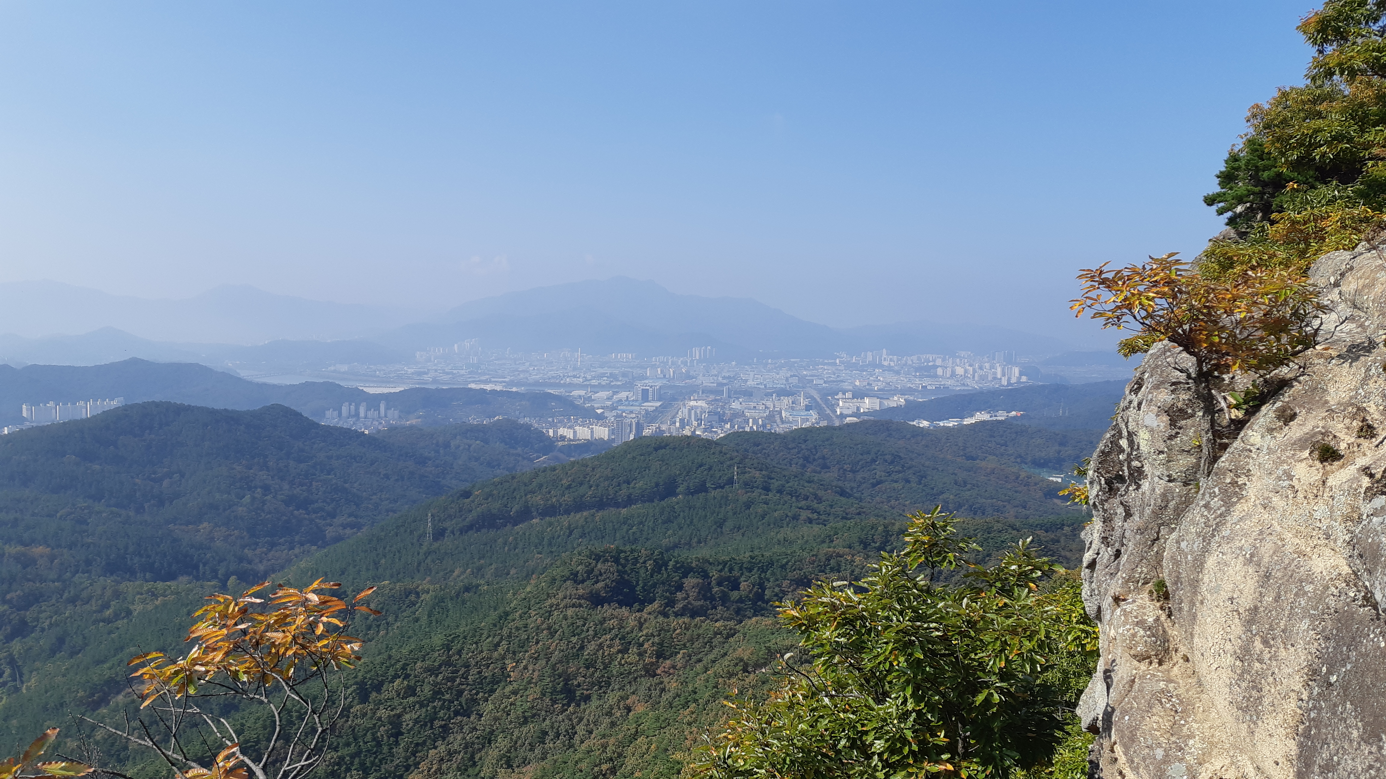 미덕암 입구에서 내려다본 구미시가지와 금오산(11:31)