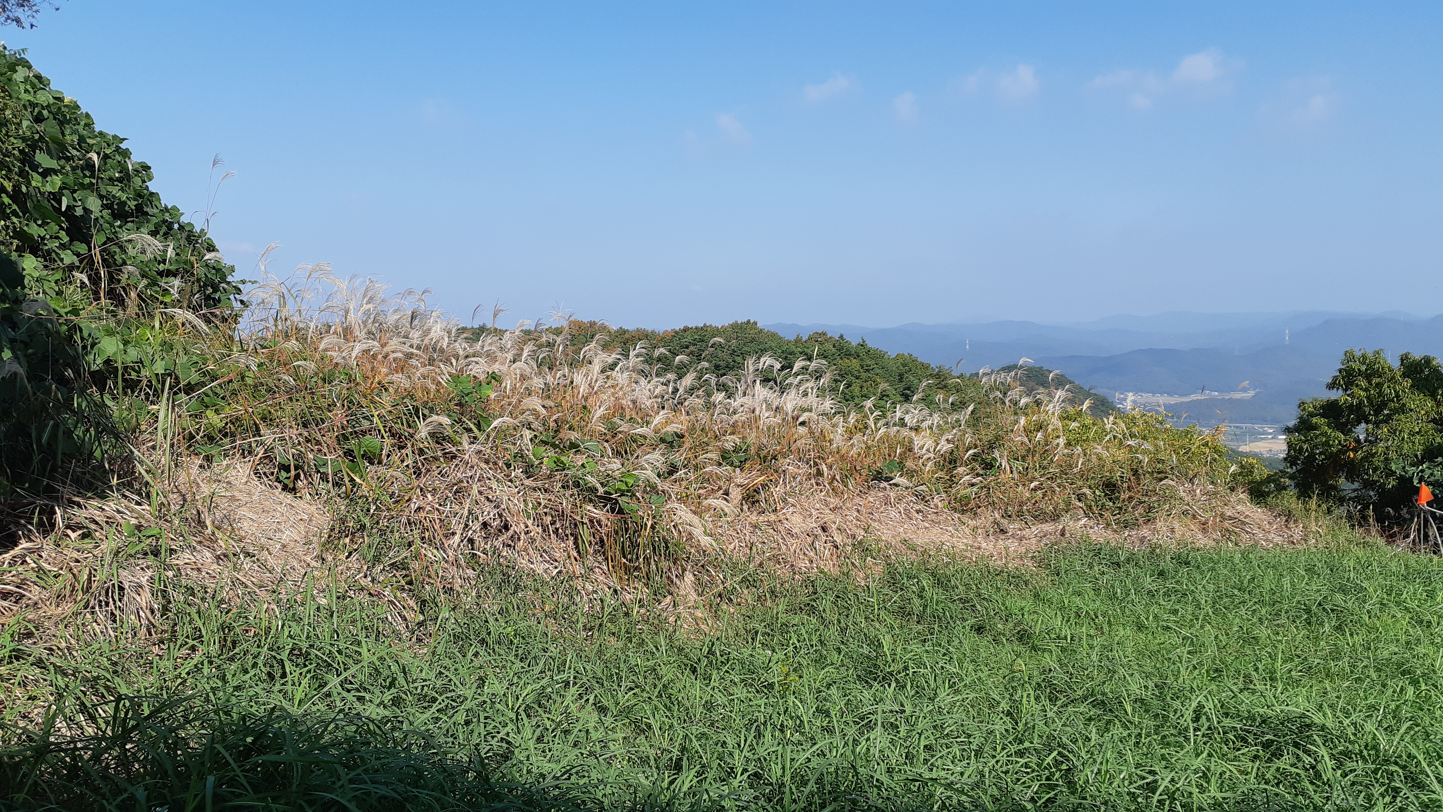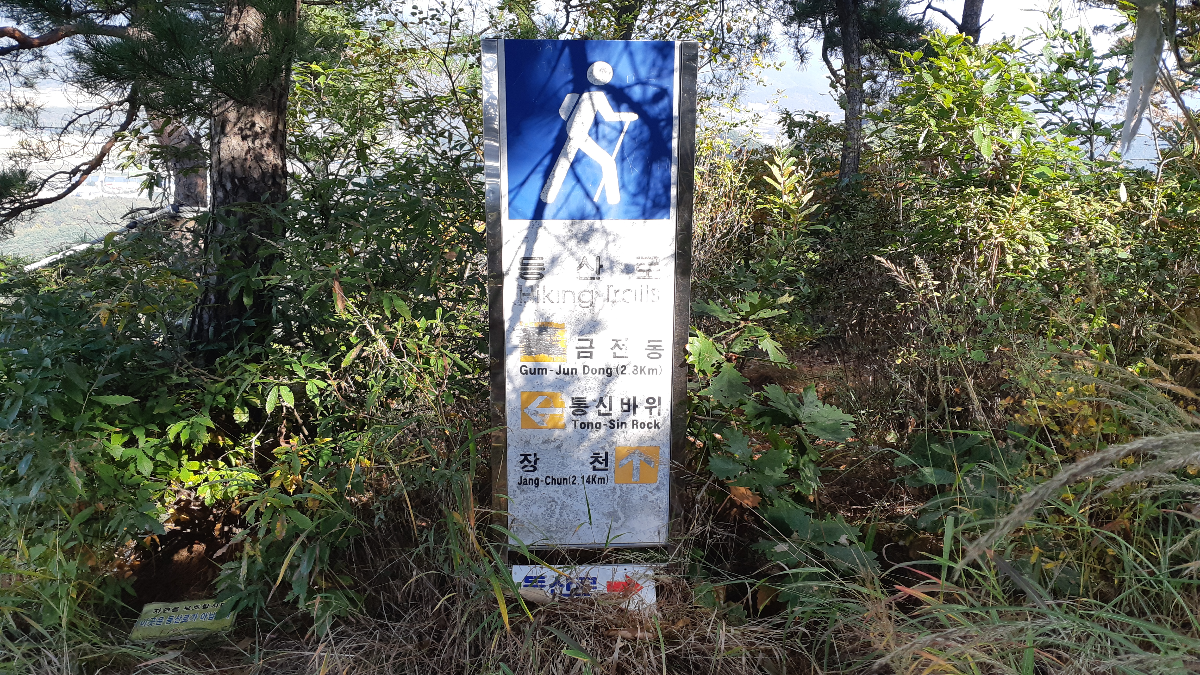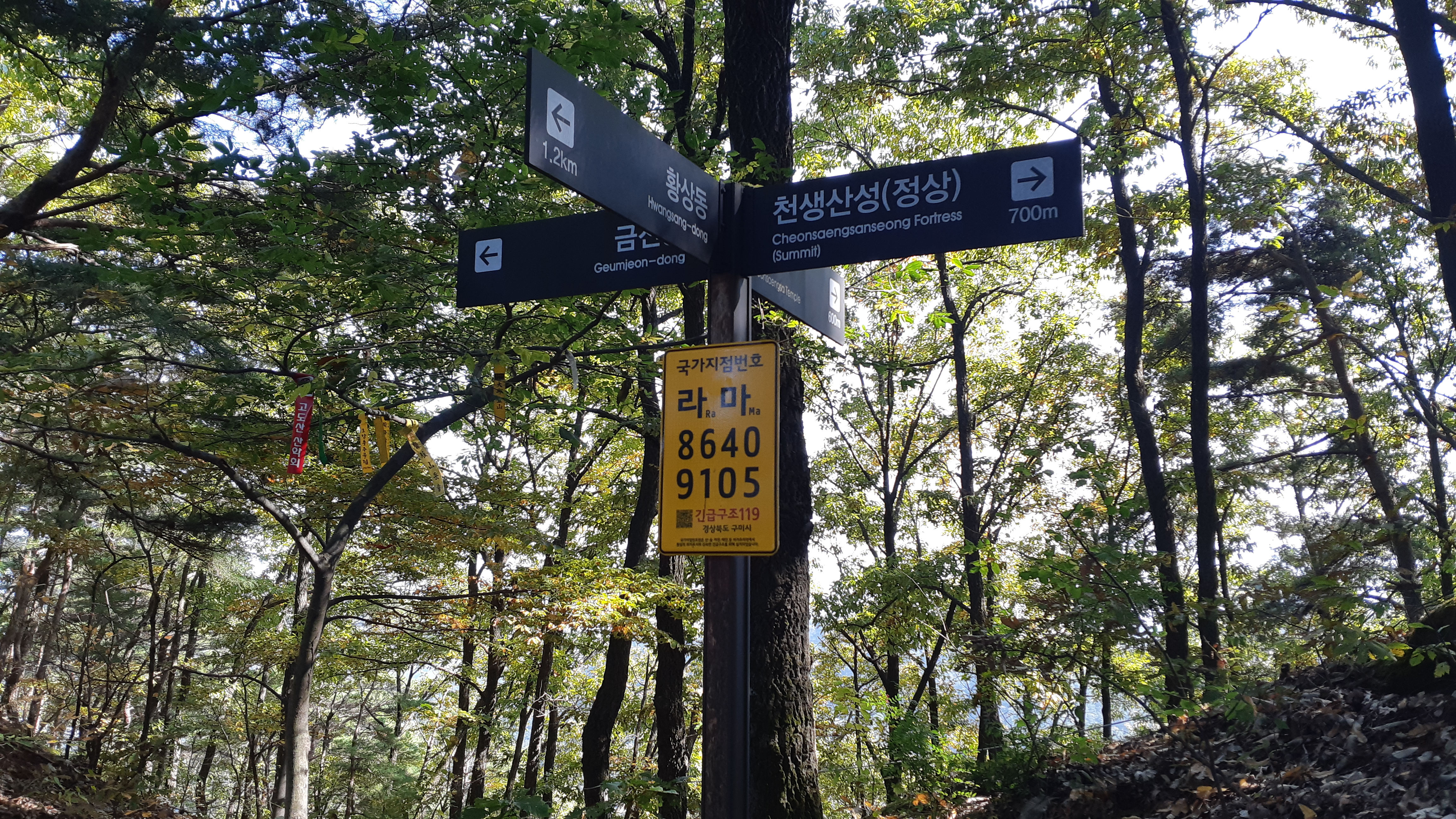 천생산성 유래비에서 잠시 진행하면 헬기장을 만나고 주위에 조망이 트이는 의자에 앉아 매실주를 반주삼아 점심식사를 하고 진행한다. 천생산성과 안부 사거리를 지나 통신바위 인근에 들렀다 안부로 되돌아온다. 산 사면을 돌아 능선에 닿고 소나무가 빼곡하게 에워싼 편안하고 완만한 능선길로 내려간다. 한동안 진행하면 송전탑과 묘지를 지나면 한태재다. 이곳에서 왼쪽으로 꺾어 내려가면 금봉타운이고 이내 구미정보고다. 시내버스가 보여 타려니 아래쪽 승강장에서 타야 된다고 한다. 시내버스를 환승하고 이어지는 새마을호로 부산에 도착한다.