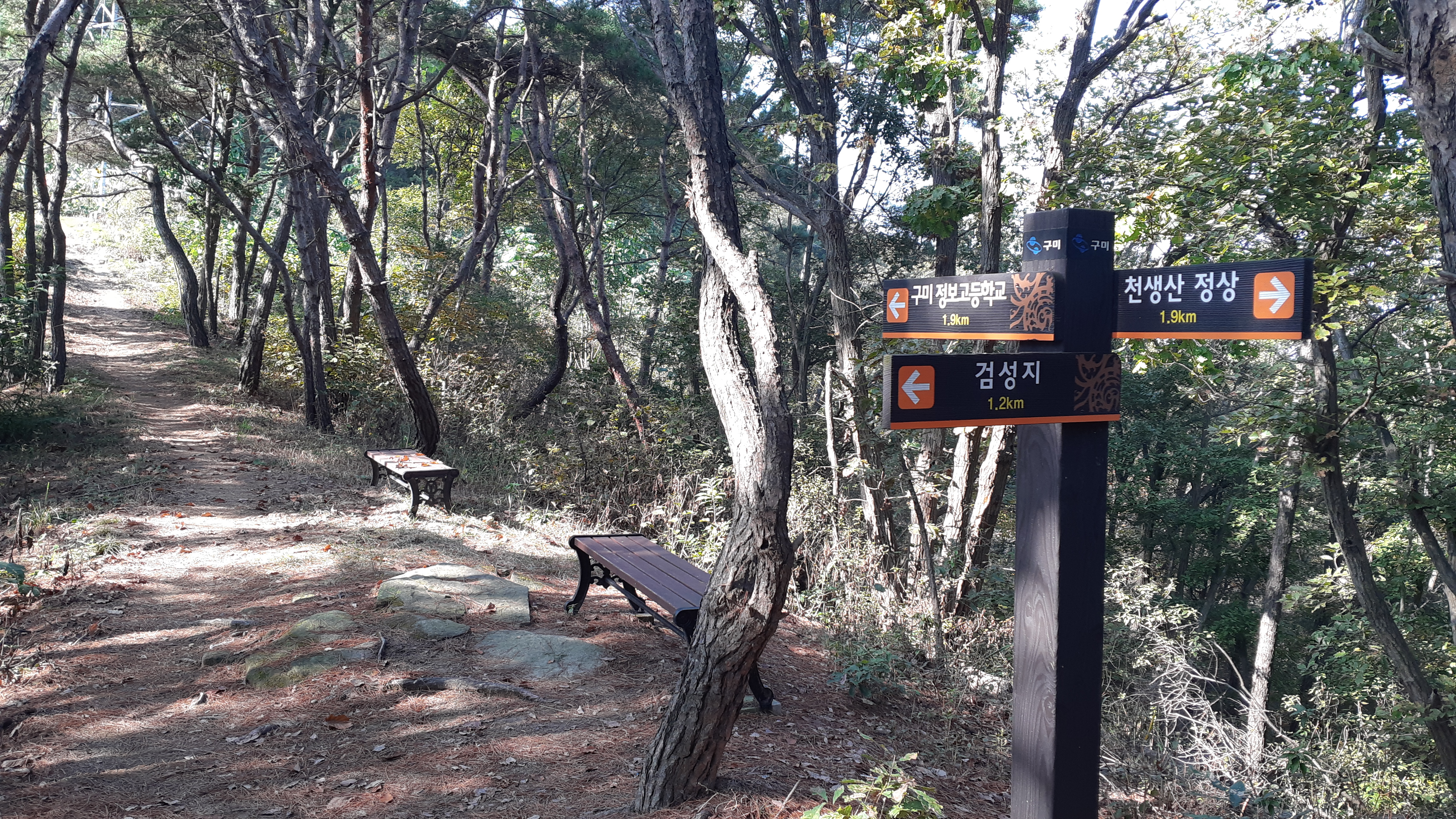 오늘은 홀로 대중교통을 이용하여 구미의 천생산(天生山)을 다녀오려고 새벽 일찍 집을 나선다. 먼저 도시철도 4/3호선을 환승하여 구포역에 도착하여 6시51분에 출발하는 무궁화호로 구미역에 도착 인근 버스승강장에서 구미시 황상동에 도착하니 9시40분경으로 3시간이 조금 더 걸렸다. 황상동에 내려 천생산 들머리인 구미정보고까지 도보로 약20여분 걸렸다. 오늘 찾으려는 천생산은 국제신문 근교산&그너머<815>에 소개된 코스를 그대로 따라간다. 오늘 찾을 이곳 천생산은 멀리서 봤을 때 하늘 천 자로 보여서 천생산이라 부른다고 한다.