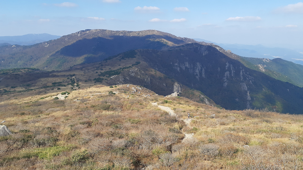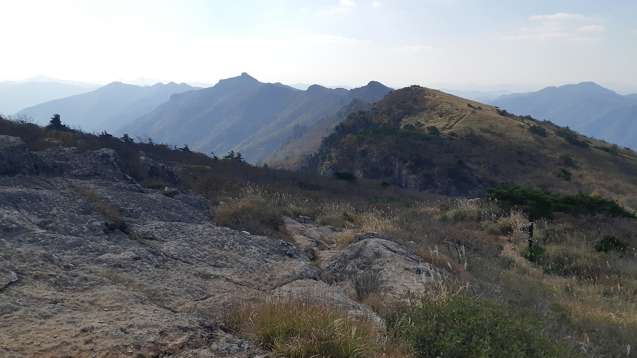 신불재/가천저수지 방향으로 신불공룡능선이 살짝 보인다(13:05)