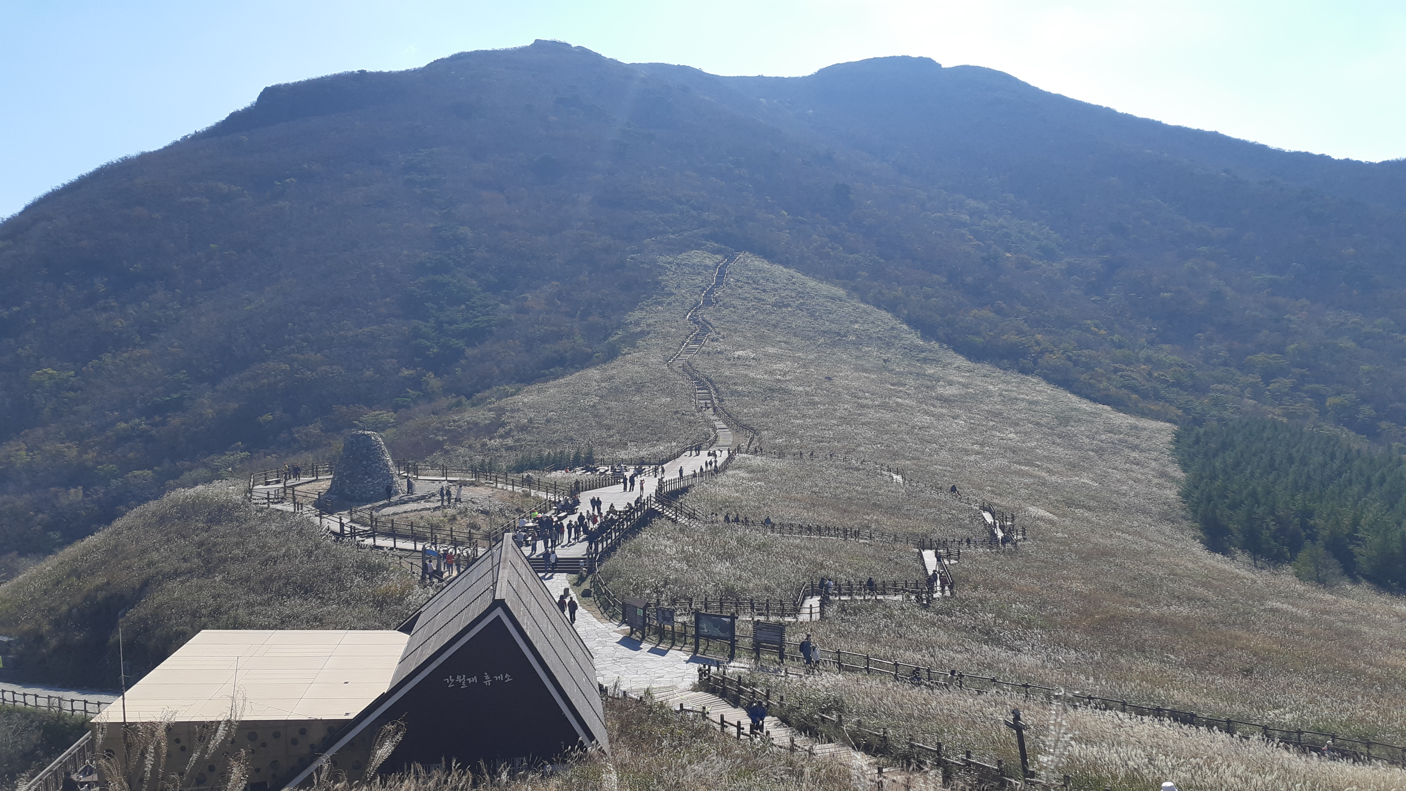 간월재의 억새평원 뒤로 신불산이 올려다 보인다(11:37)
