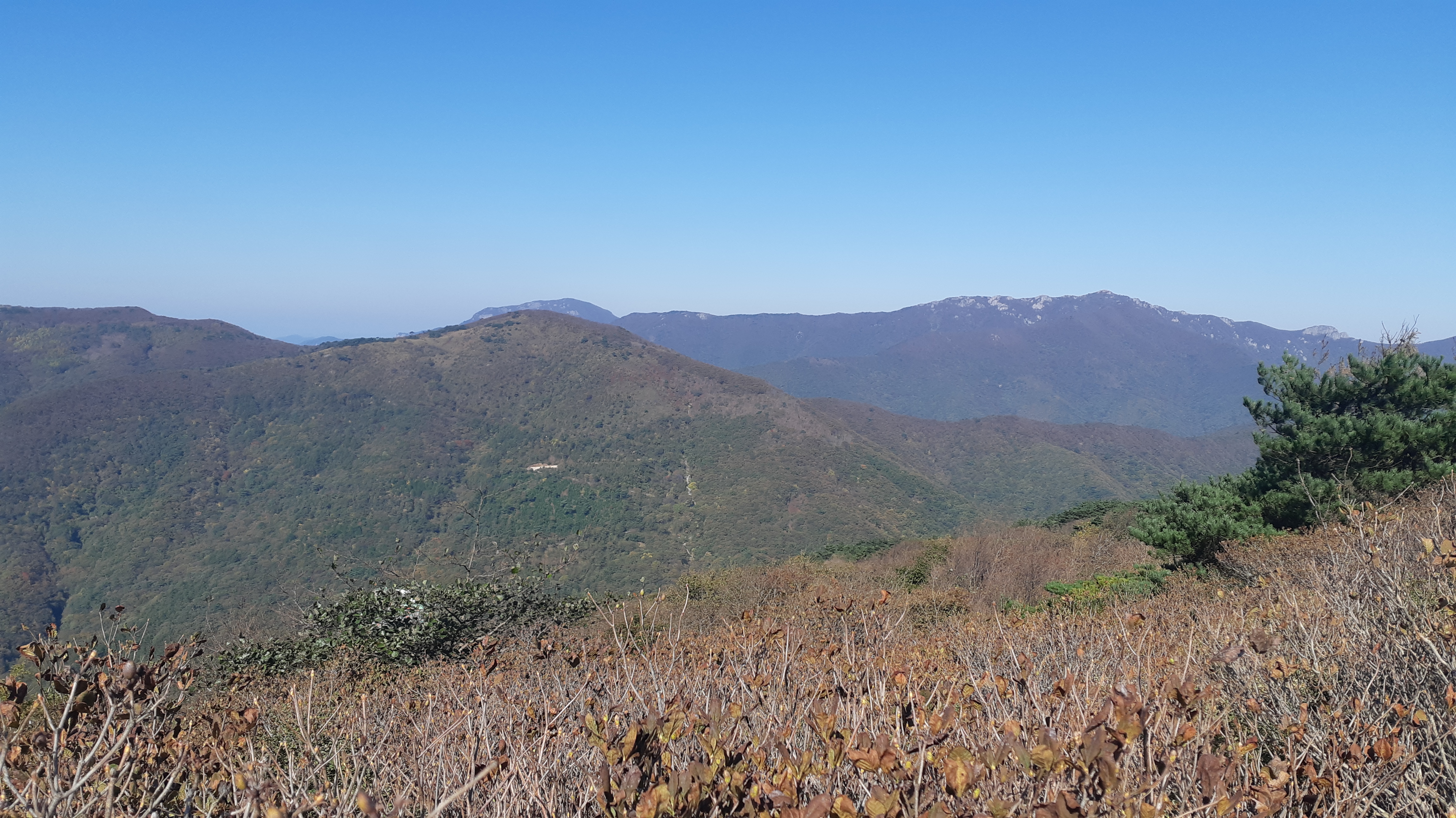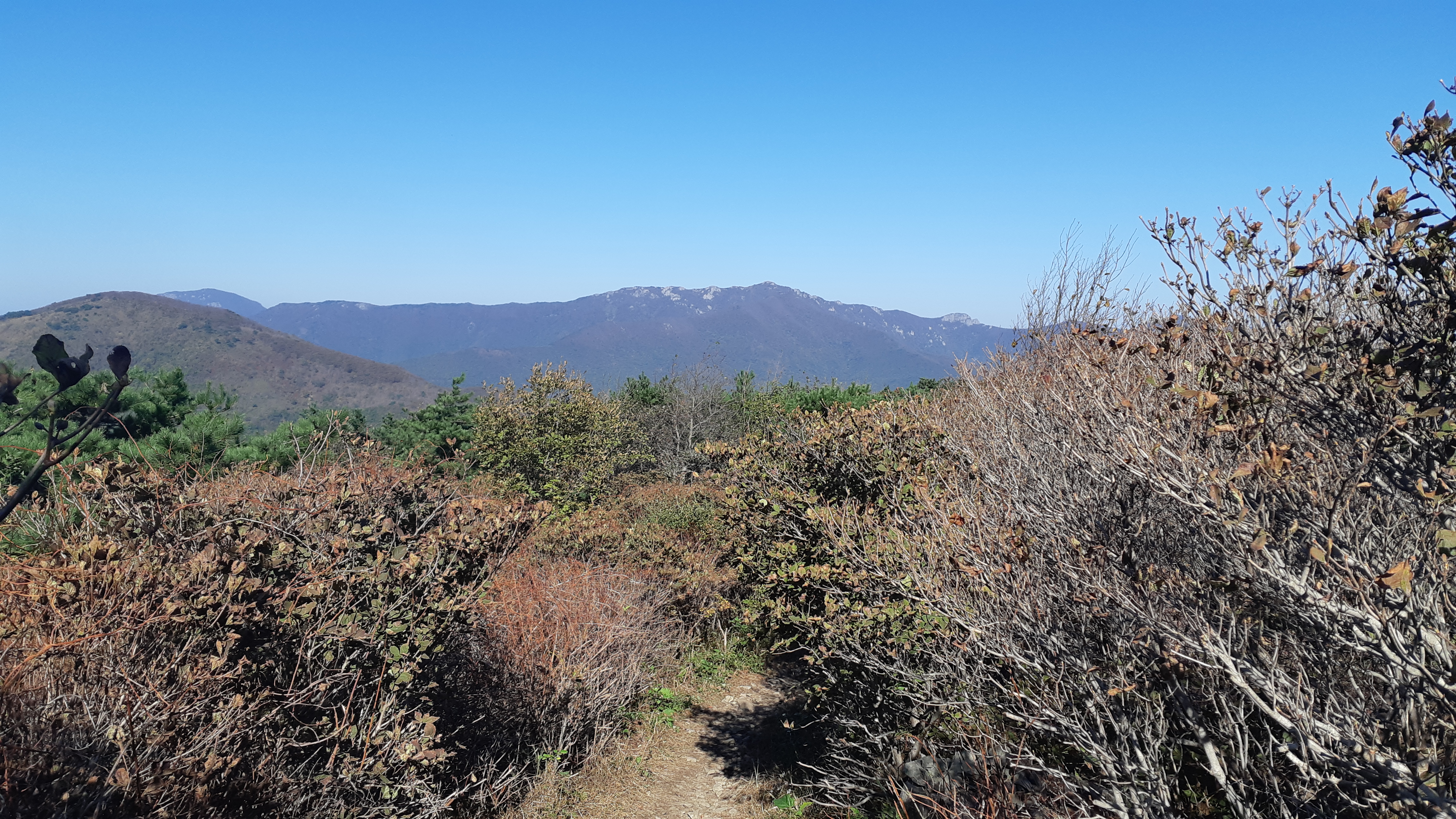 두꺼비바위 오름길에서 바라본 앞쪽 배내봉에서 밝얼산으로 이어지는 능선 뒤로 보이는 고헌산(10:44)