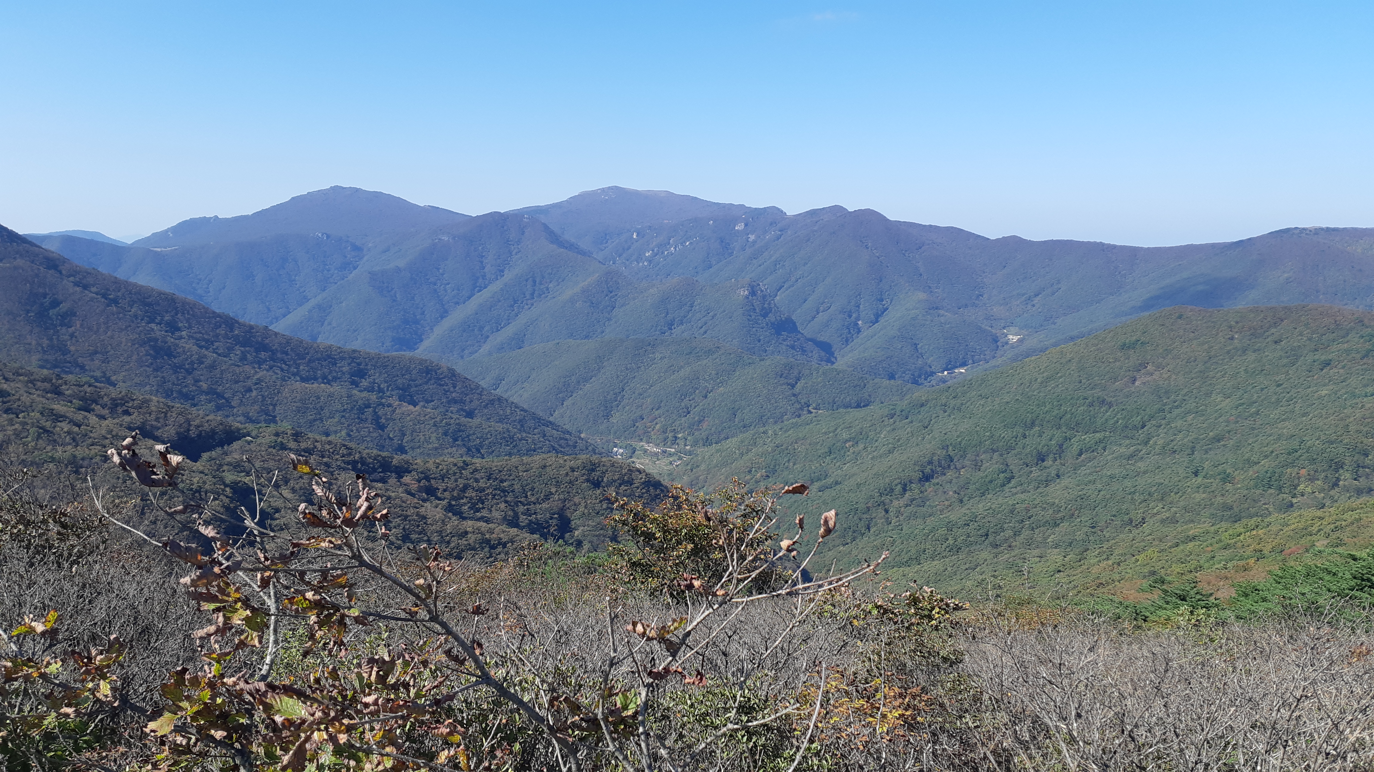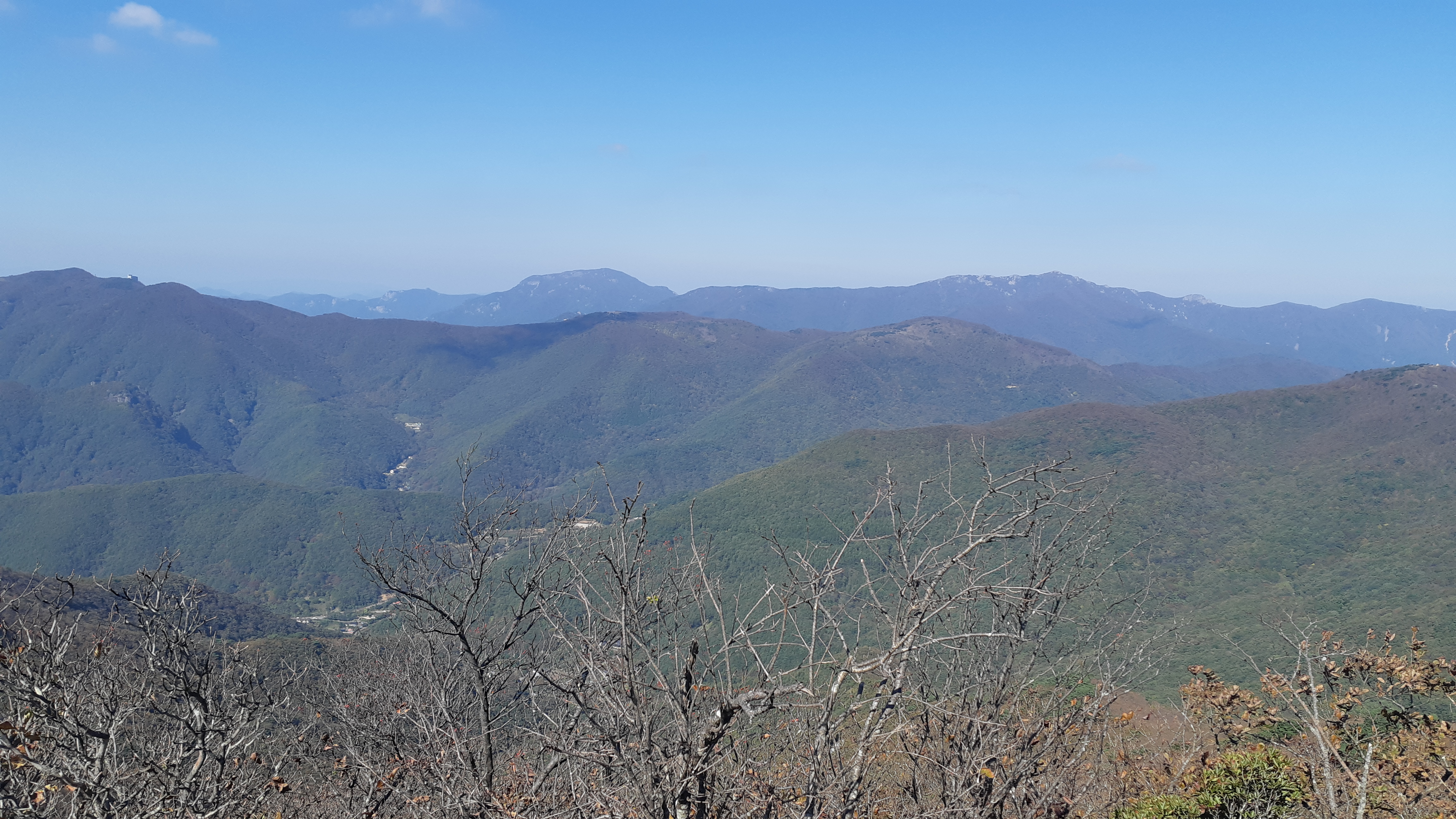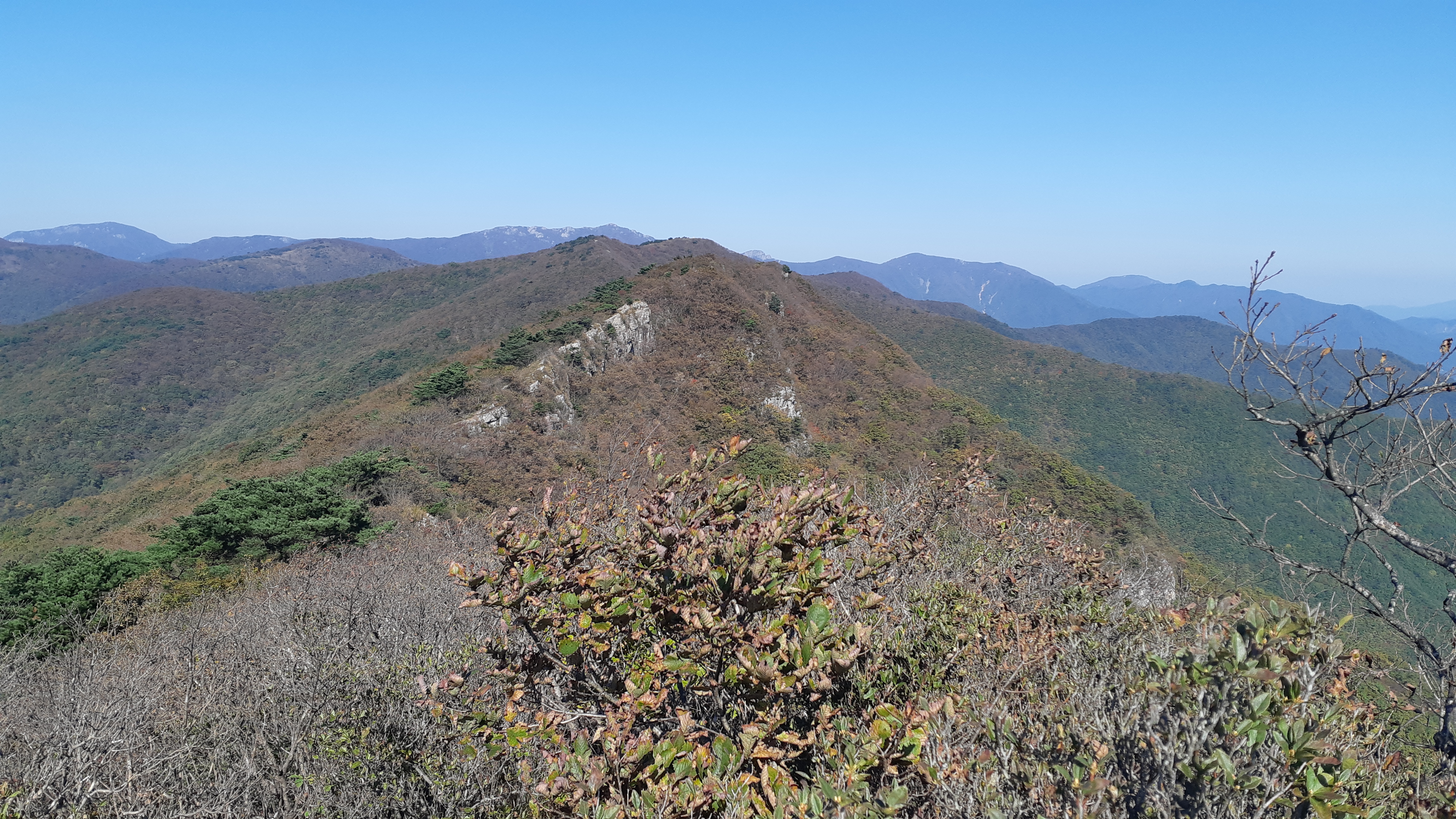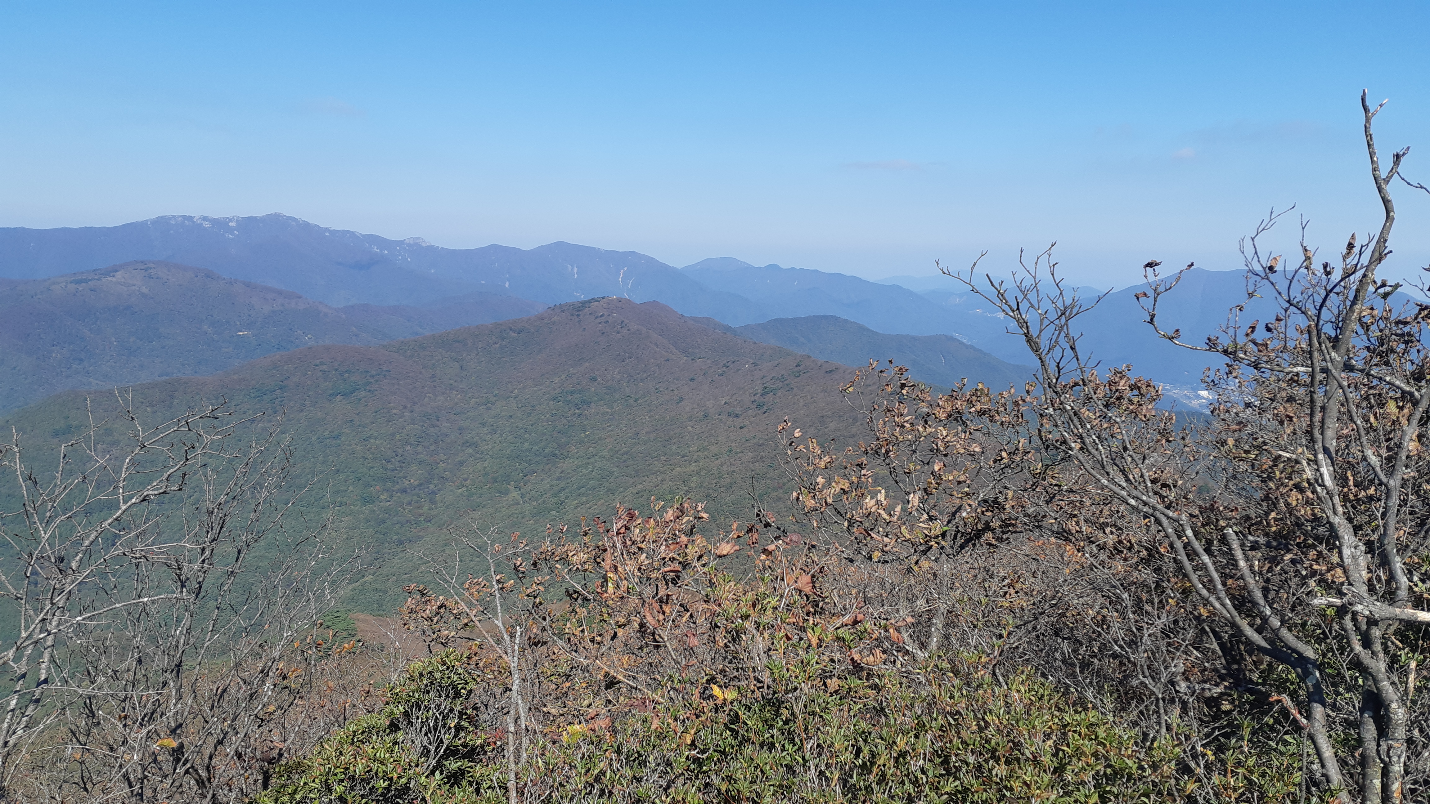간월산 정상에서 바라본 신불서봉에서 이어지는 능선과 아랫쪽 게곡에는 파래소폭포가 자리한다(11:25)