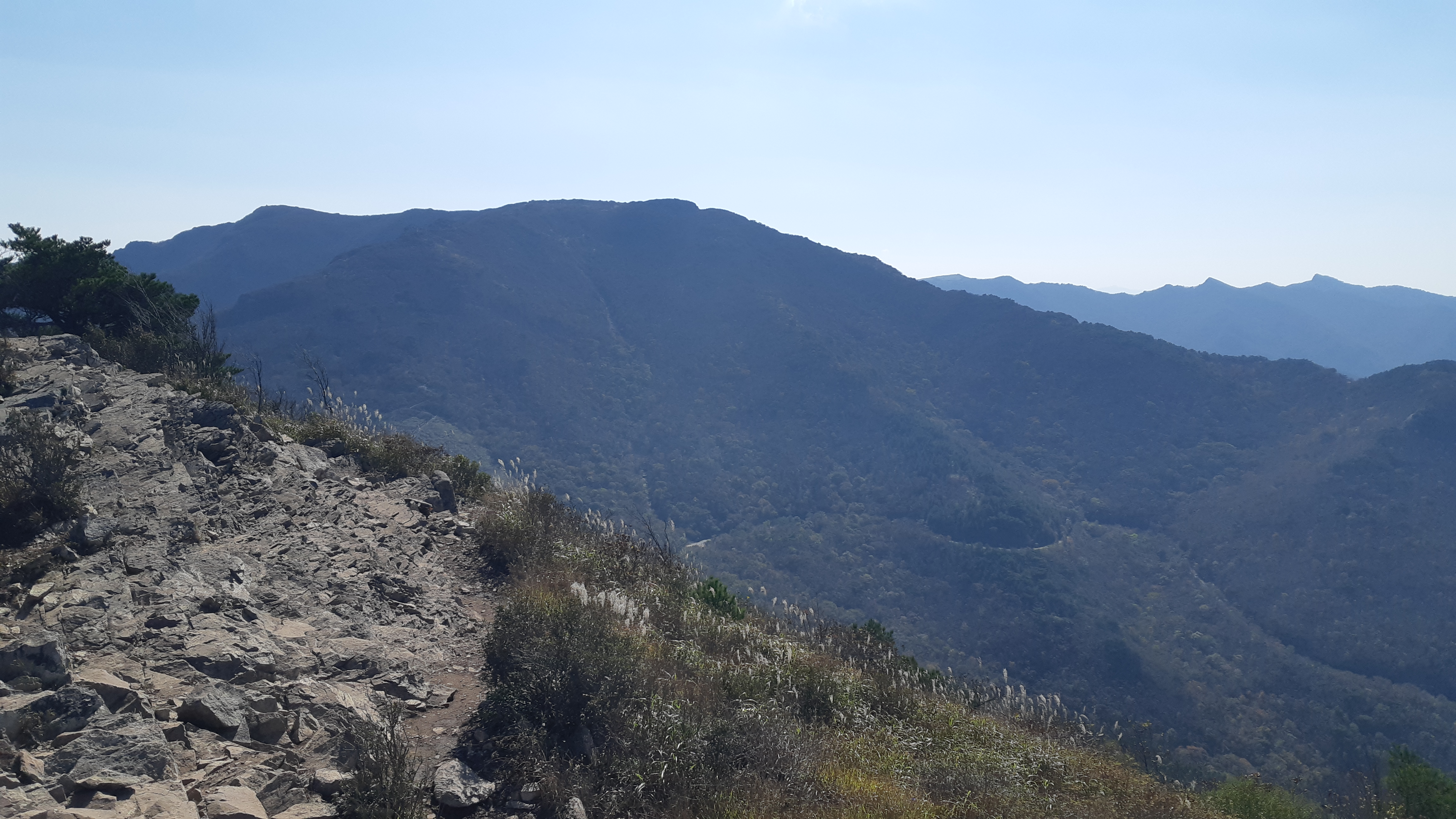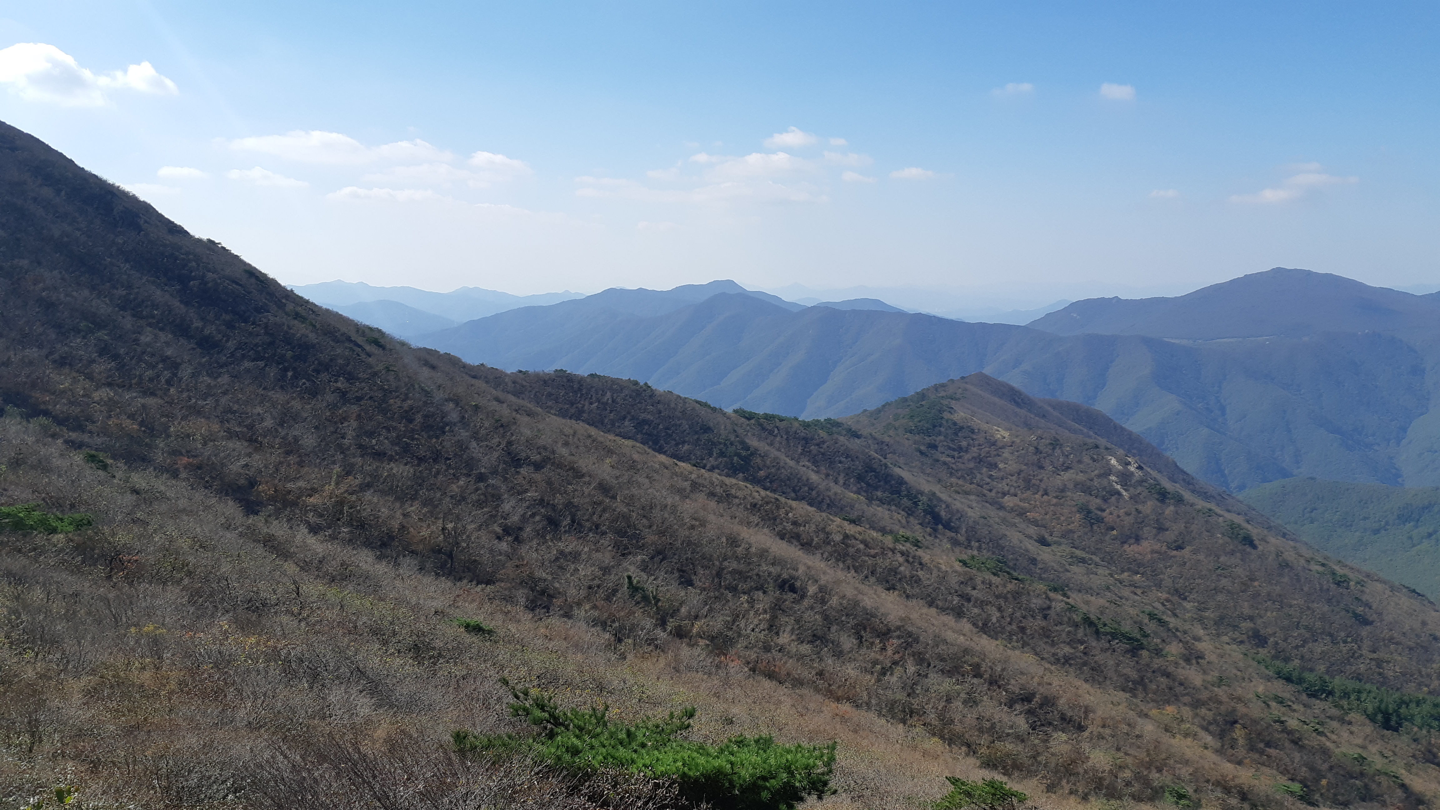 오름길에서 건너편 능동산에서 왼쪽 천황산으로 이어지는 능선이 아름답다(10:00)