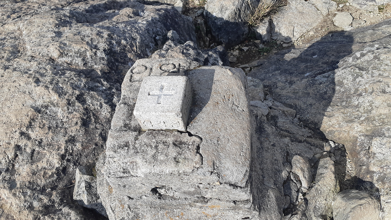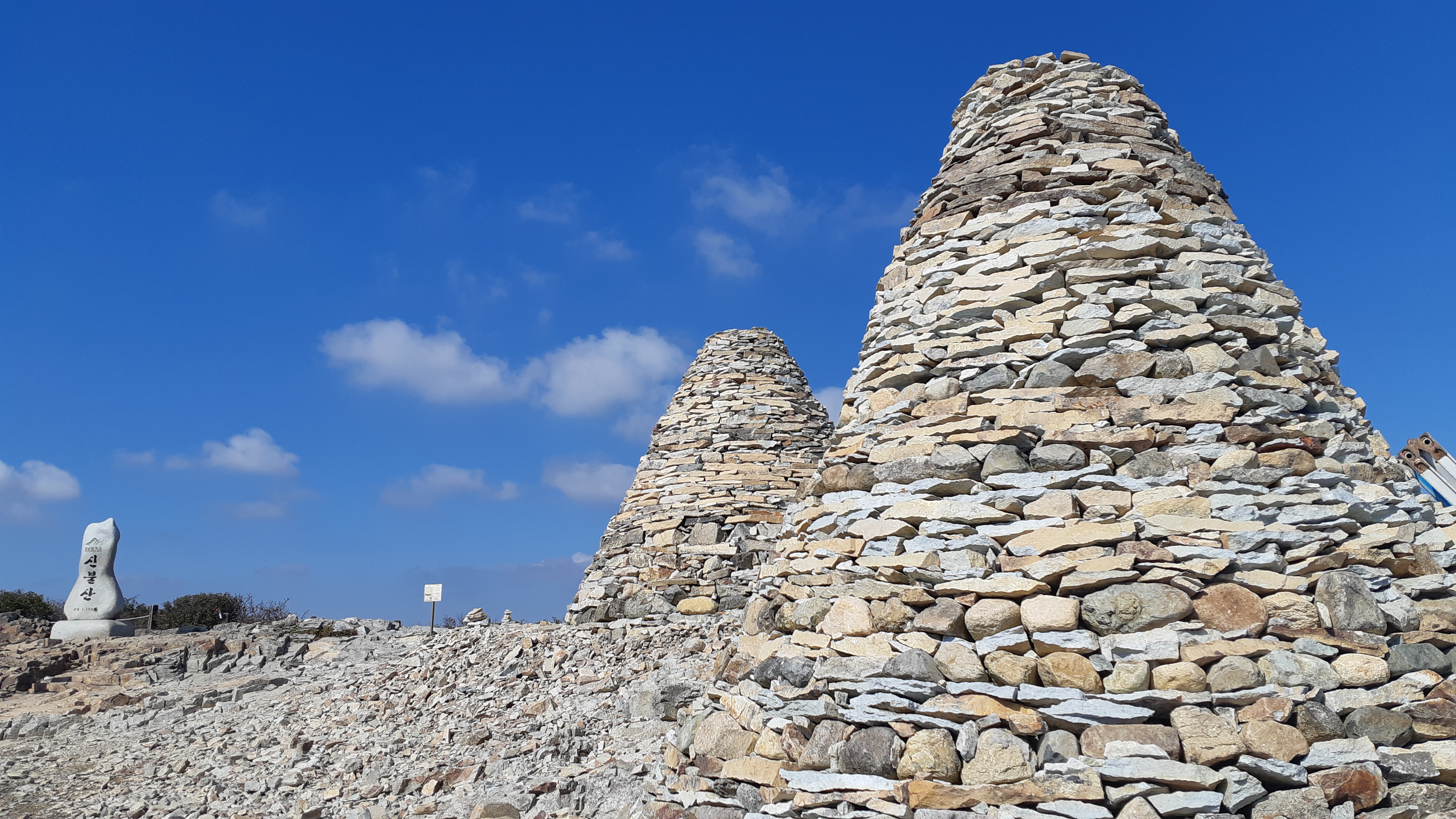 신불산 정상부/오른쪽 돌탑은 사다리를 타고 올라서서 지금도 축조중이시다(12:50)