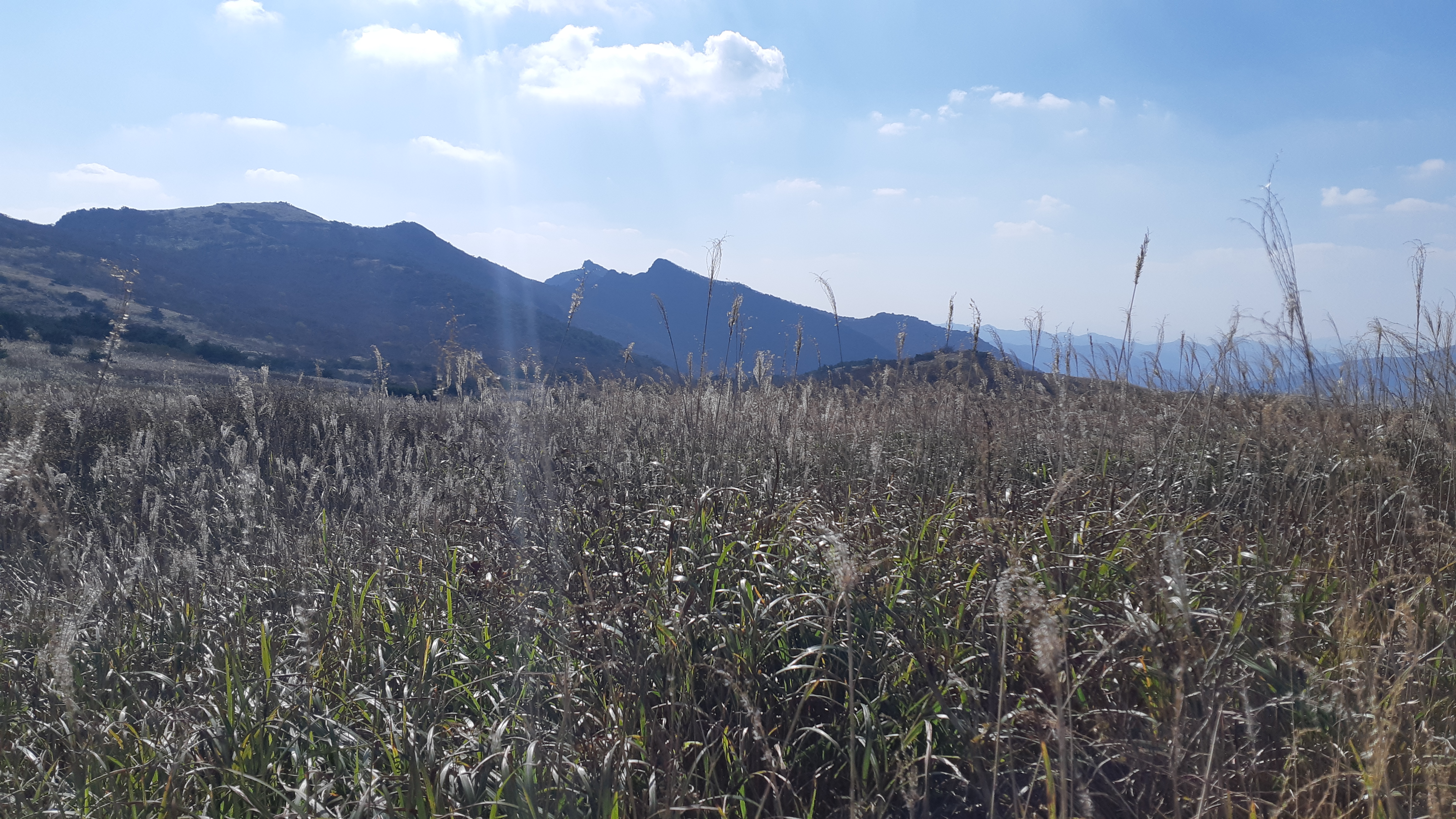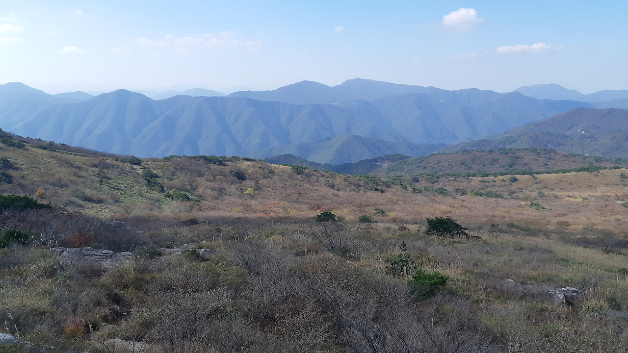 억새평원 저쪽 함박등에서 오른쪽 죽바우등으로 이어지는 영축지맥 능선(13:28)