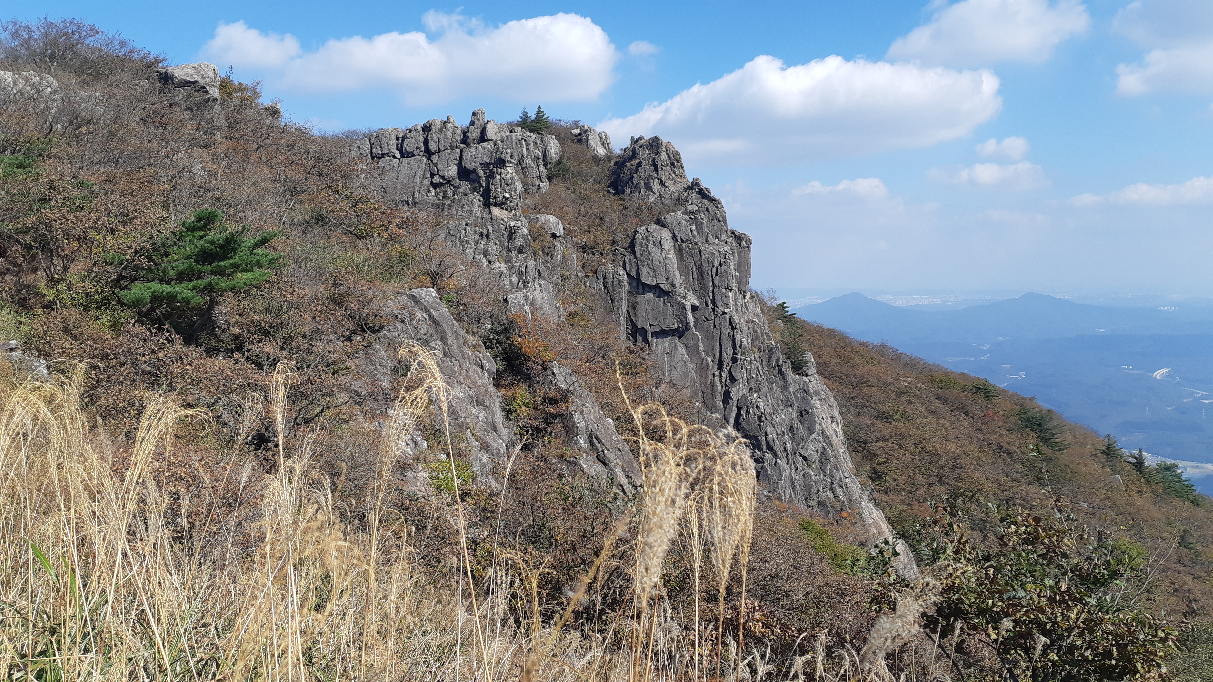 간월공룡능선 오른쪽으로 등억온천단지가 내려다 보인다(11:39)