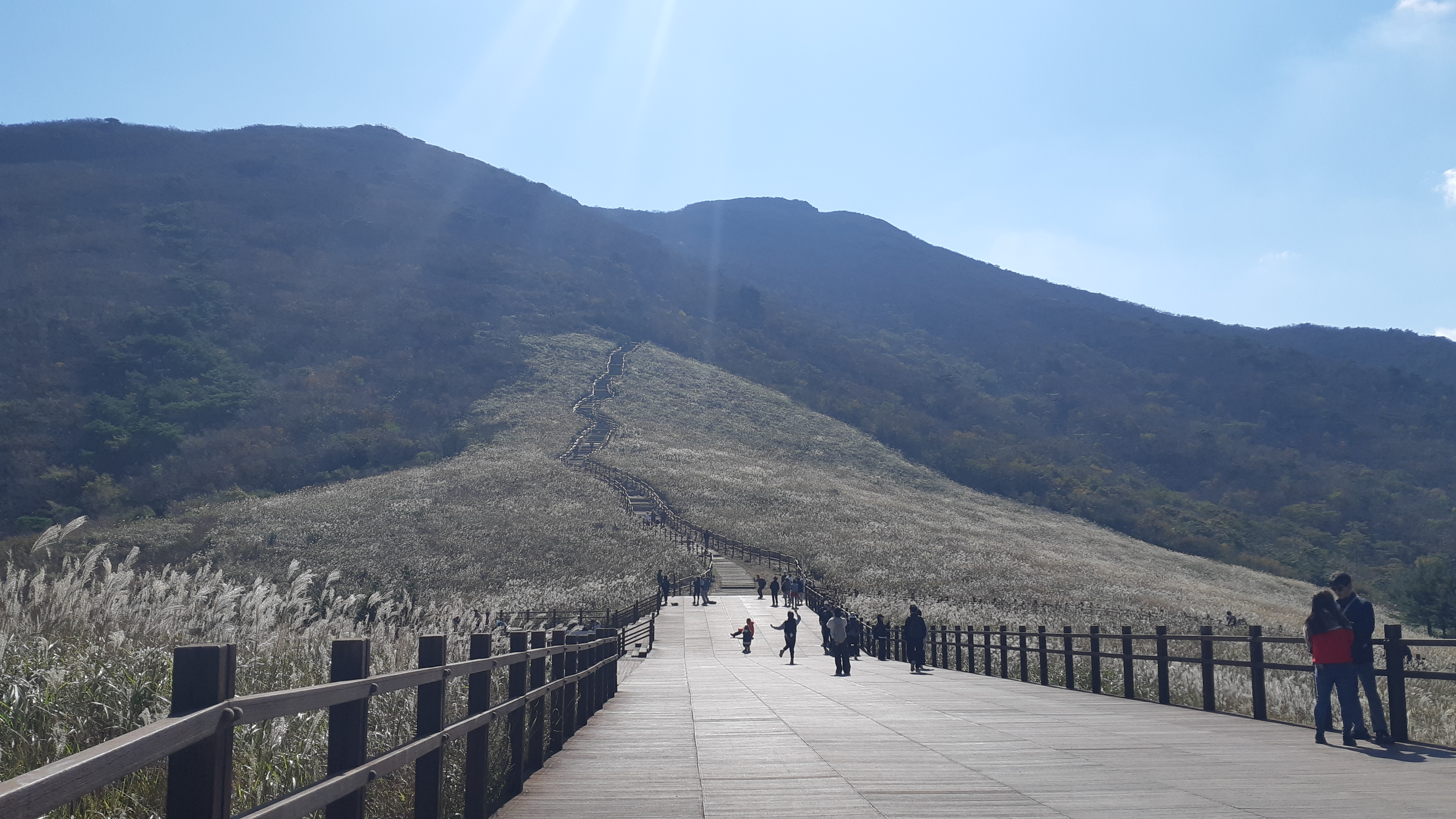 간월재의 데크시설과 뒤로 보이는 신불산 오름길(11:46)