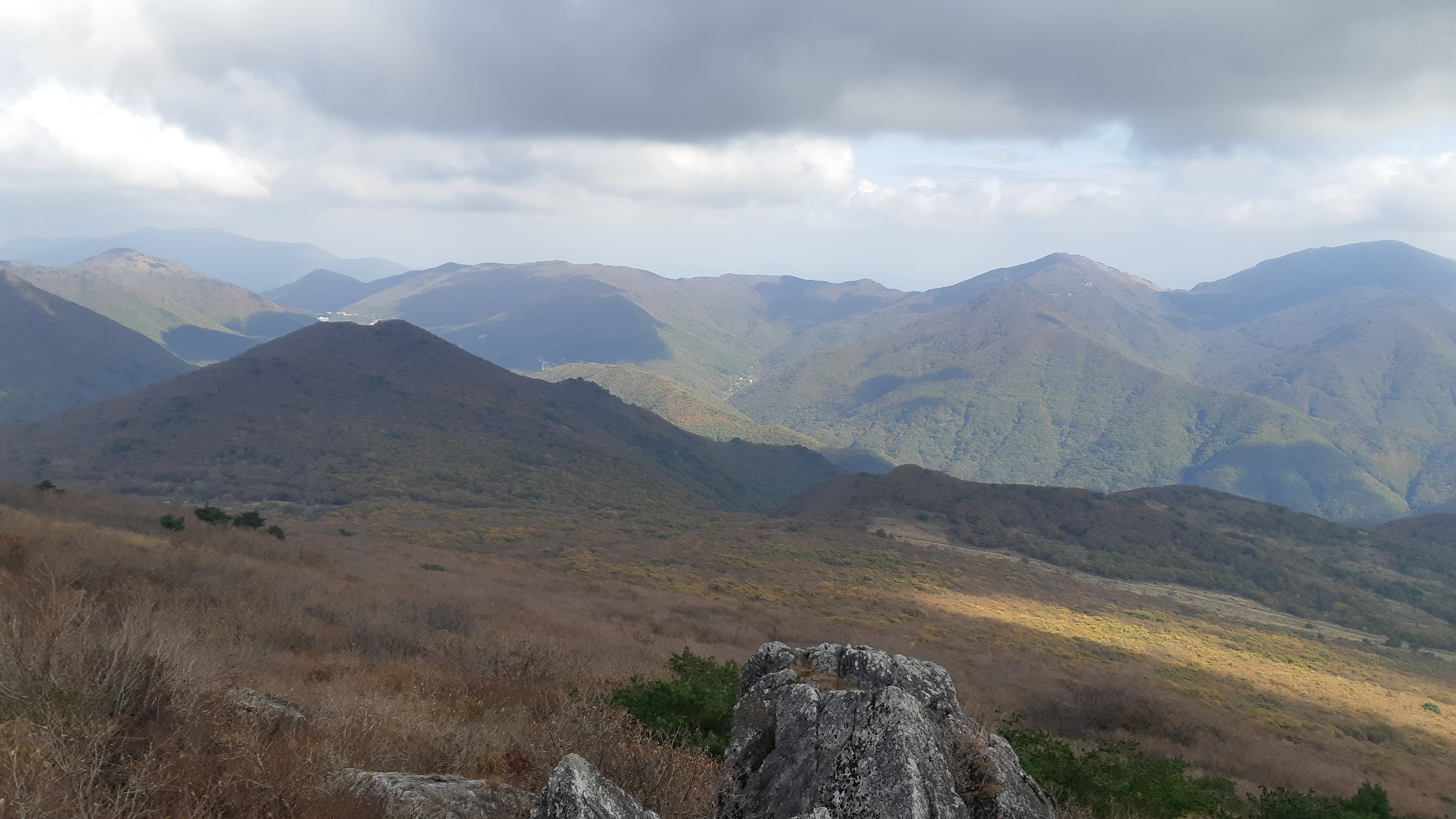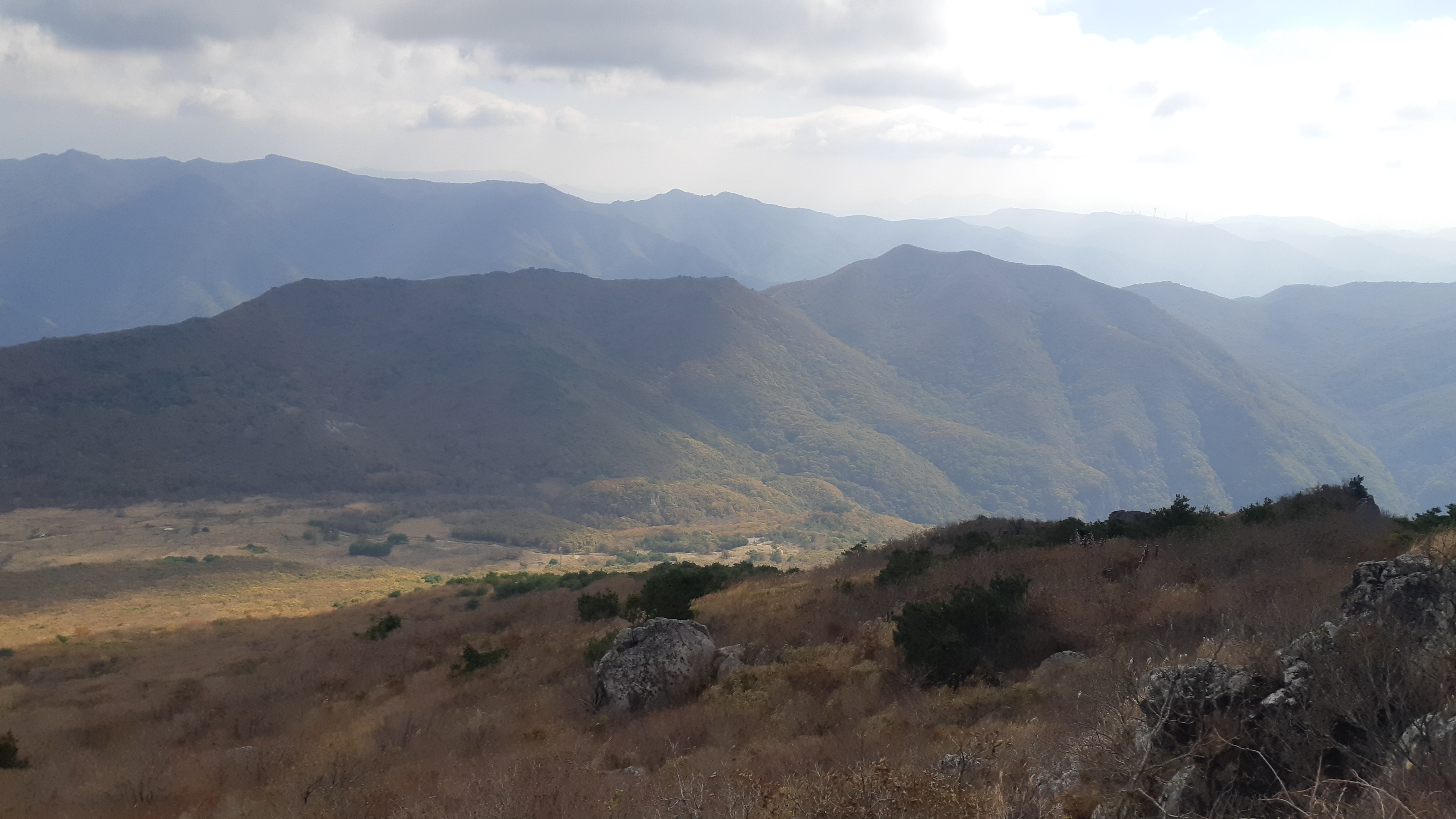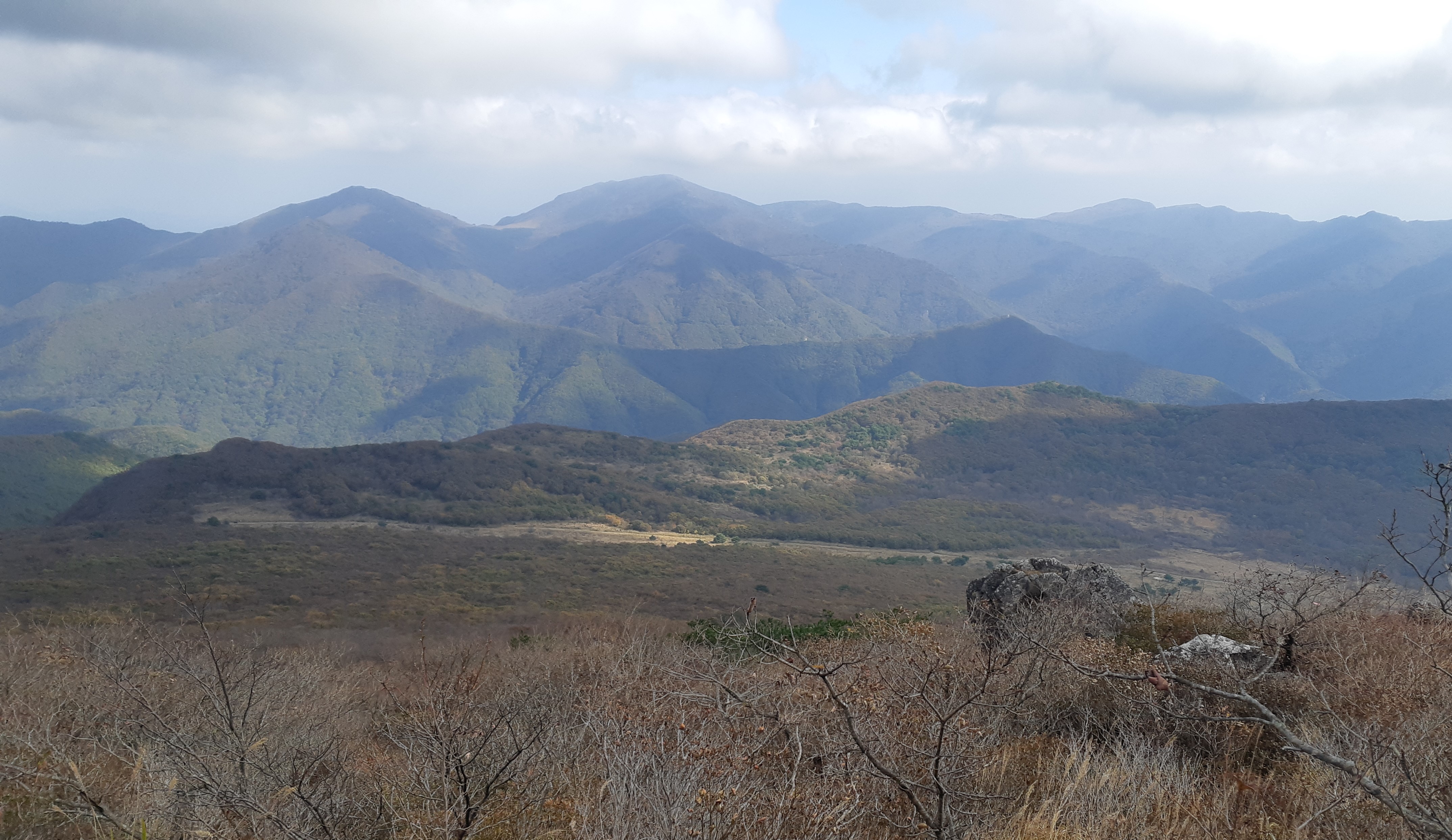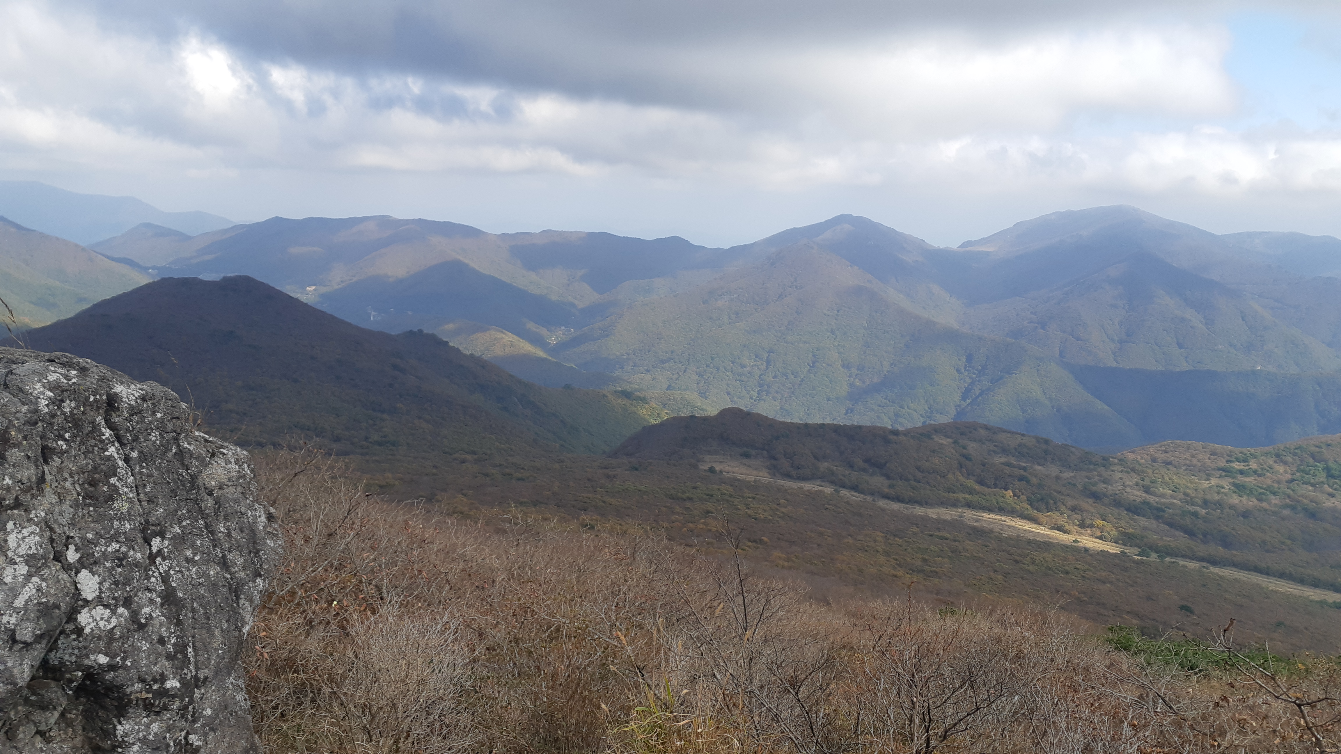 천황산 정상에서 바라본 왼쪽 억산에서 중앙의 운문산으로 이어지고 아랫재로 내려섰다 가시금 가지산으로 솟구친다(11:43)