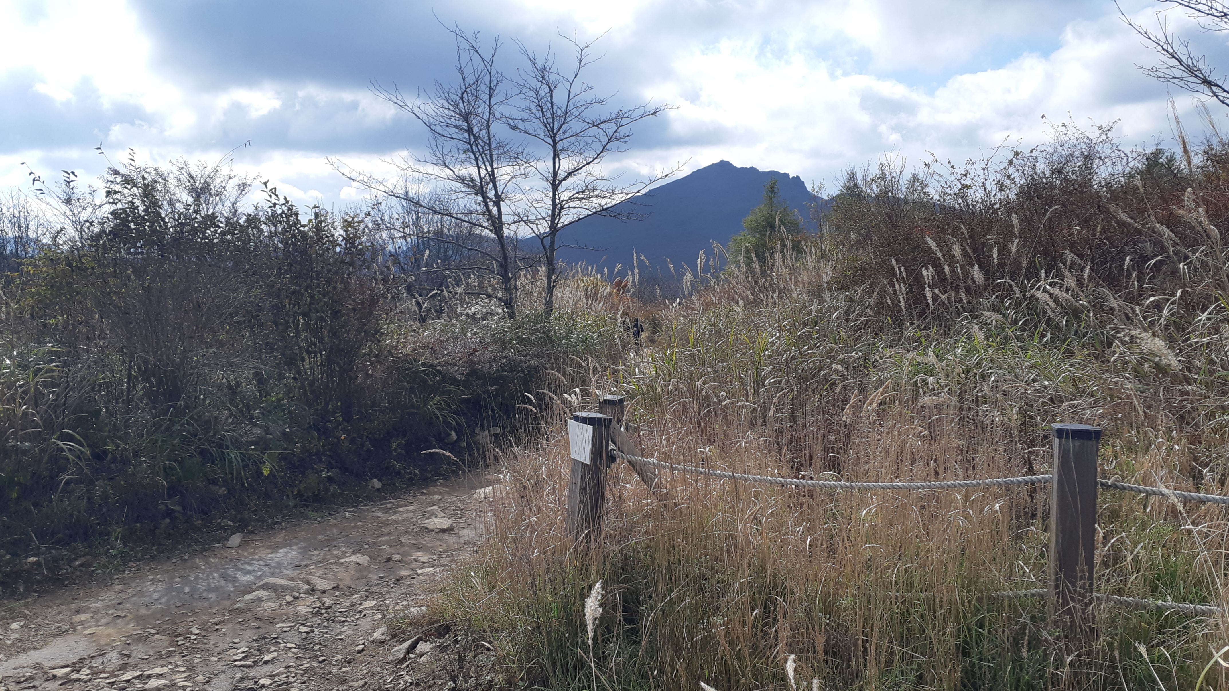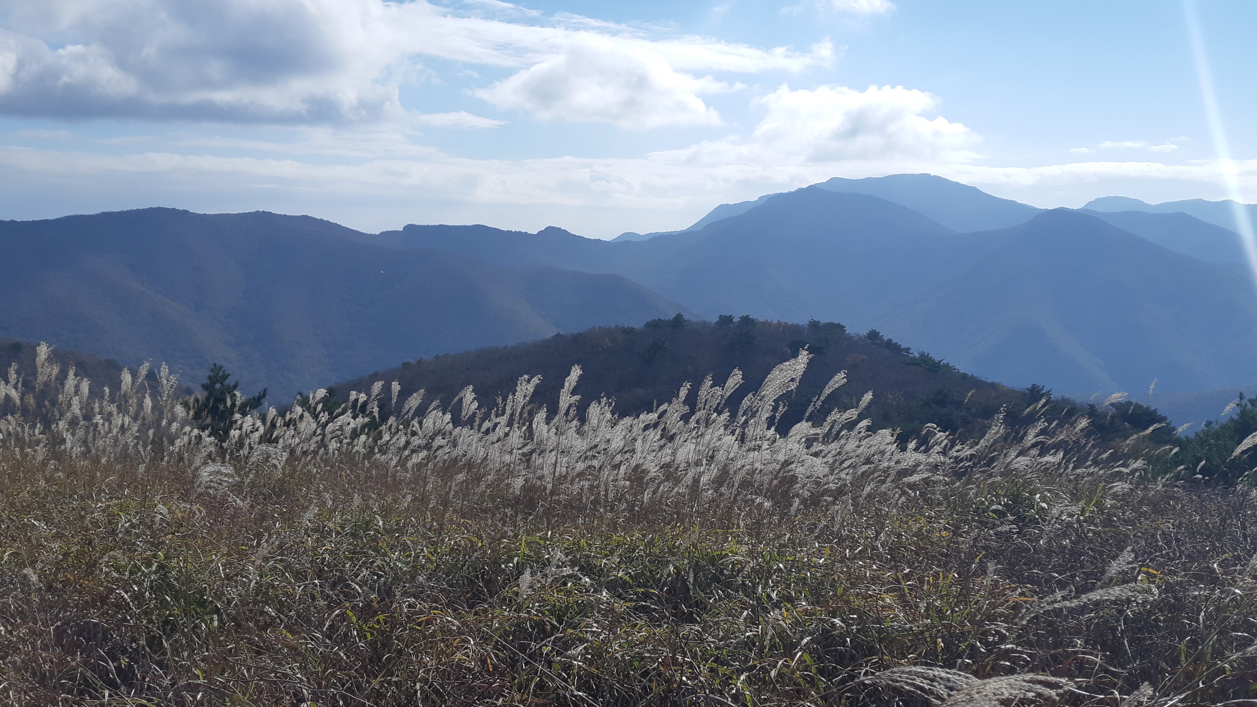 뒤 돌아보니 하늘억새길 저너머로 운문산이 보인다(11:41)