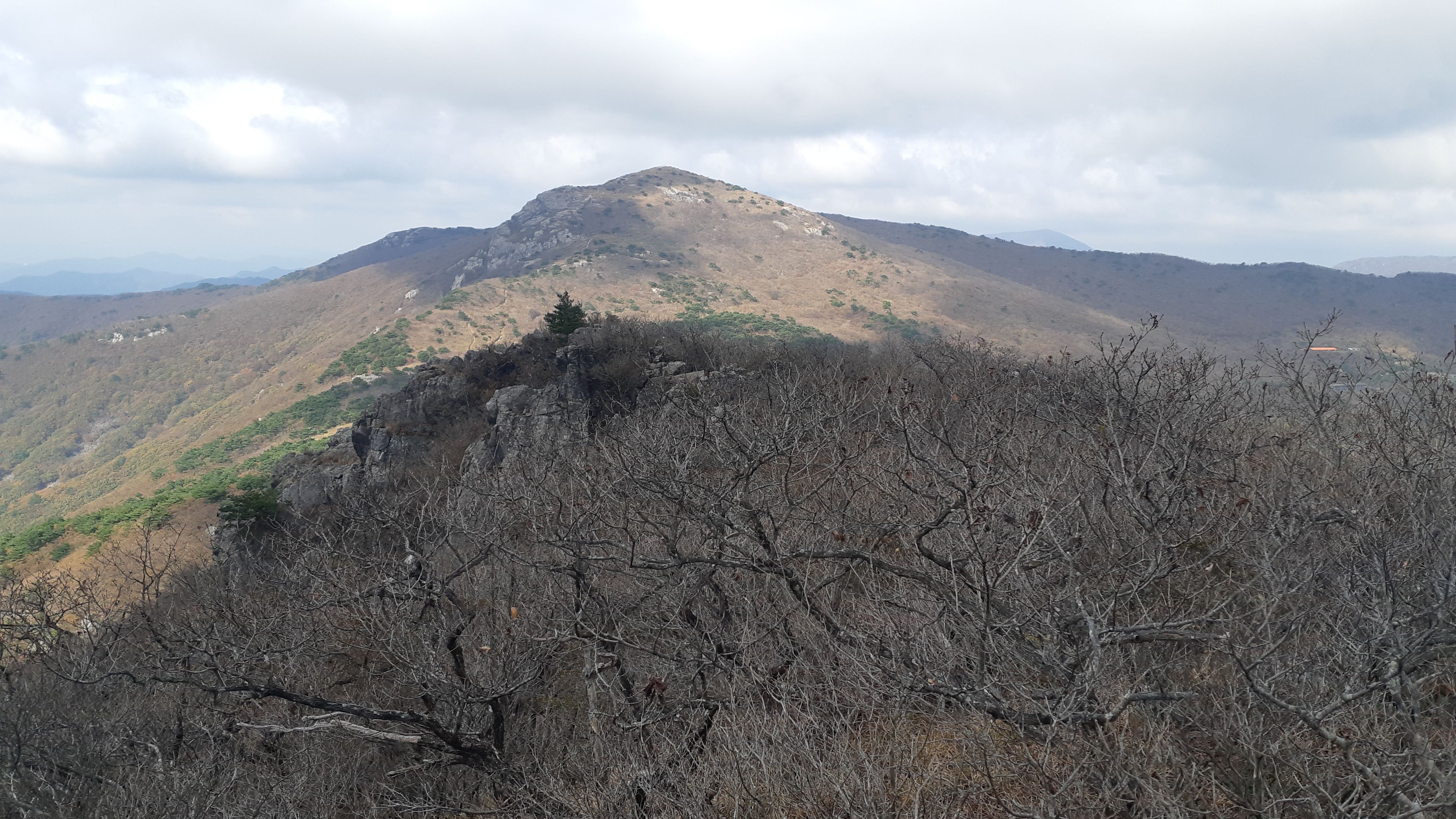 나뭇가지 사이로 백운산의 백호바위와 뒤로 운문산이 조망된다(10:34)