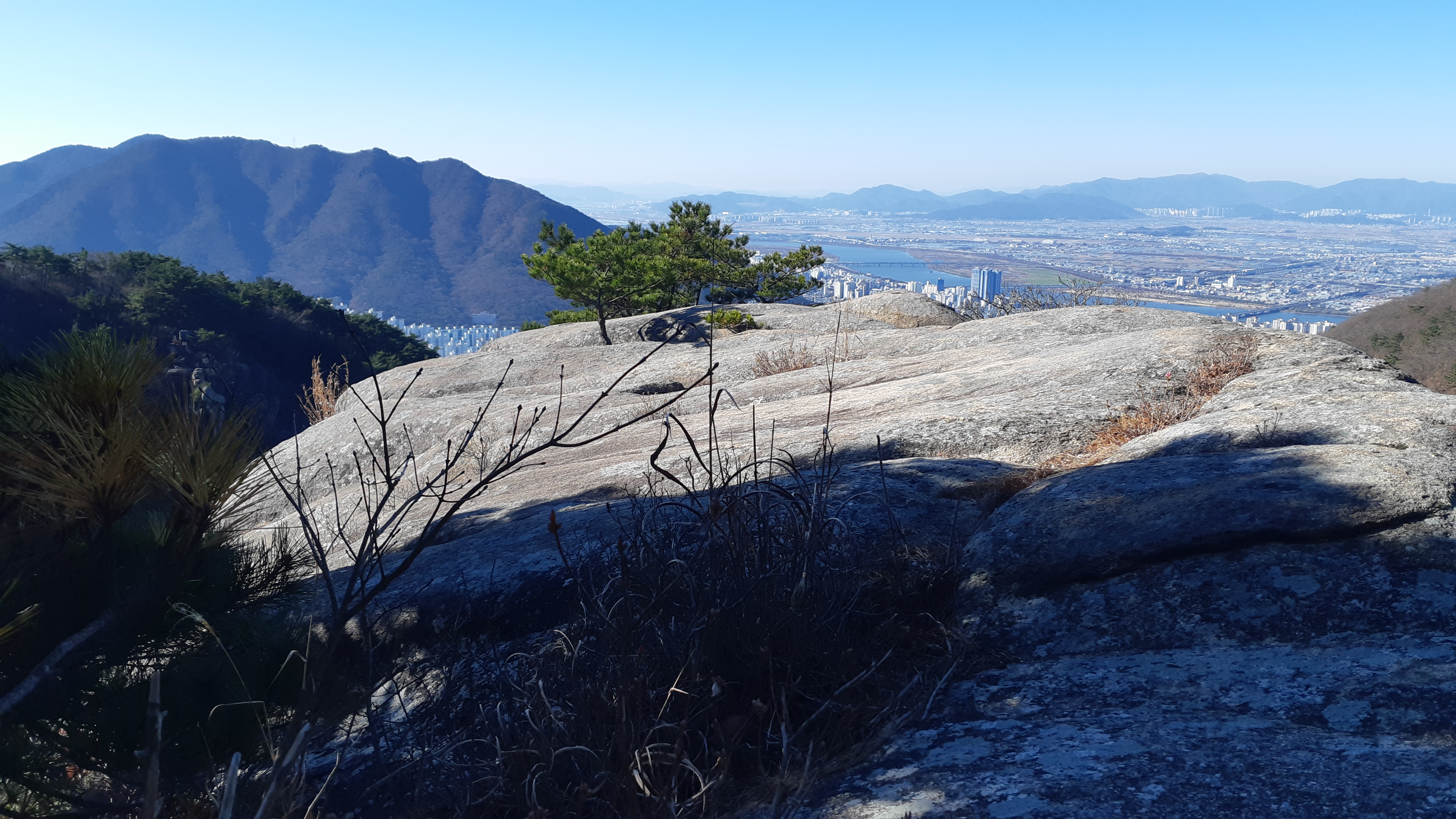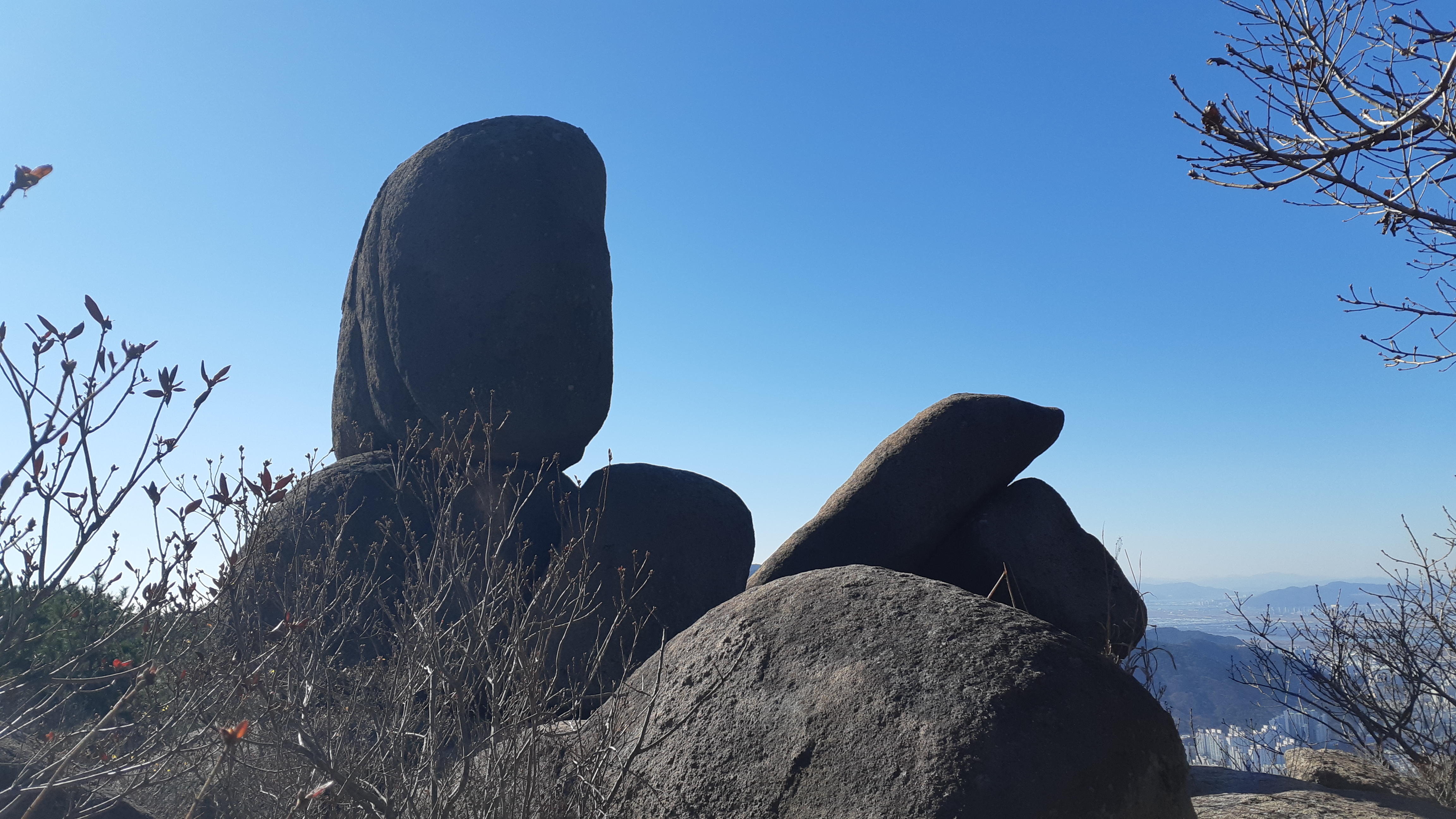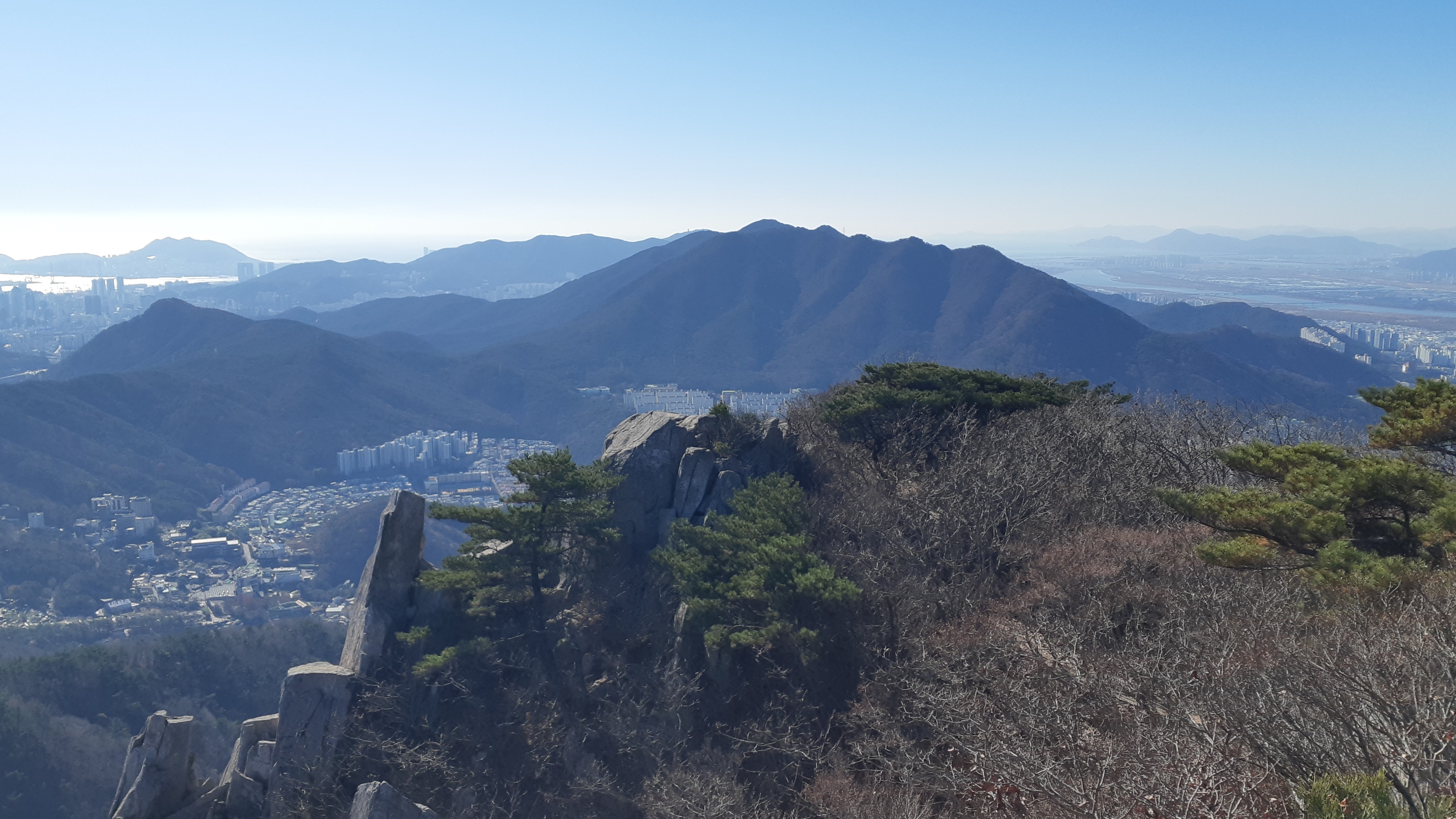 철재 사다리가 설치된 마당바위에 올라서서 주위를 살피는데 오늘은 미세먼지 없는 아주 쾌청한 날씨라서 멀리까지 막힘이 없이 조망이 가능하다. 닭벼슬바위를 지나 상계봉에 올라서니 멀리 대마도(對馬島)까지 가늠할 수가 있었다. 상계봉에서 되돌아 내려서고 삼각점이 박혀있는 제1망루가 자리하던 곳인 지도상 상계봉 정상에서 점심식사(11:44~12:10)를 하고 화산을 지나 도시철도 2호선 화명역에 도착하며 오늘 산행을 마무리한다.