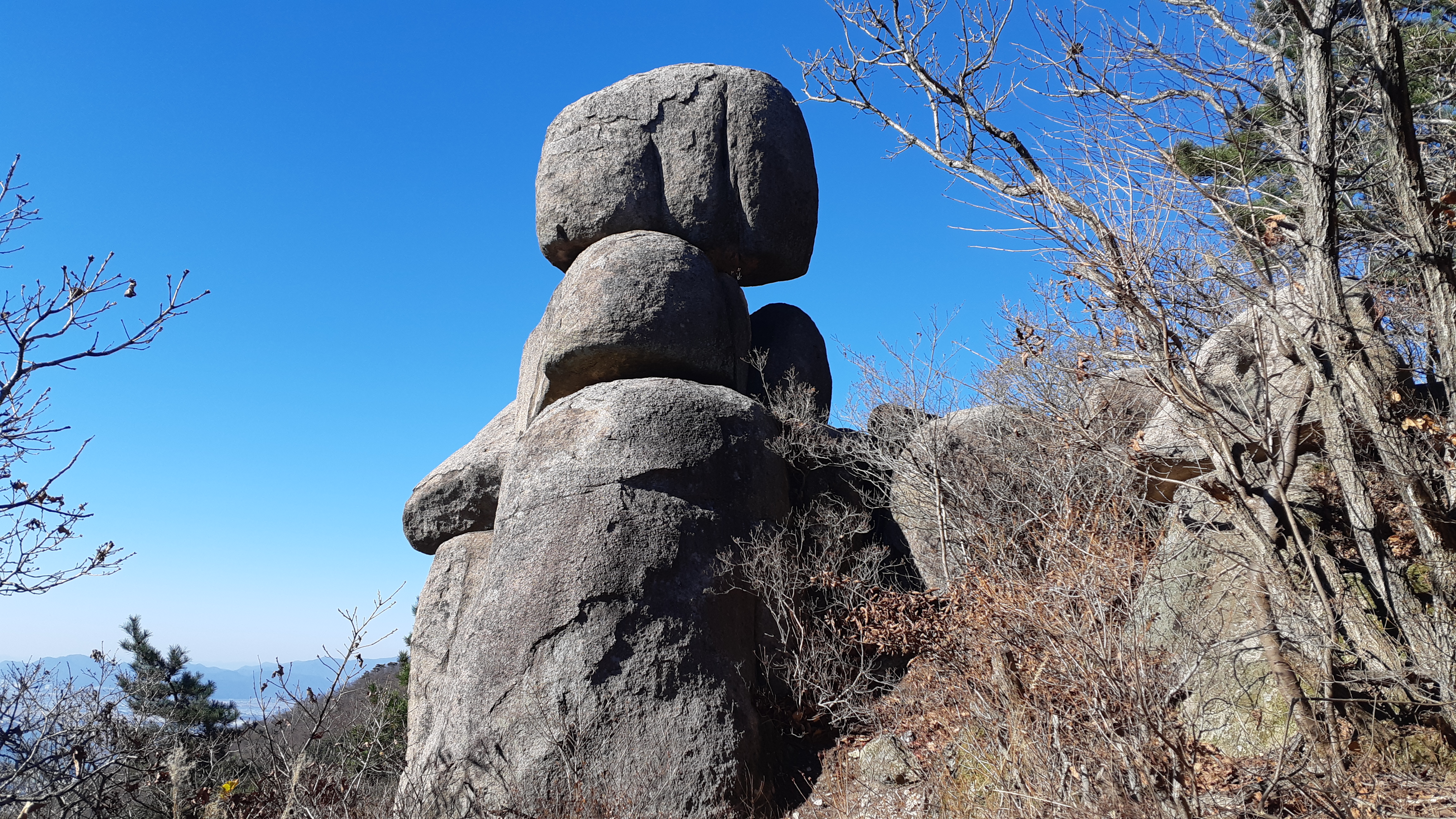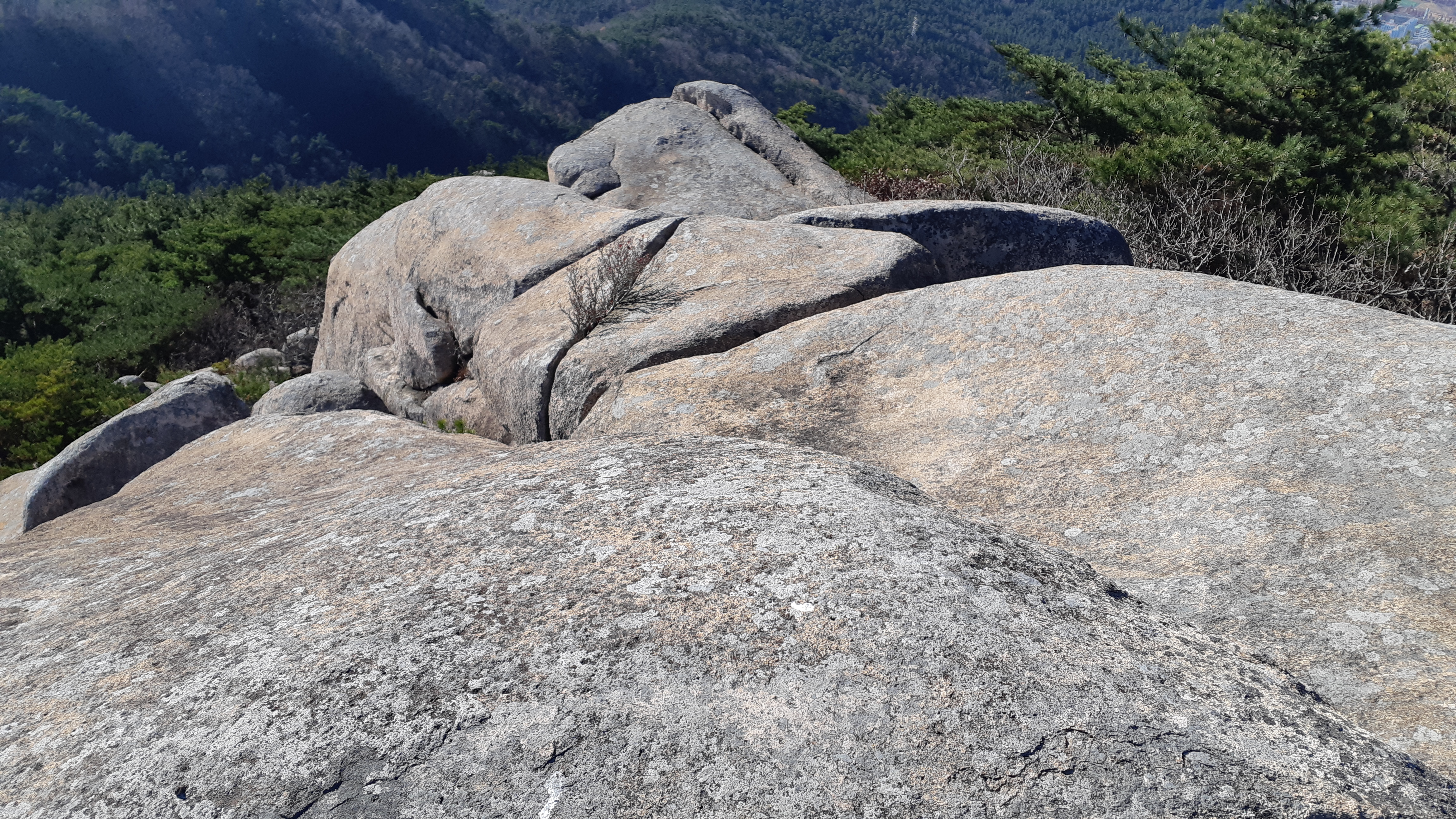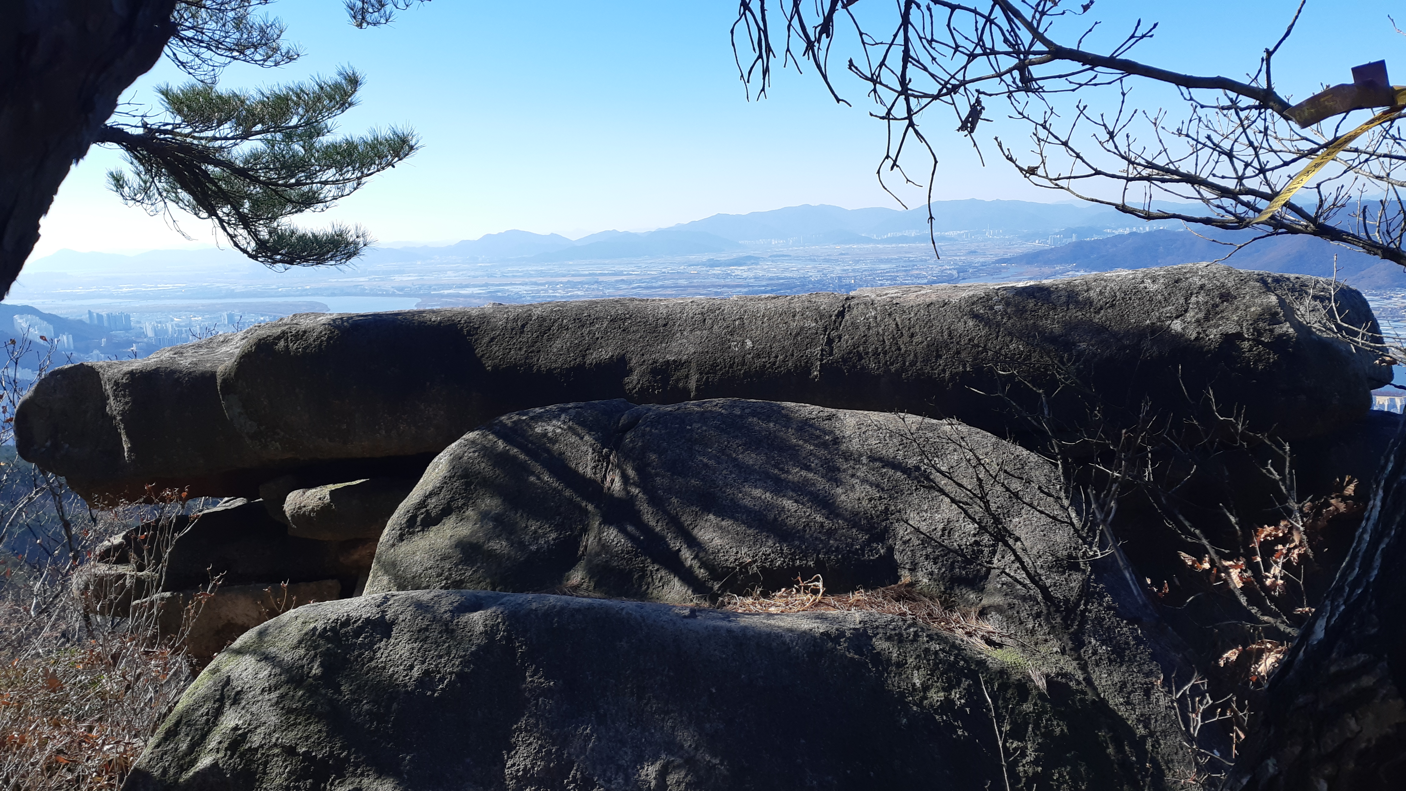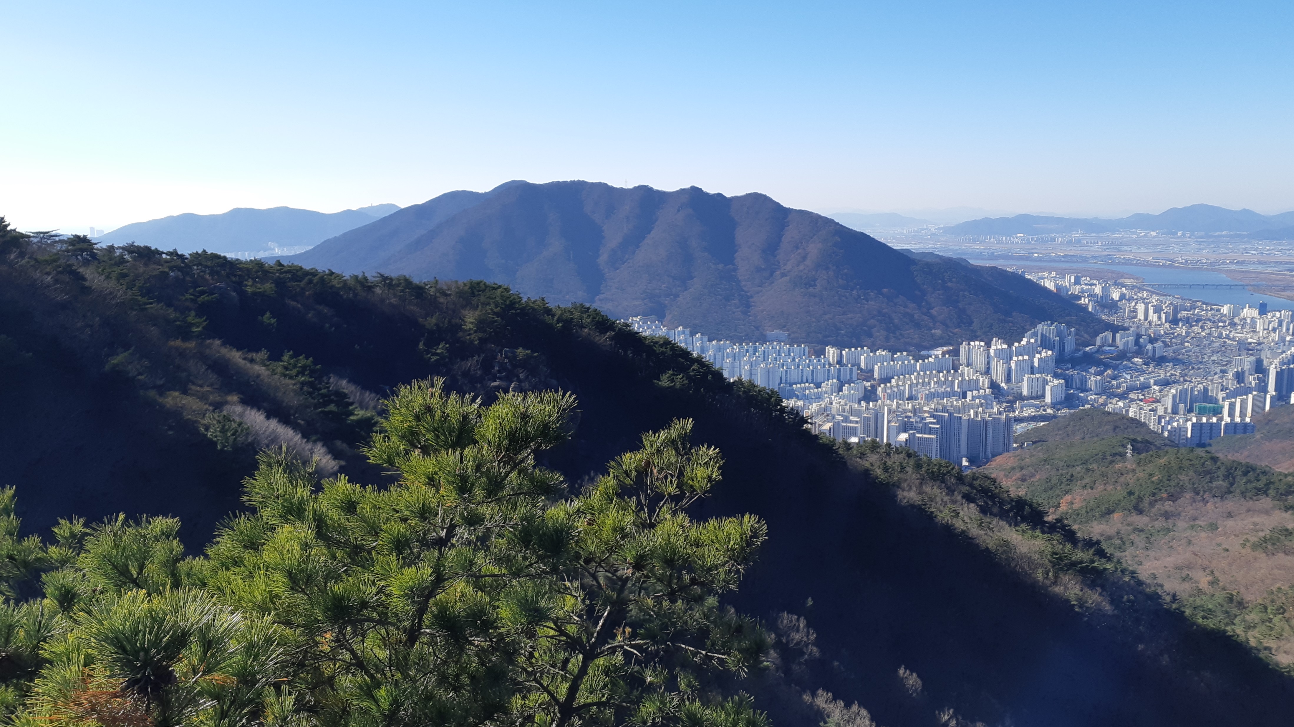 철재 사다리가 설치된 마당바위에 올라서서 주위를 살피는데 오늘은 미세먼지 없는 아주 쾌청한 날씨라서 멀리까지 막힘이 없이 조망이 가능하다. 닭벼슬바위를 지나 상계봉에 올라서니 멀리 대마도(對馬島)까지 가늠할 수가 있었다. 상계봉에서 되돌아 내려서고 삼각점이 박혀있는 제1망루가 자리하던 곳인 지도상 상계봉 정상에서 점심식사(11:44~12:10)를 하고 화산을 지나 도시철도 2호선 화명역에 도착하며 오늘 산행을 마무리한다.