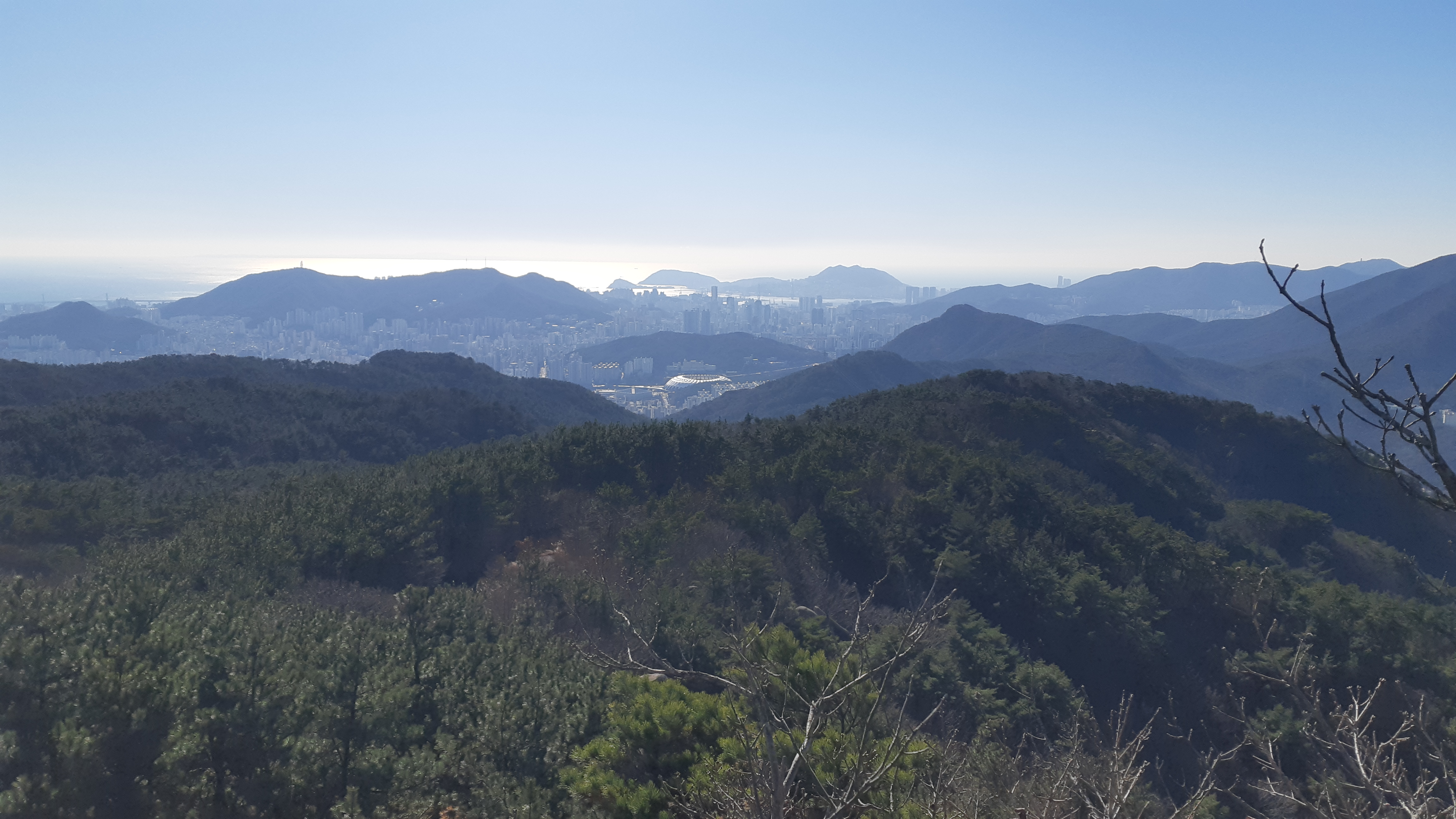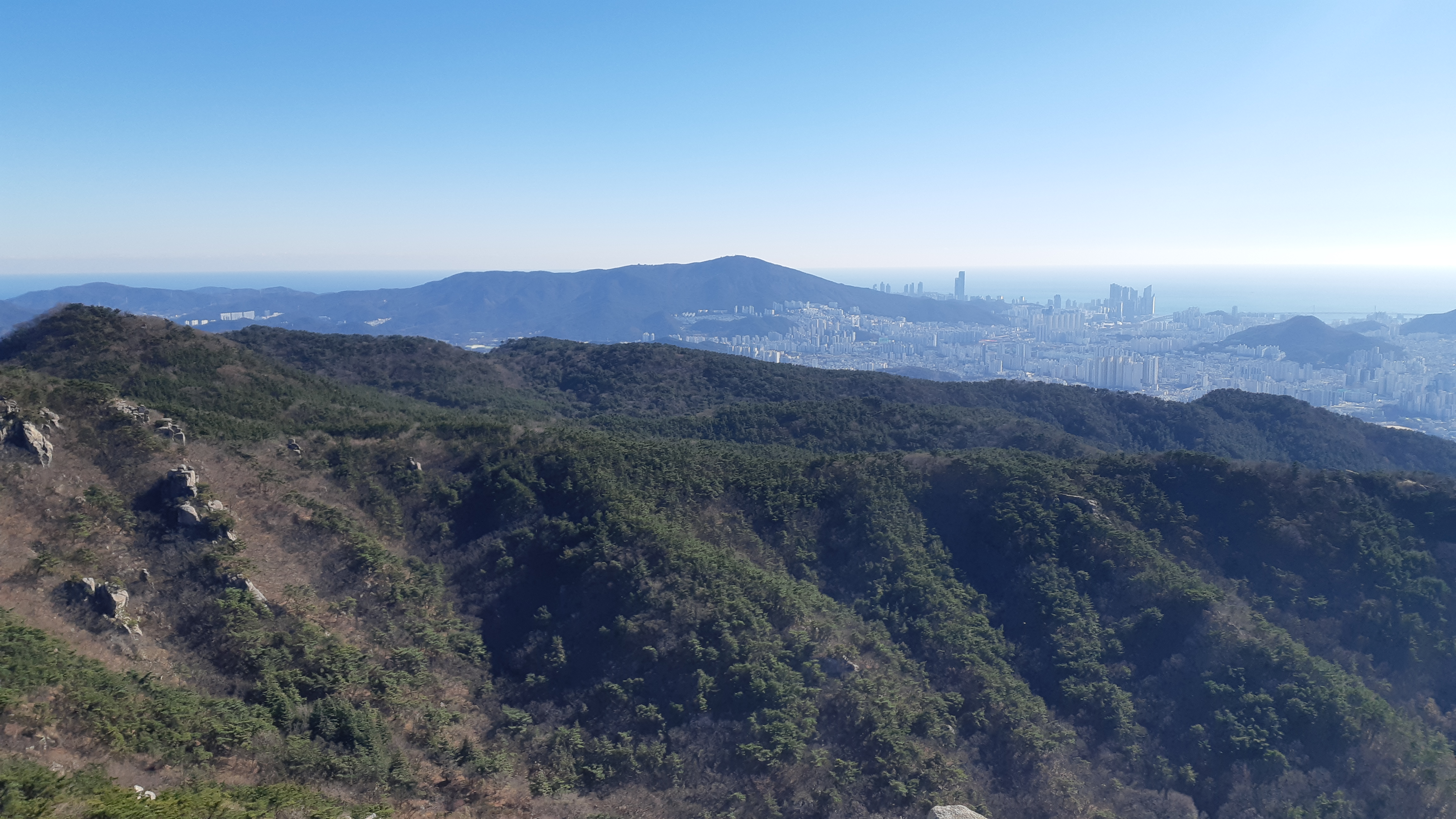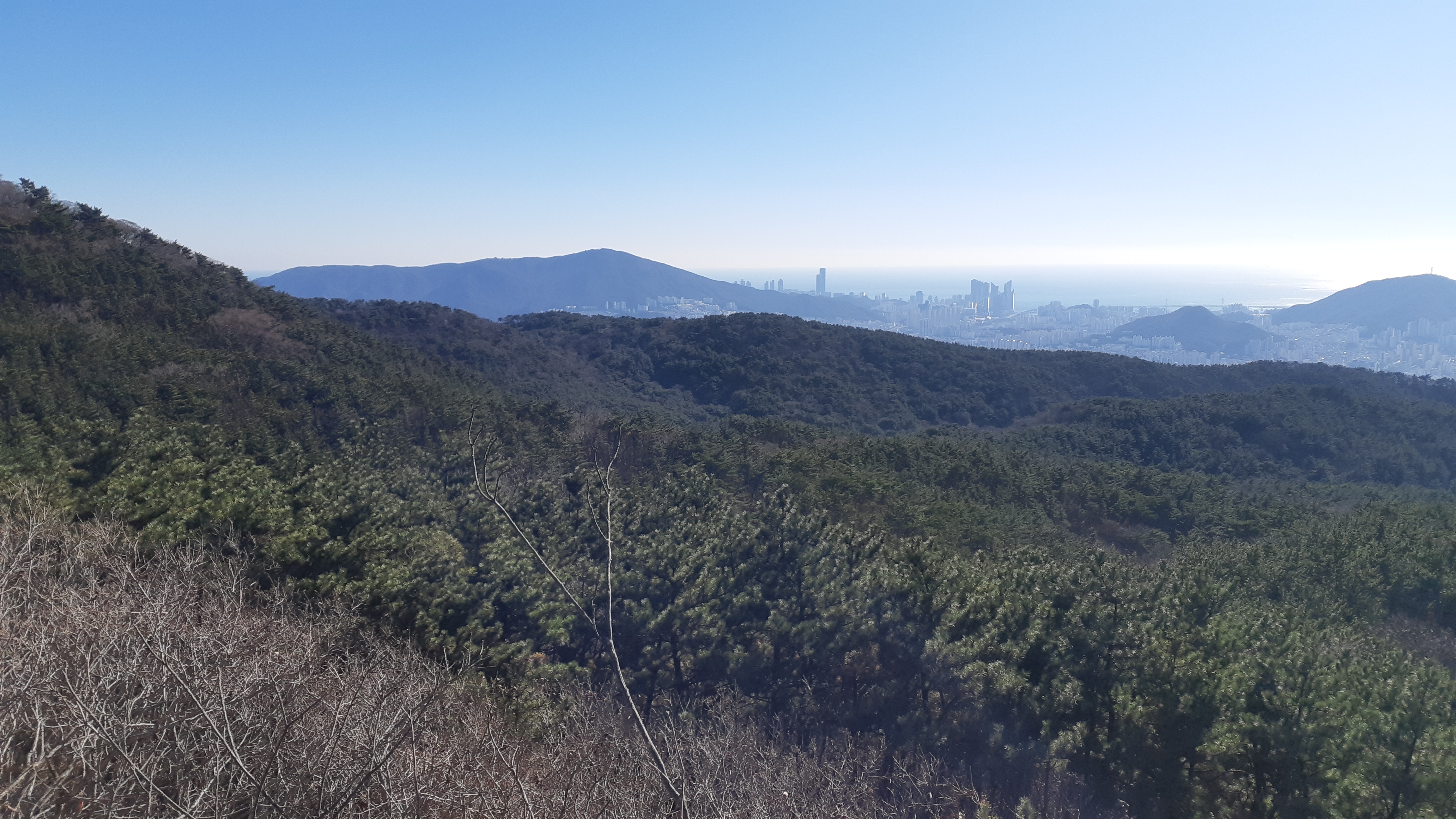 조망처에서 바라본 멀리 장산과 오른쪽으로 해운대의 고층건물이 조망된다(11:03)