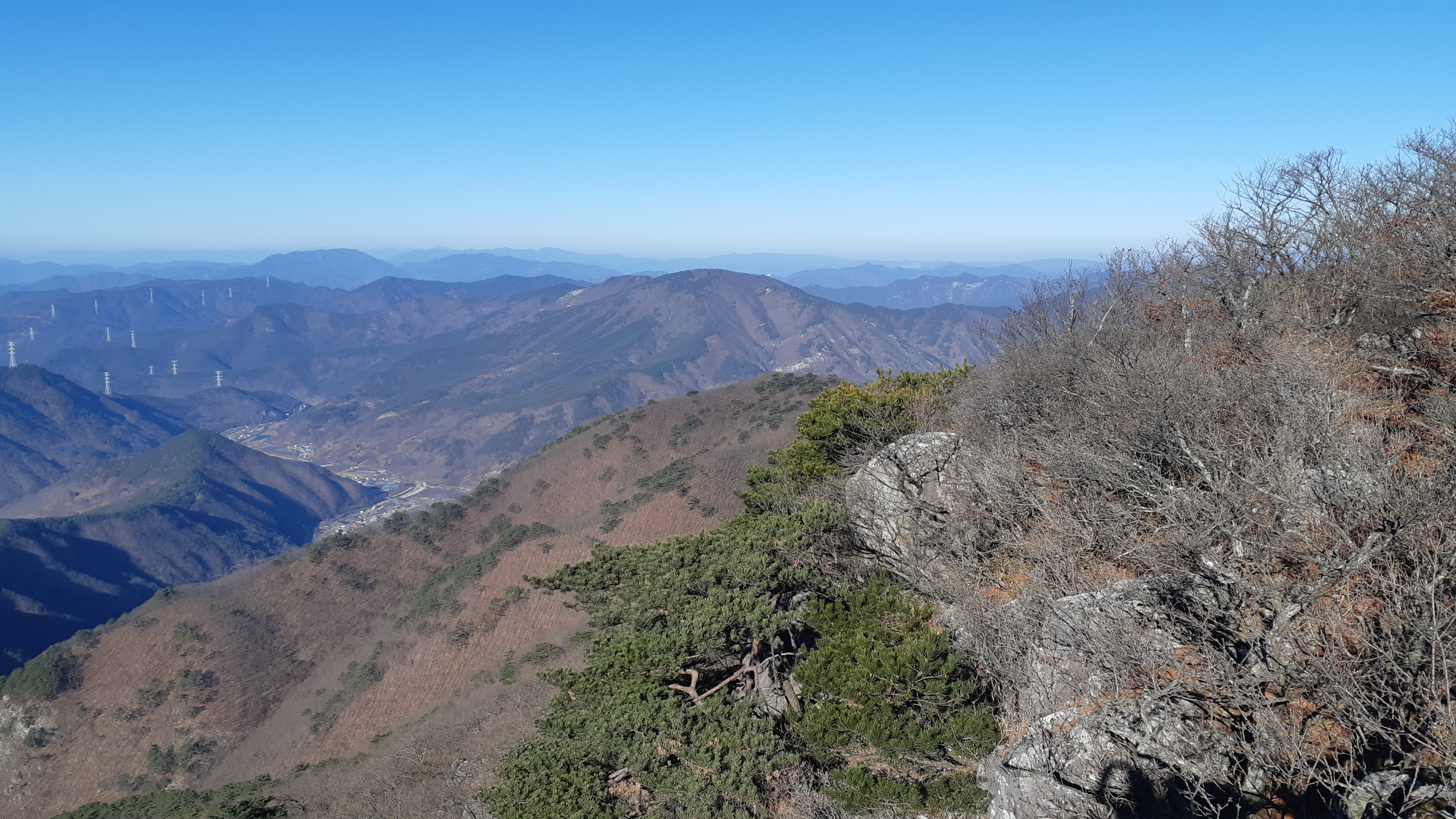 향로산 정상에서 바라본 중앙의 밀양 시가지와 고리원자력에서 발전된 765kV철탑이 밀양을 지나 현풍으로 이어진다(10:15)