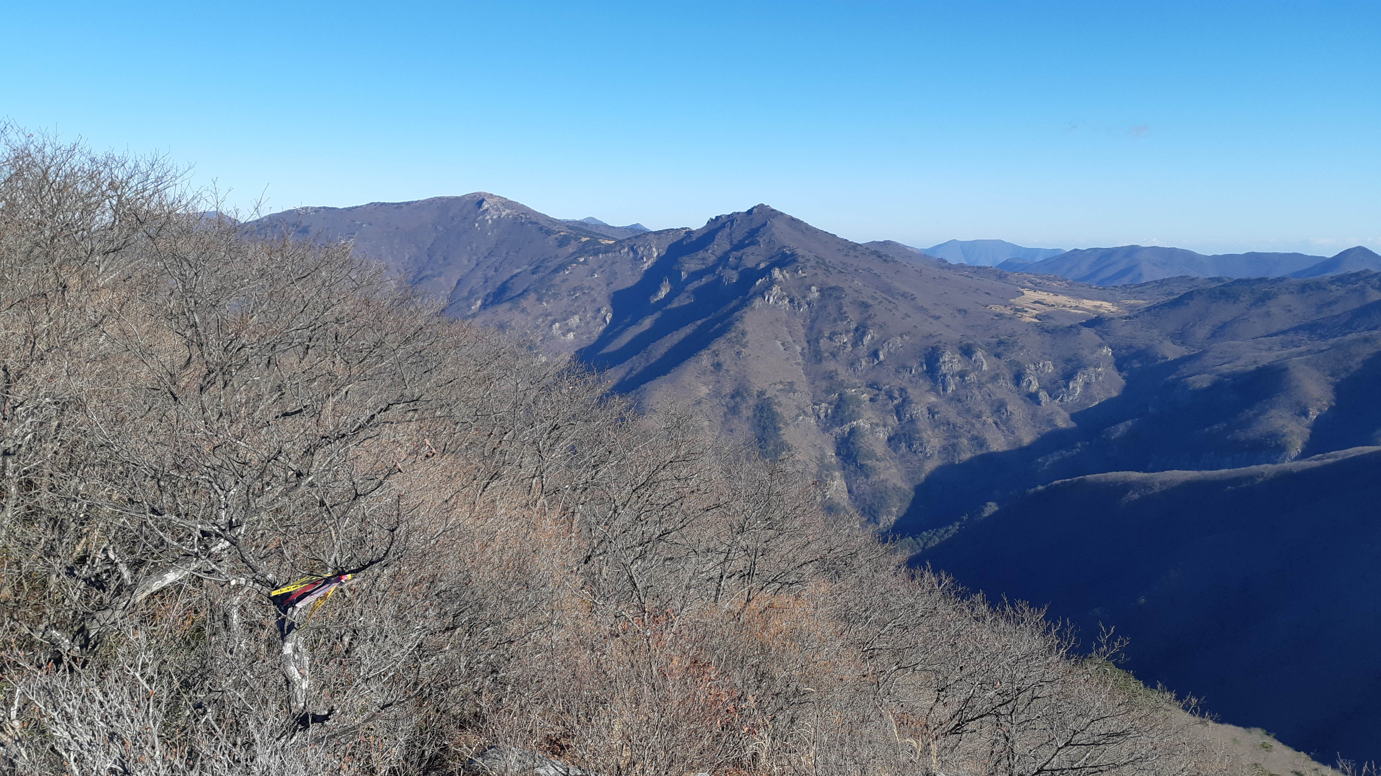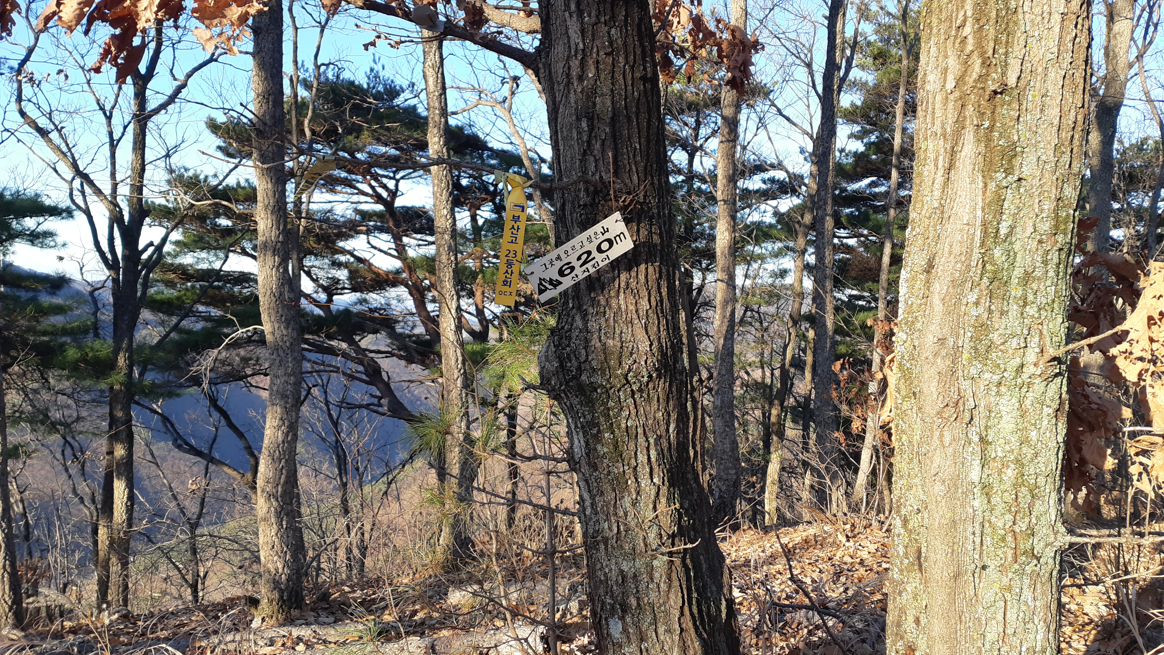 낙엽이 깊게 쌓여 줄줄 미끌리는 까꼬막을 스틱으로 지탱하며 오르니 영하의 추위에도 등어리가 촉촉하게 젖어오며 620봉에 올라선다. 햇볕이 비추니 추위는 저 멀리 물러갔고 시야가 틔면서 오른쪽으로 신불산에서 영축산 그리고 함박등~채이등~죽바우등~시살등과 오룡산으로 이어지는 능선이 햇살에 눈부시게 비춰준다. 1시간40분가량 걸려 주능선에 닿는데 오른쪽은 재약봉과 코끼리봉 그리고 재약산과 천황산으로 이어지는 갈림길로 이정표가 세워져 있다. 잠시 진행하면 왼쪽으로 조망처가 나오는데 멀리 토곡산과 매봉에서 구천산을지나 금오산으로 이어지는 영축지맥 주능선이 한 눈에 조망된다. 이곳 갈림길에서 20분여 진행하면 표충사로 내려가는 또 다른 이정표가 세워져있다.