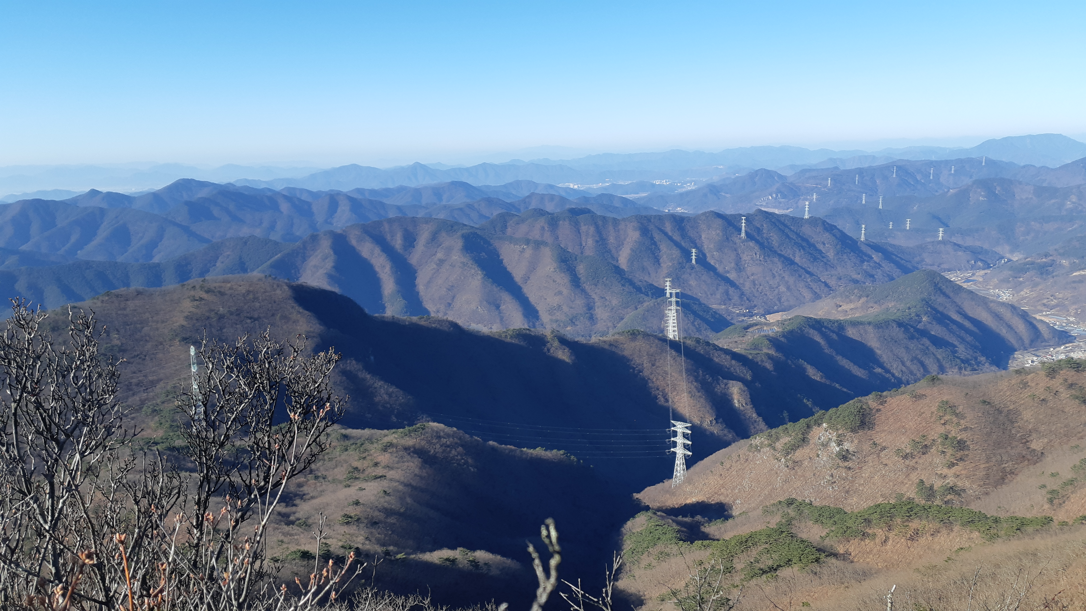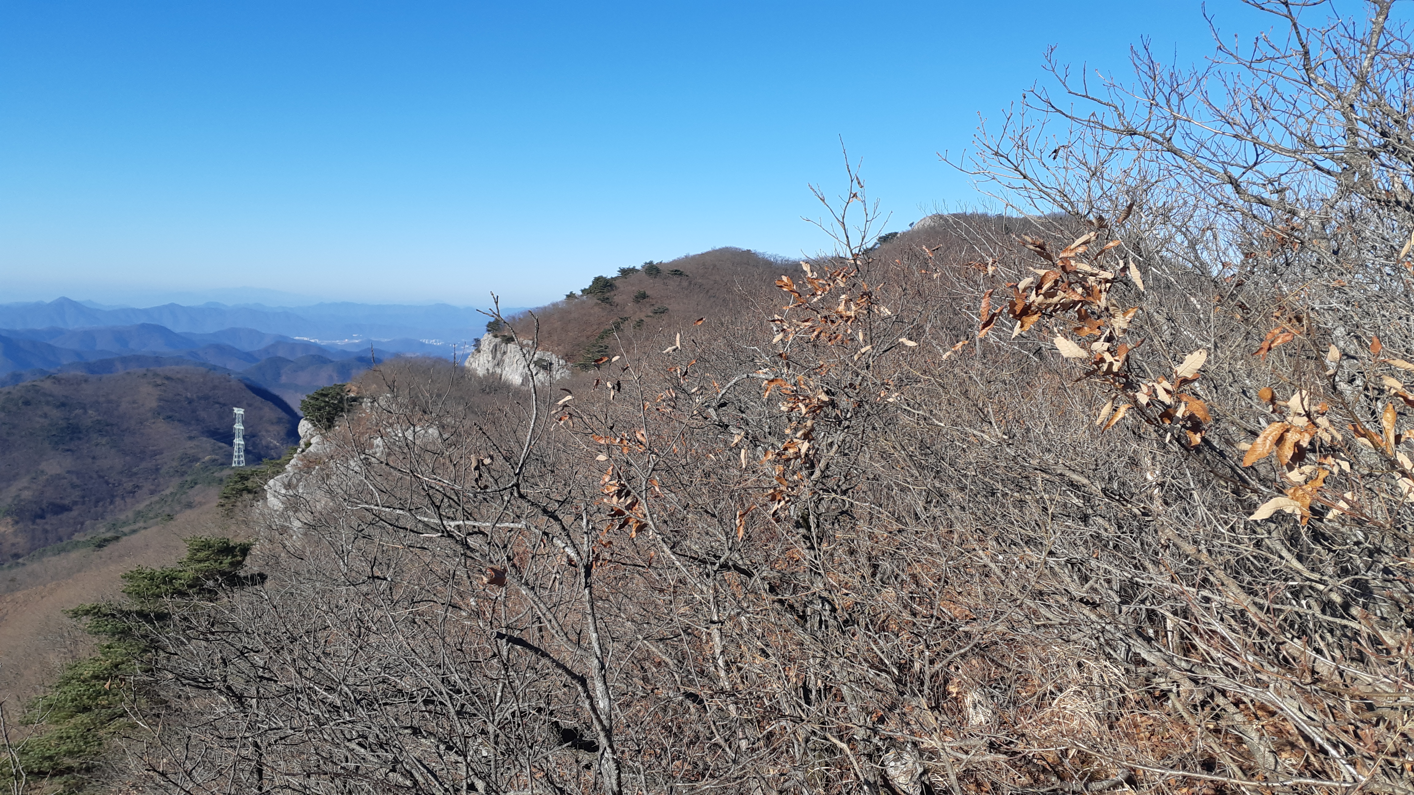 조망처에서 바라본 철탑 오른쪽은 백마산이고 하늘금은 금오산에서 만어산으로 이어진다(09:18)
