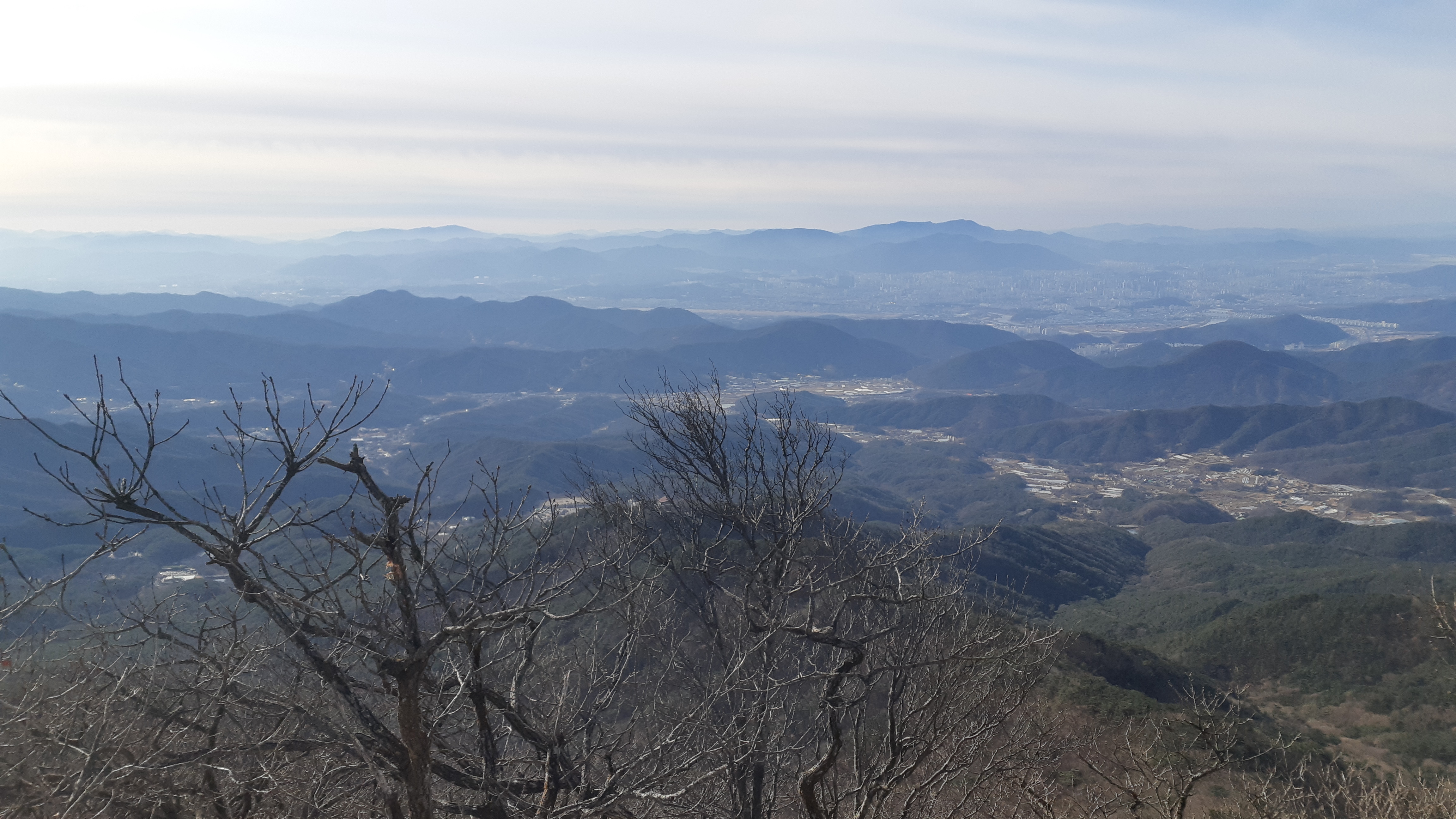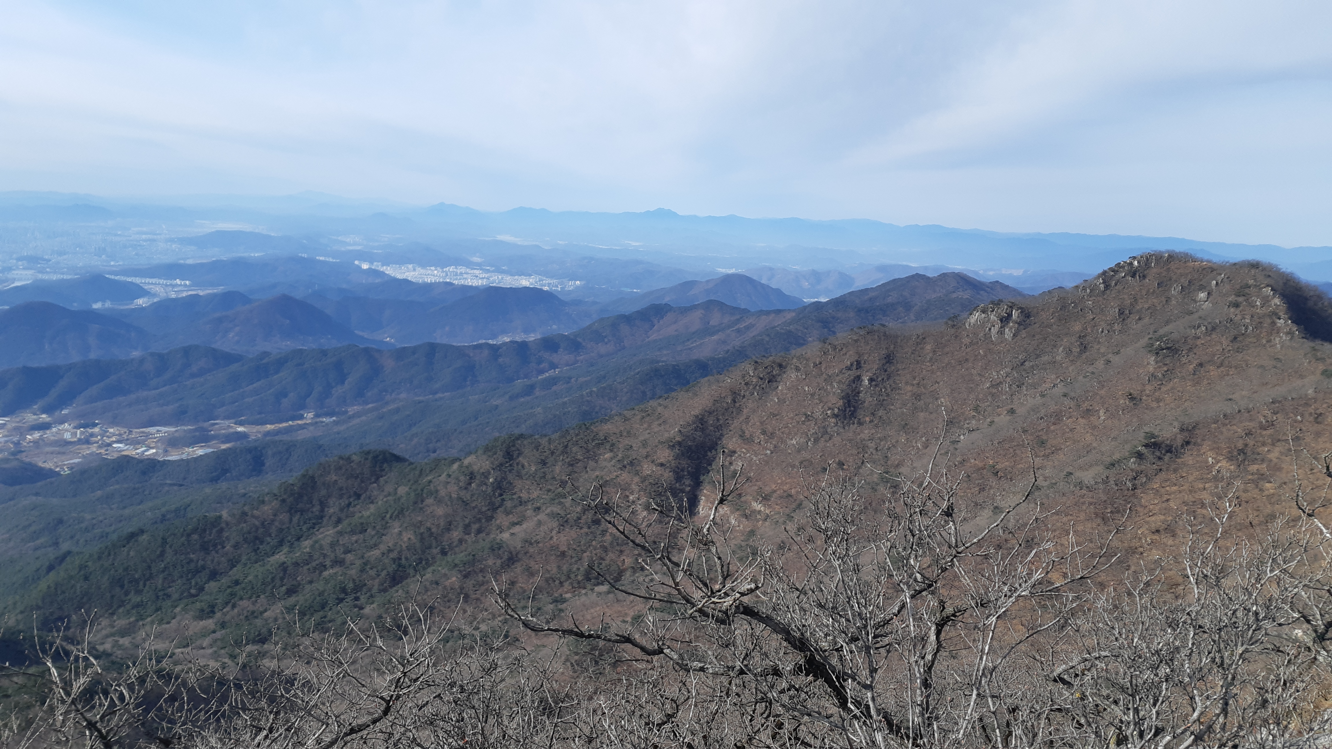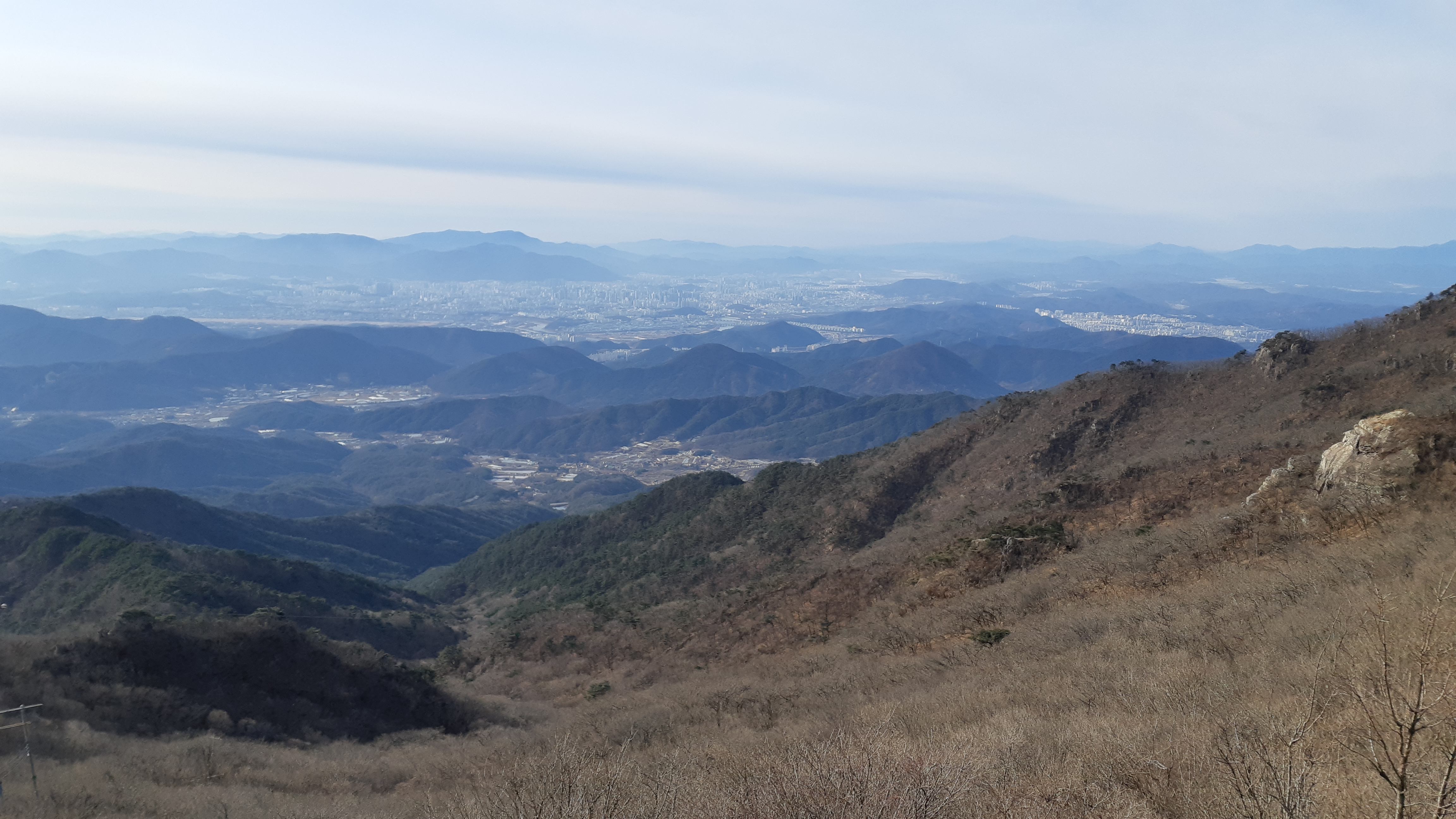 동봉 정상에서 바라본 대구시가지 뒤로 비슬산이 조망된다(10:35)