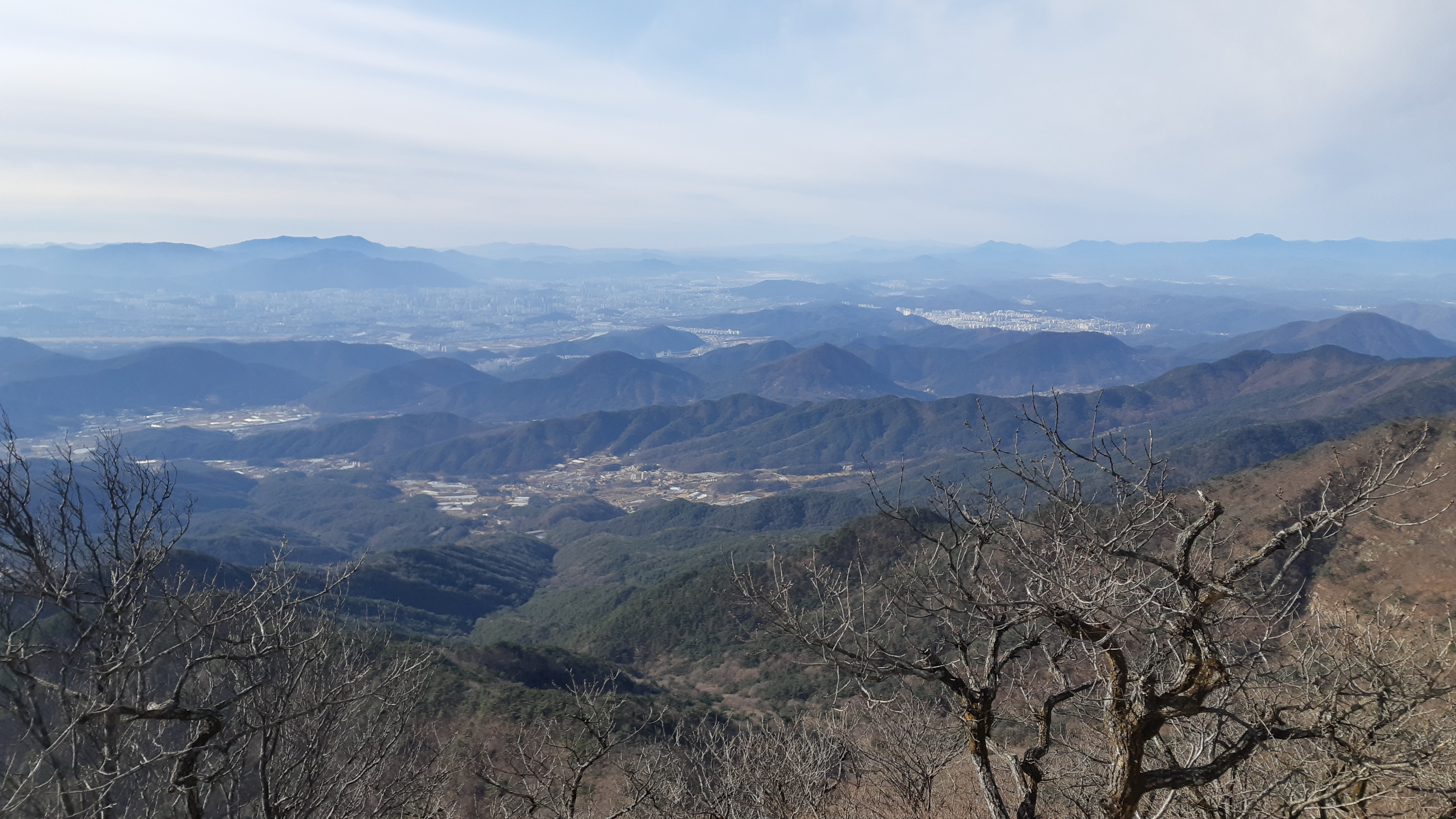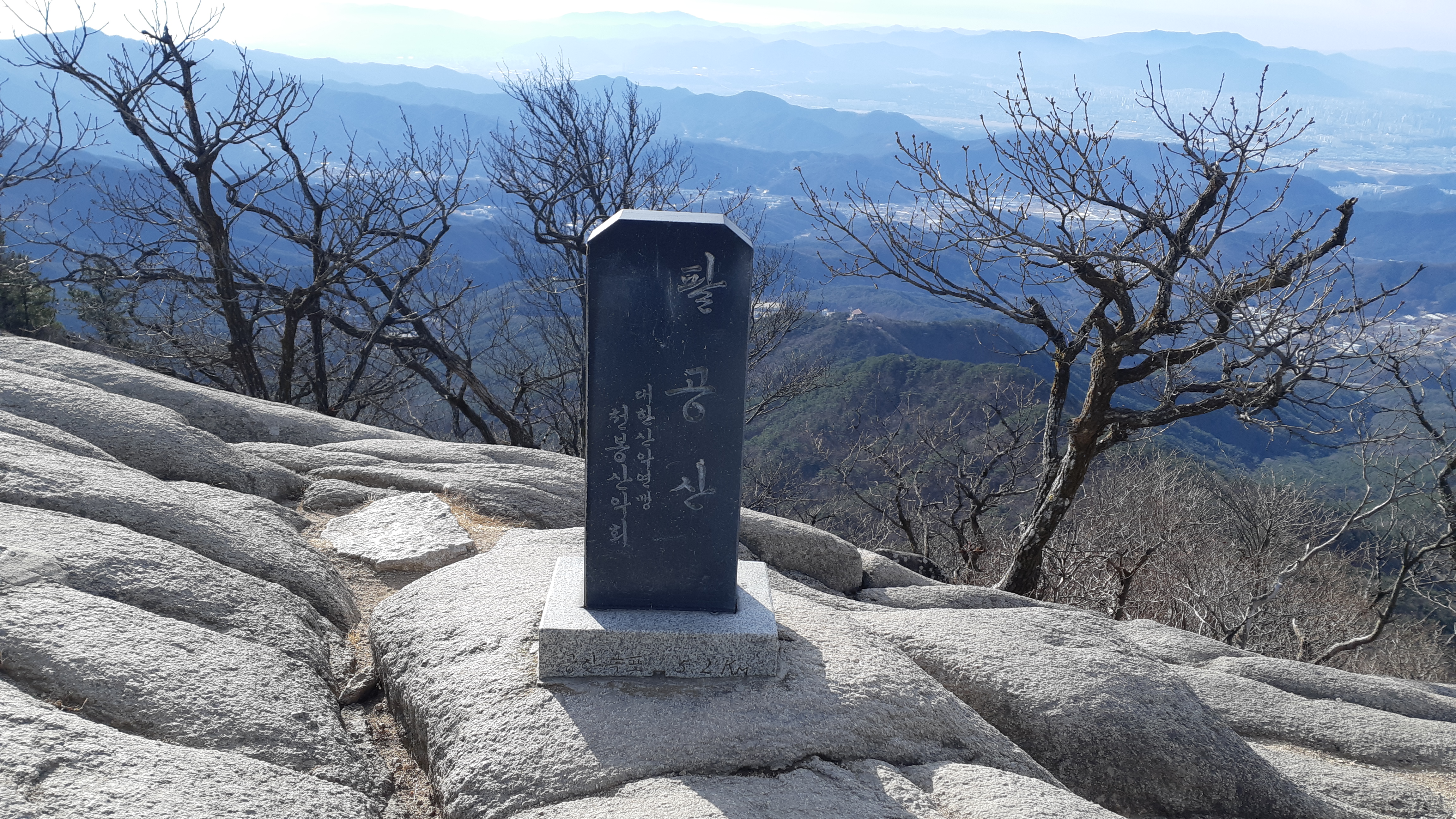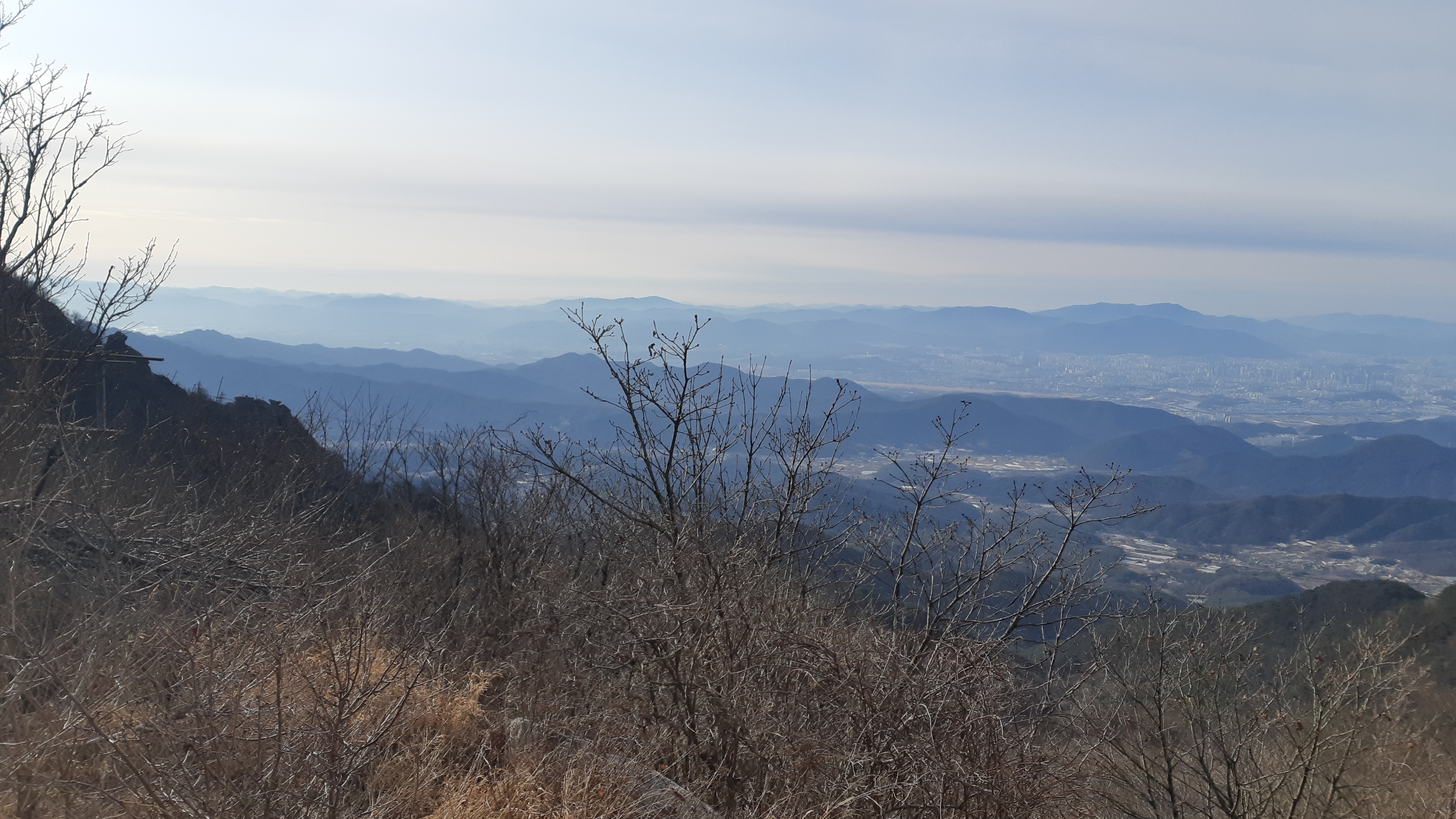 동봉 정상에서 바라본 대구시가지 뒤로 비슬산이 조망된다(10:35)