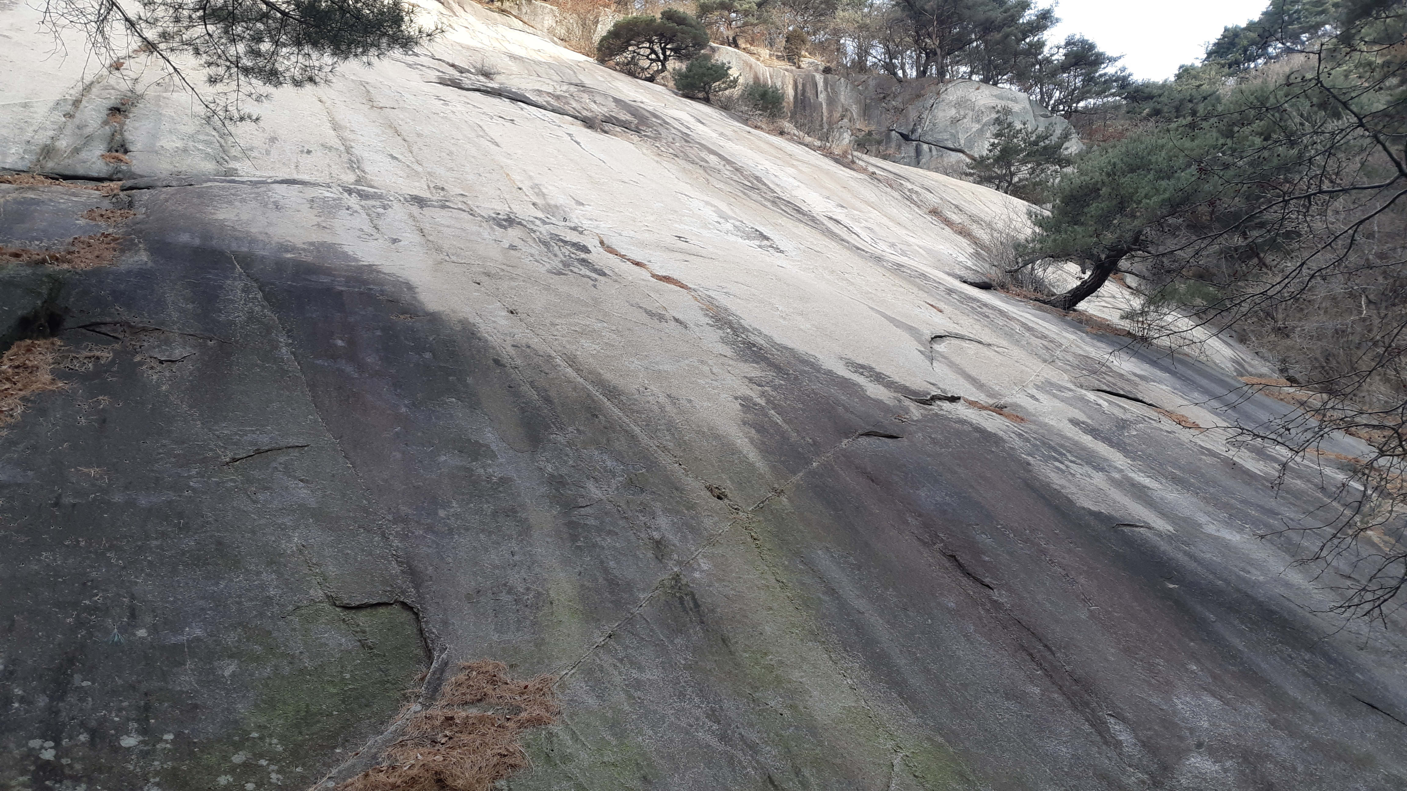 왼쪽으로 깎아지른 바위가 넓게 펼쳐지고 중앙에 걸린 소나무가 신기하다(09:07)