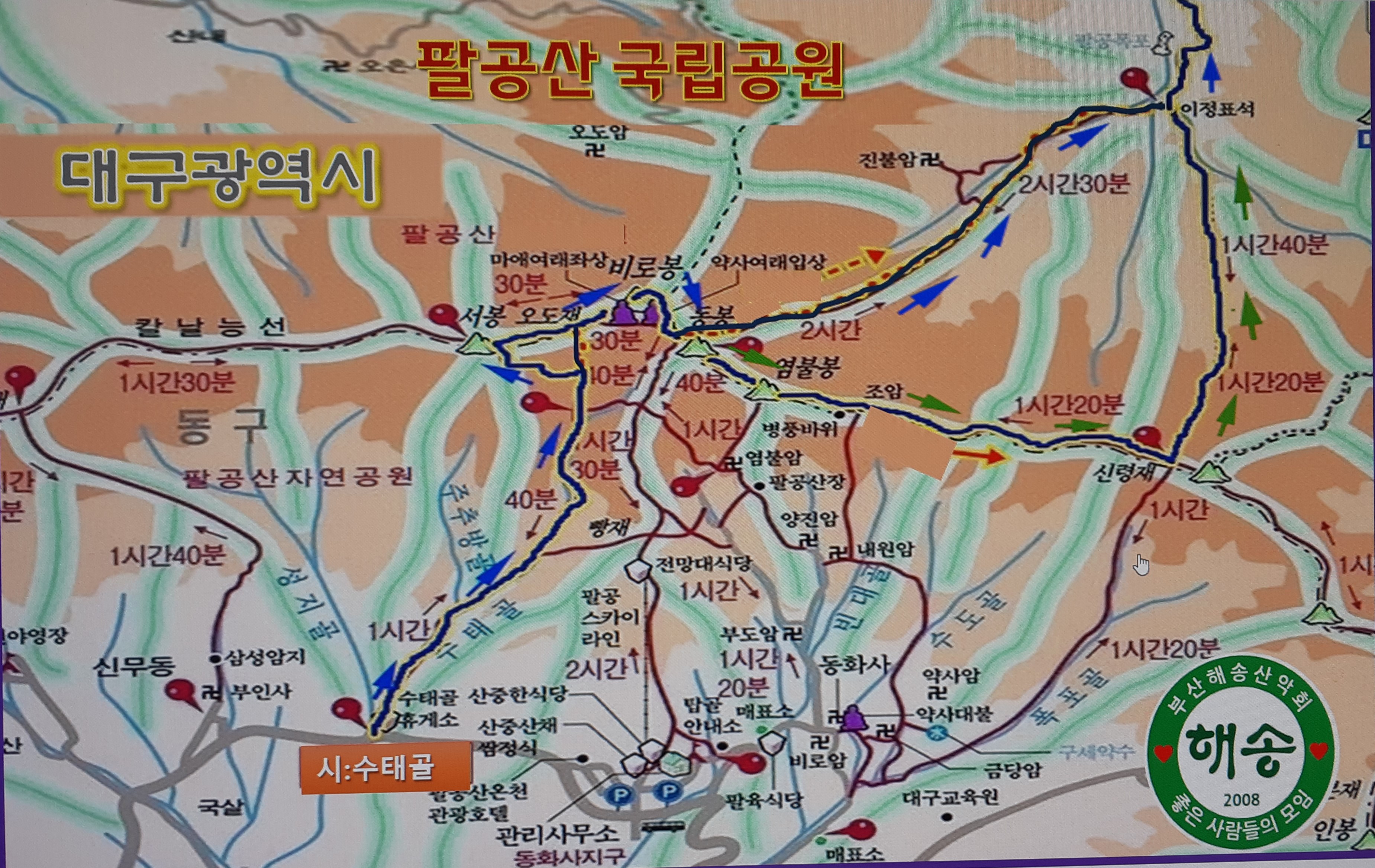 - 06:45 부산 동래 출발 - 08:30 대구시 동구 용수동 수태골탐방지원센타주차장 도착(대림고속관광)