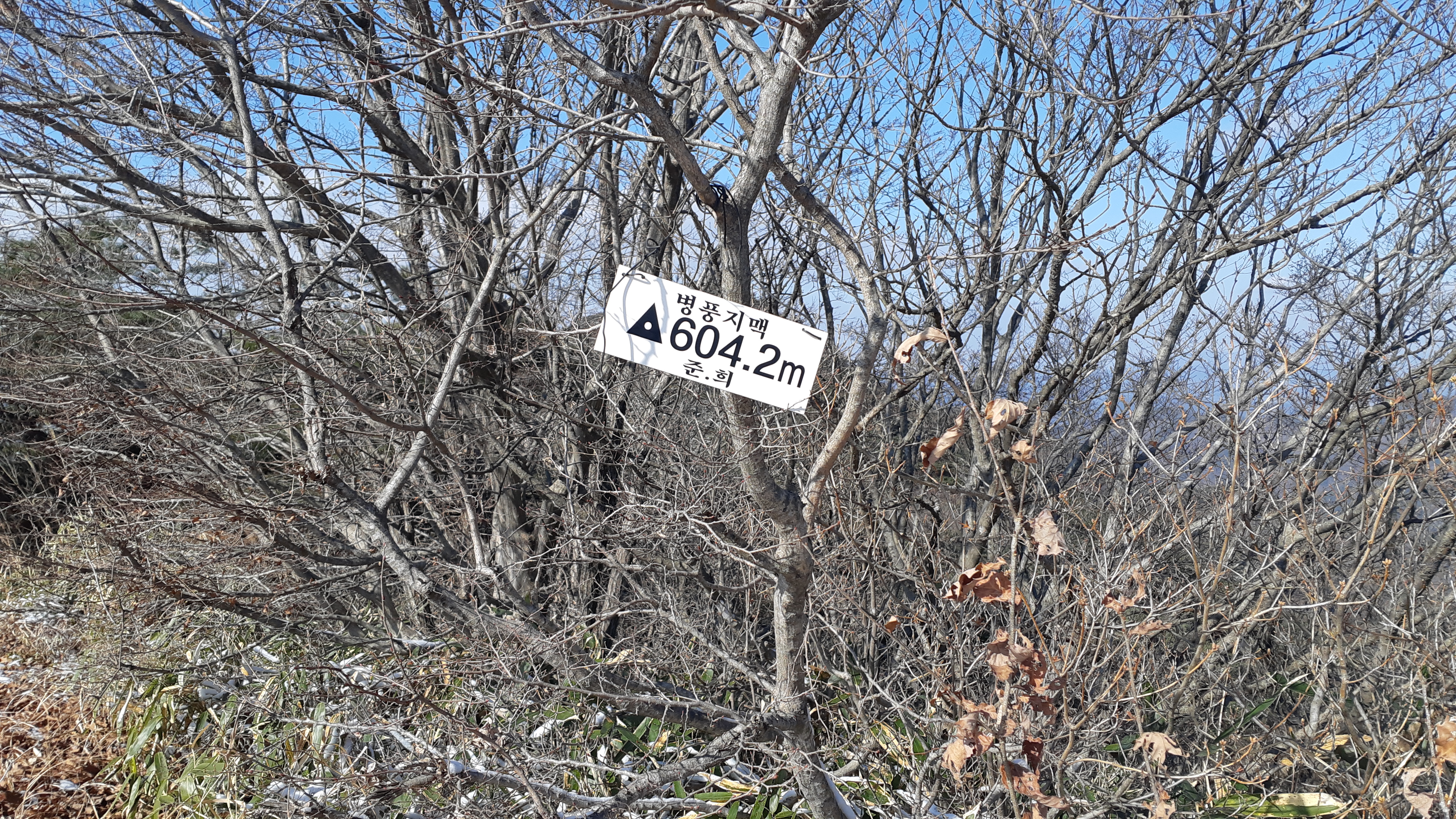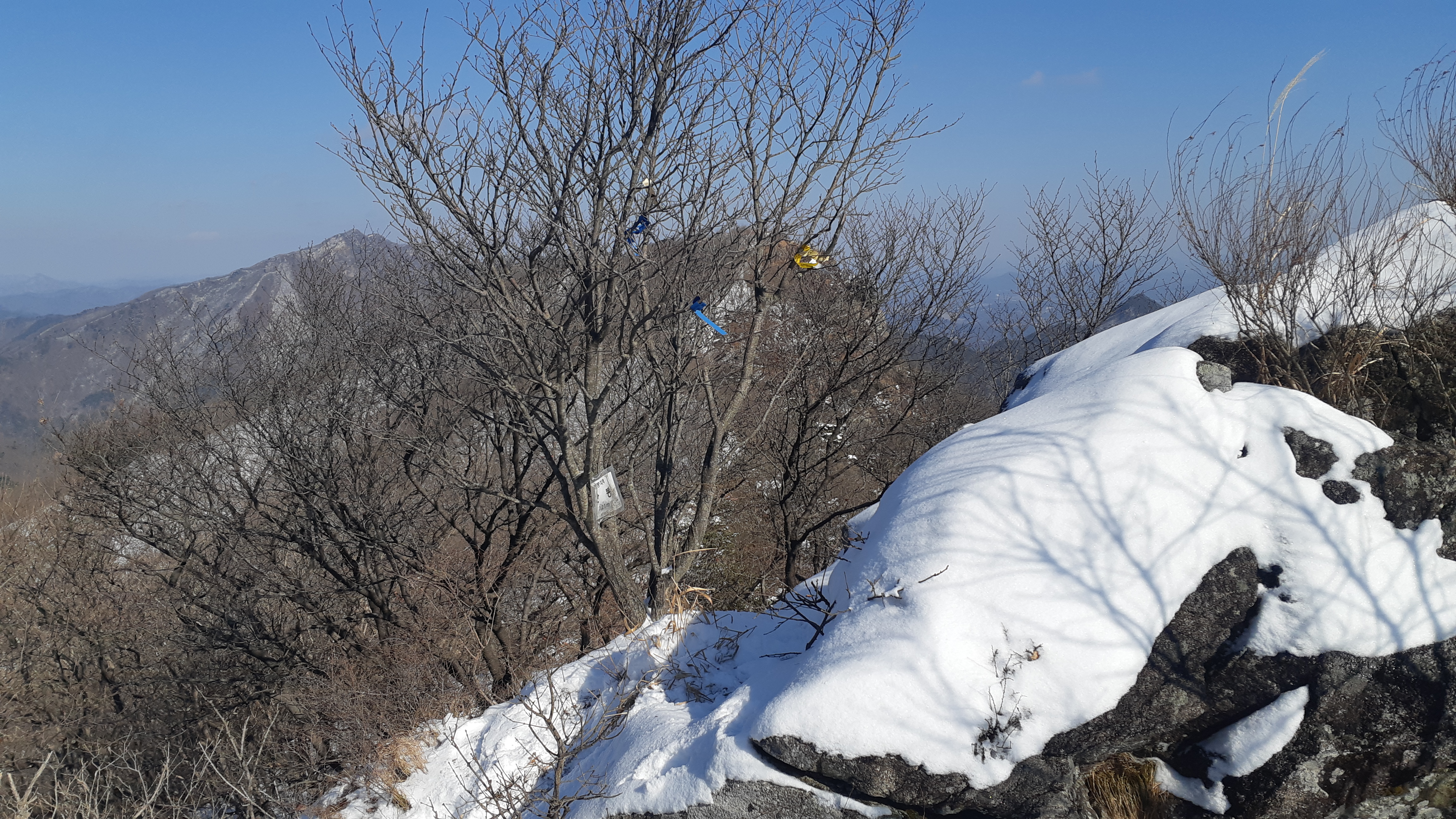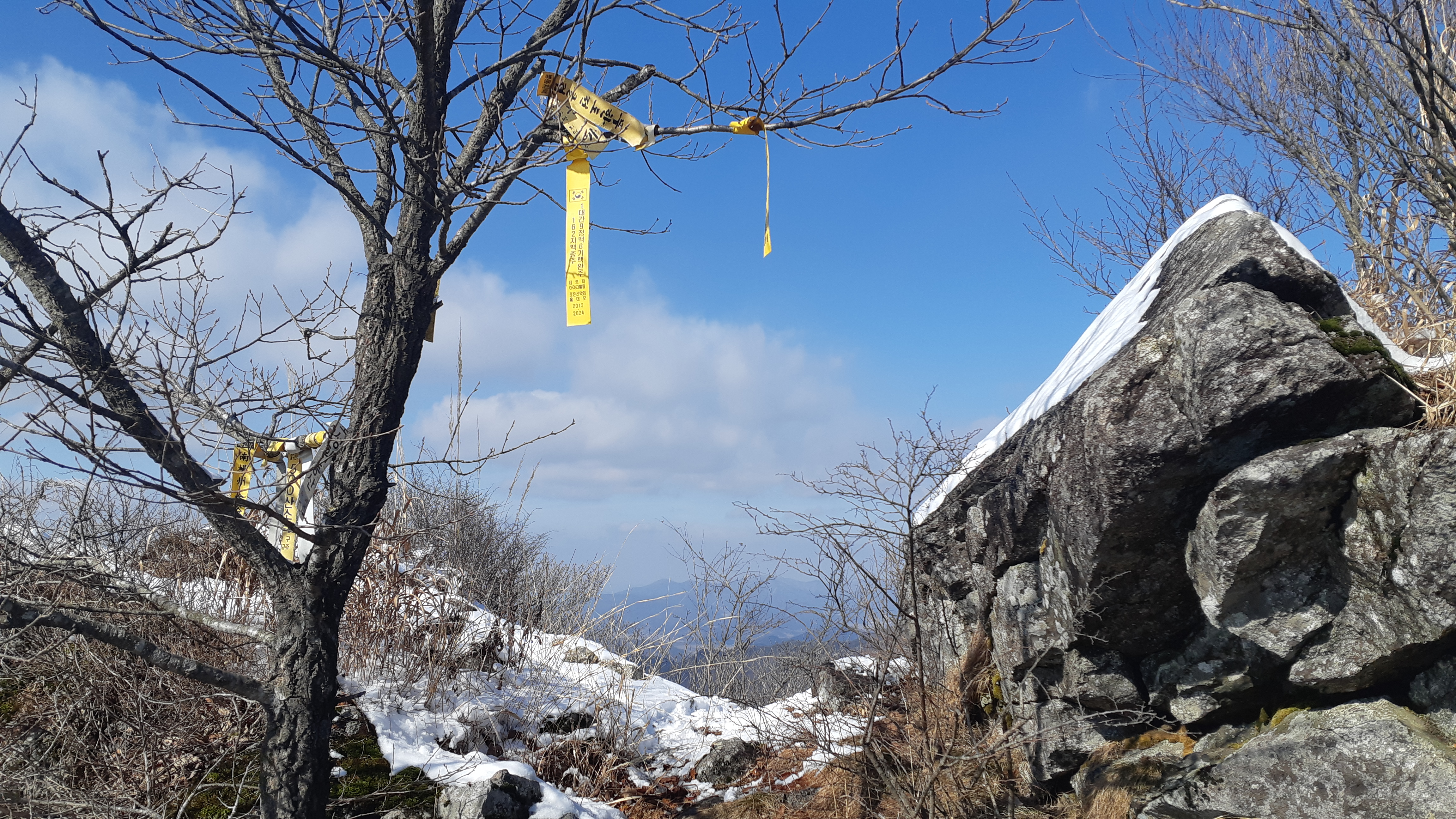 산행시작 25분여 이정표가 서있는 유탕사방댐 갈림길 능선에서 오른쪽으로 방향을 바꾸어 계속 오름길로 진행한다. 30여분 뒤 고도 581m인 병풍지맥 주능선 삼거리에 올라서고 왼쪽 깃대봉 방향으로 진행한다. 잠시 능선을 진행하면 오른쪽으로 넓은 들판이 펼쳐지고 소나무게 만장같이 주렁주렁 걸린 불태산(635.9m)에 닿는다. 정상 바로 아래 바람도 없는 양지바른 장소를 잡아 준비한 마가목 담금주를 반주삼아 점심을 먹는다. 뒤에 따라오던 산님들이 떠난 후 식사를 마치고 나도 길을 나선다. 잠시 진행하니 헬기장(604.2m)인데 삼삼오오 모여앉아 점심식사를 하시는 산님들을 뒤로하고 홀로 먼저 갓봉으로 진행한다.