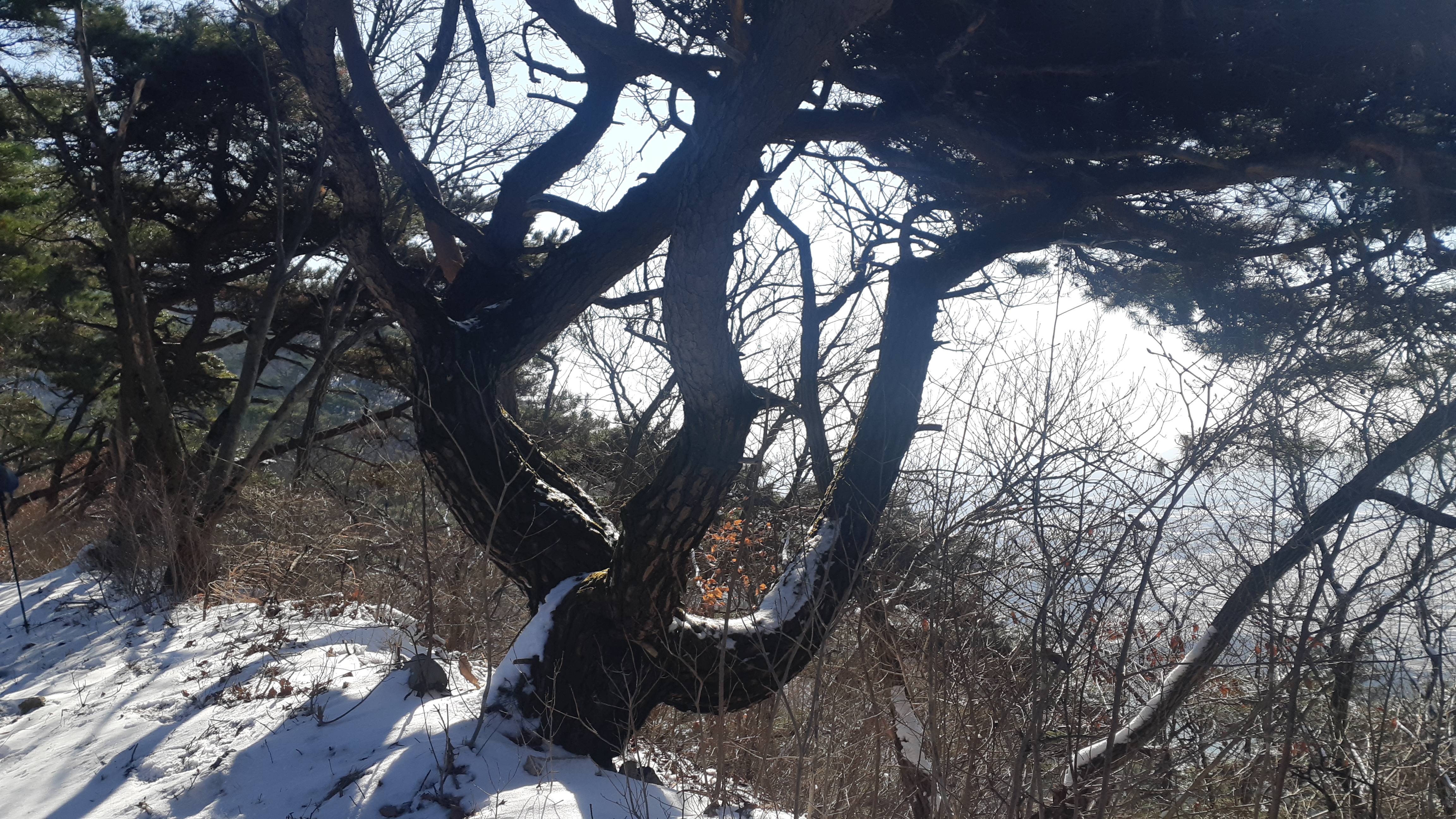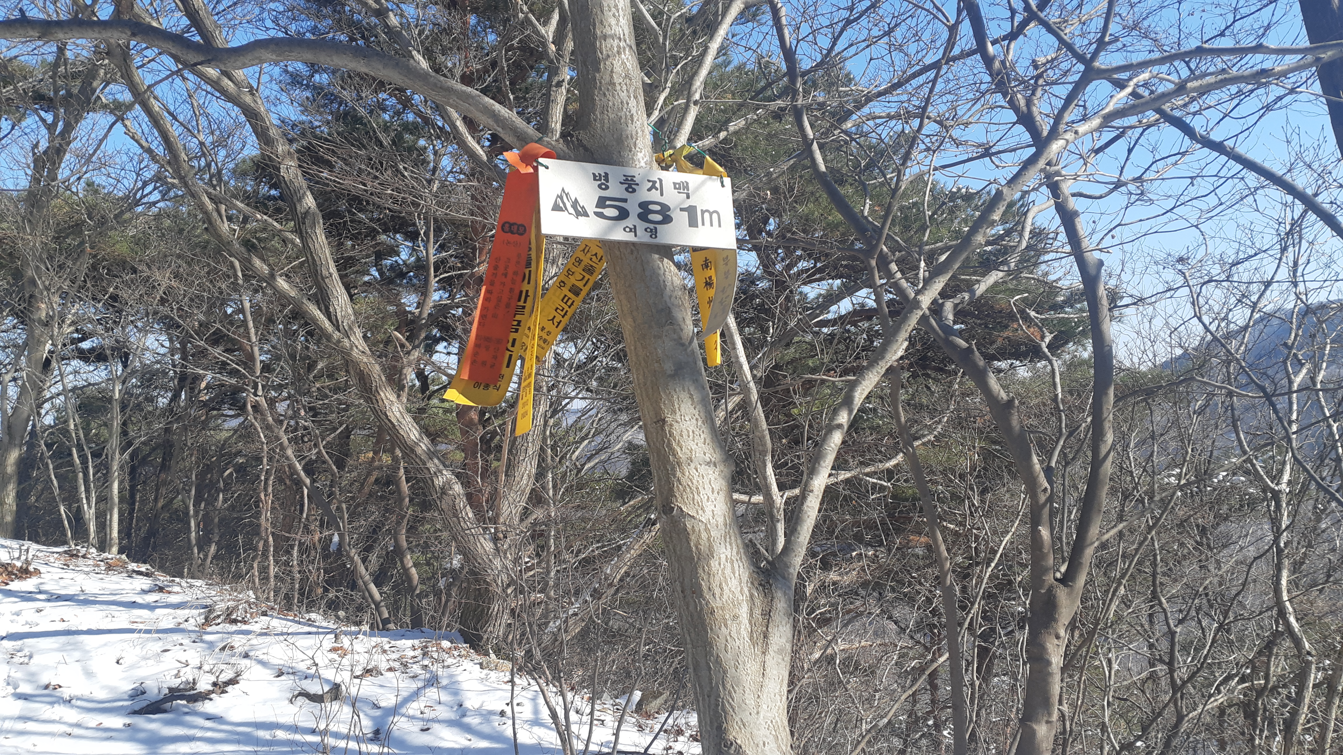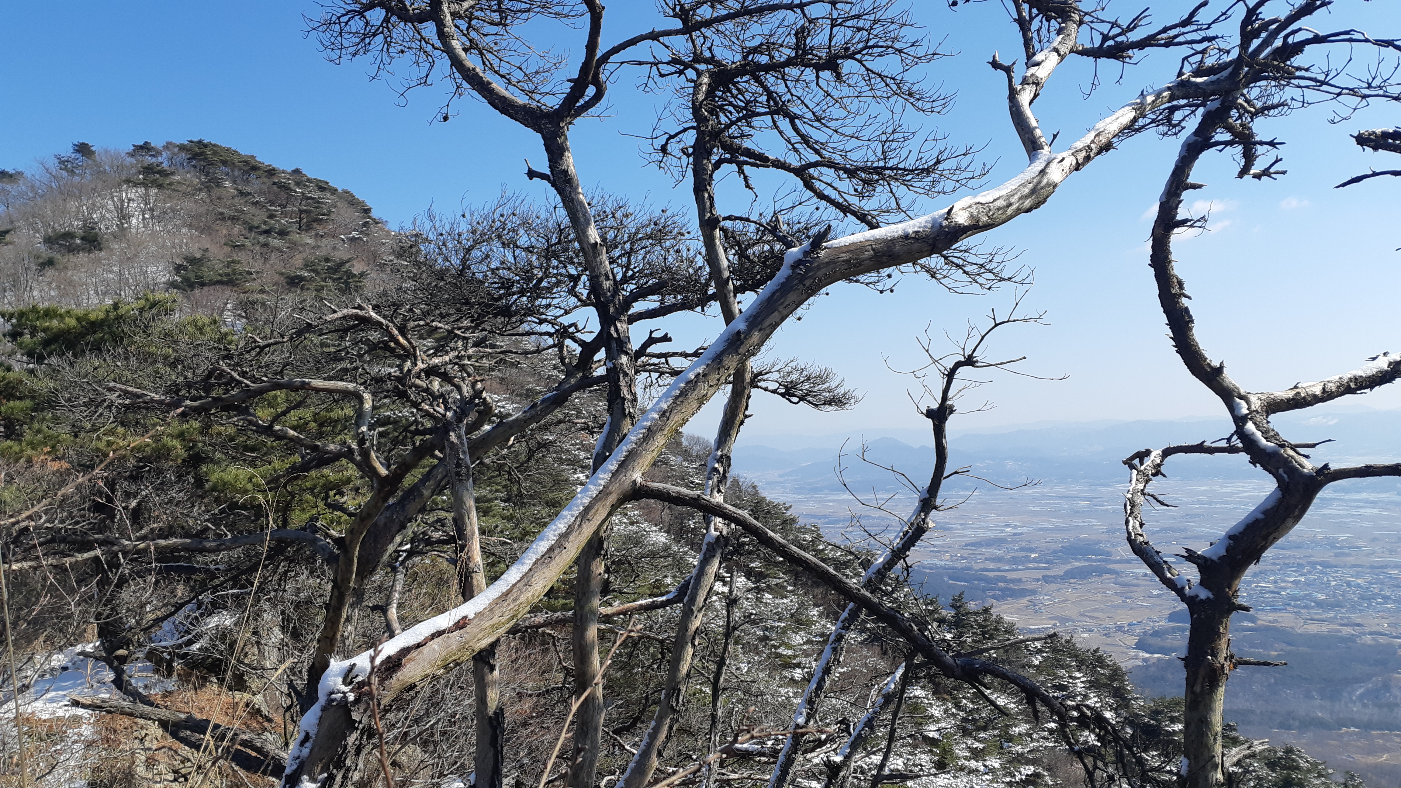 산행시작 25분여 이정표가 서있는 유탕사방댐 갈림길 능선에서 오른쪽으로 방향을 바꾸어 계속 오름길로 진행한다. 30여분 뒤 고도 581m인 병풍지맥 주능선 삼거리에 올라서고 왼쪽 깃대봉 방향으로 진행한다. 잠시 능선을 진행하면 오른쪽으로 넓은 들판이 펼쳐지고 소나무게 만장같이 주렁주렁 걸린 불태산(635.9m)에 닿는다. 정상 바로 아래 바람도 없는 양지바른 장소를 잡아 준비한 마가목 담금주를 반주삼아 점심을 먹는다. 뒤에 따라오던 산님들이 떠난 후 식사를 마치고 나도 길을 나선다. 잠시 진행하니 헬기장(604.2m)인데 삼삼오오 모여앉아 점심식사를 하시는 산님들을 뒤로하고 홀로 먼저 갓봉으로 진행한다.