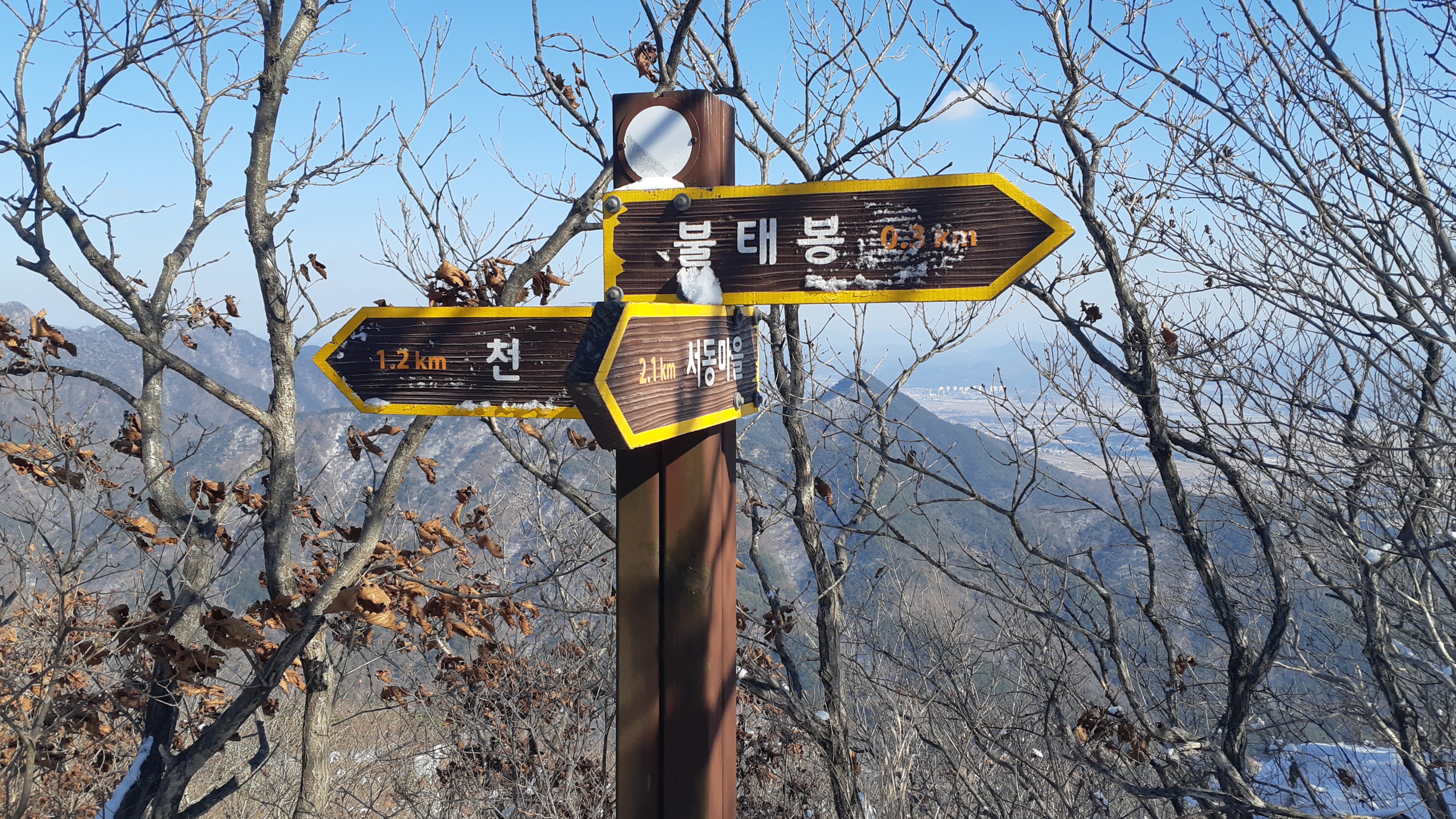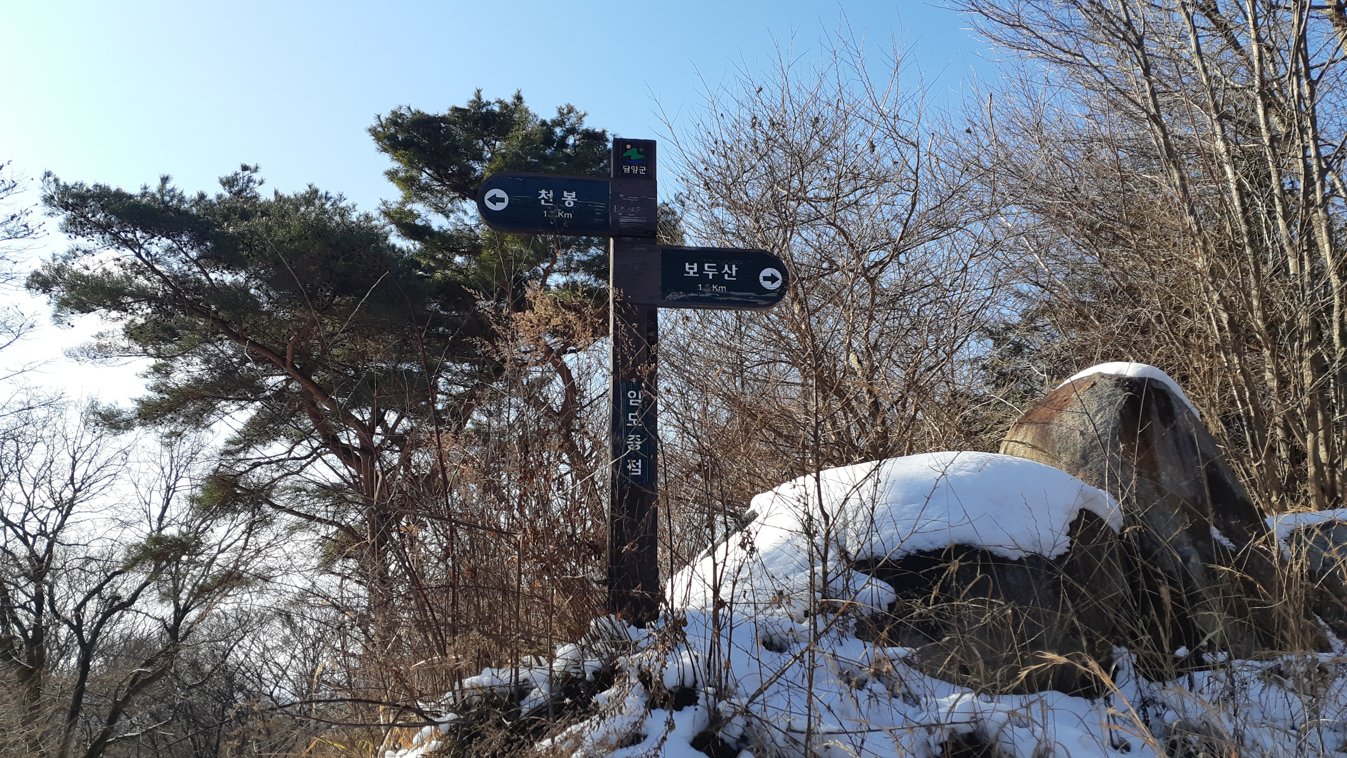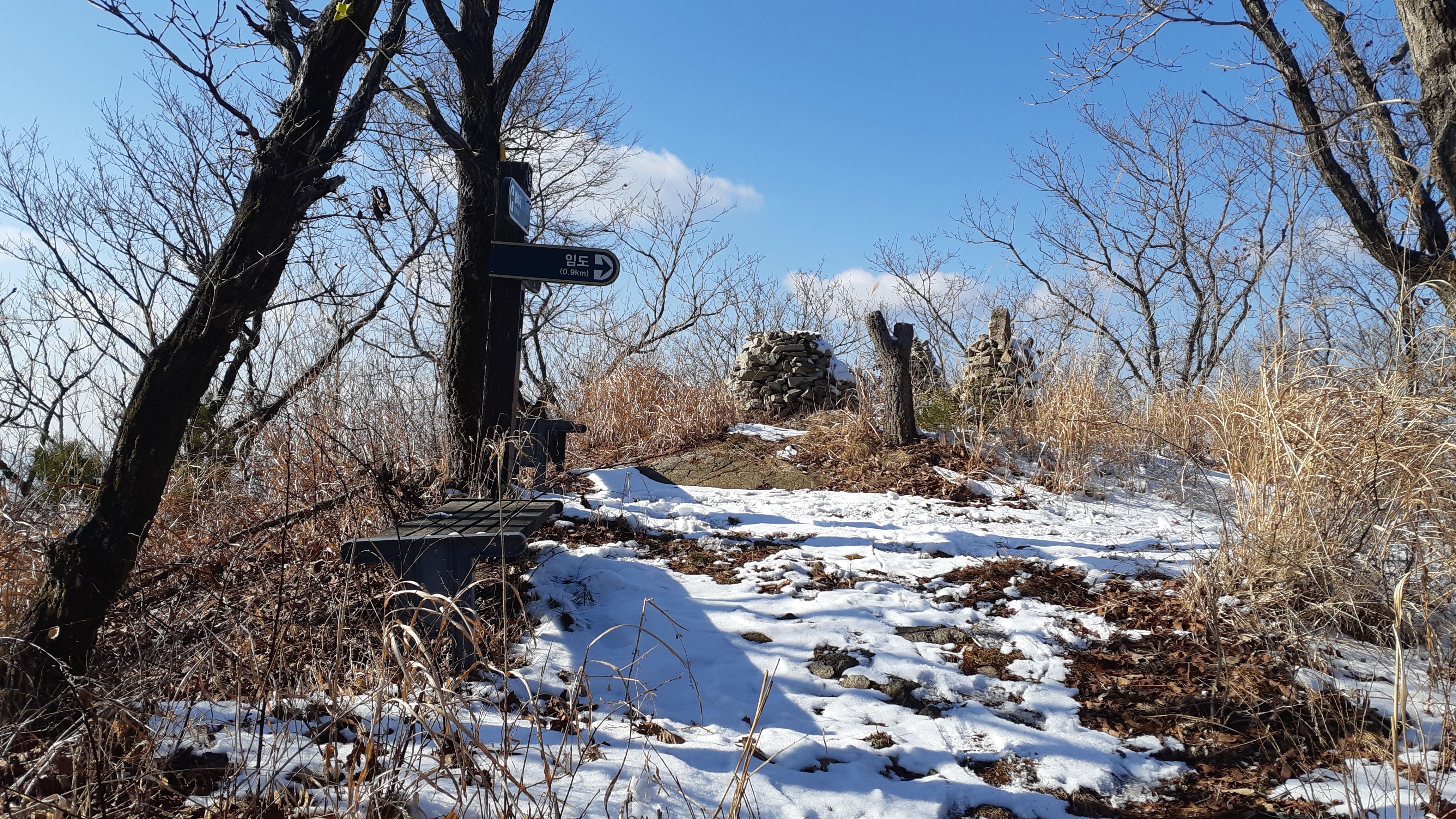 불태봉에서 잠시 내려서면 왼쪽으로 서동마을 갈림길 이정표가 나오는데 단축 산행을 하는 일부 산님들은 이곳으로 하산하겠지만 아무도 눈을 밟지는 않았다. 직진해서 한동안 내려서면 또 다른 이정표가 세워져 있는데 오른쪽 한재골 갈림길이다. 이정표 기둥에 불태재라고 하였지만 지도상의 불태재는 좀 아래쪽에 위치한다. 다시금 오름길로 바뀌고 20여분 걸려 두어 고비 올려치면 천봉(698m) 정상이다. 정상에는 이정표와 여영님의 팻말과 돌탑 몇 쌓아놓았다.