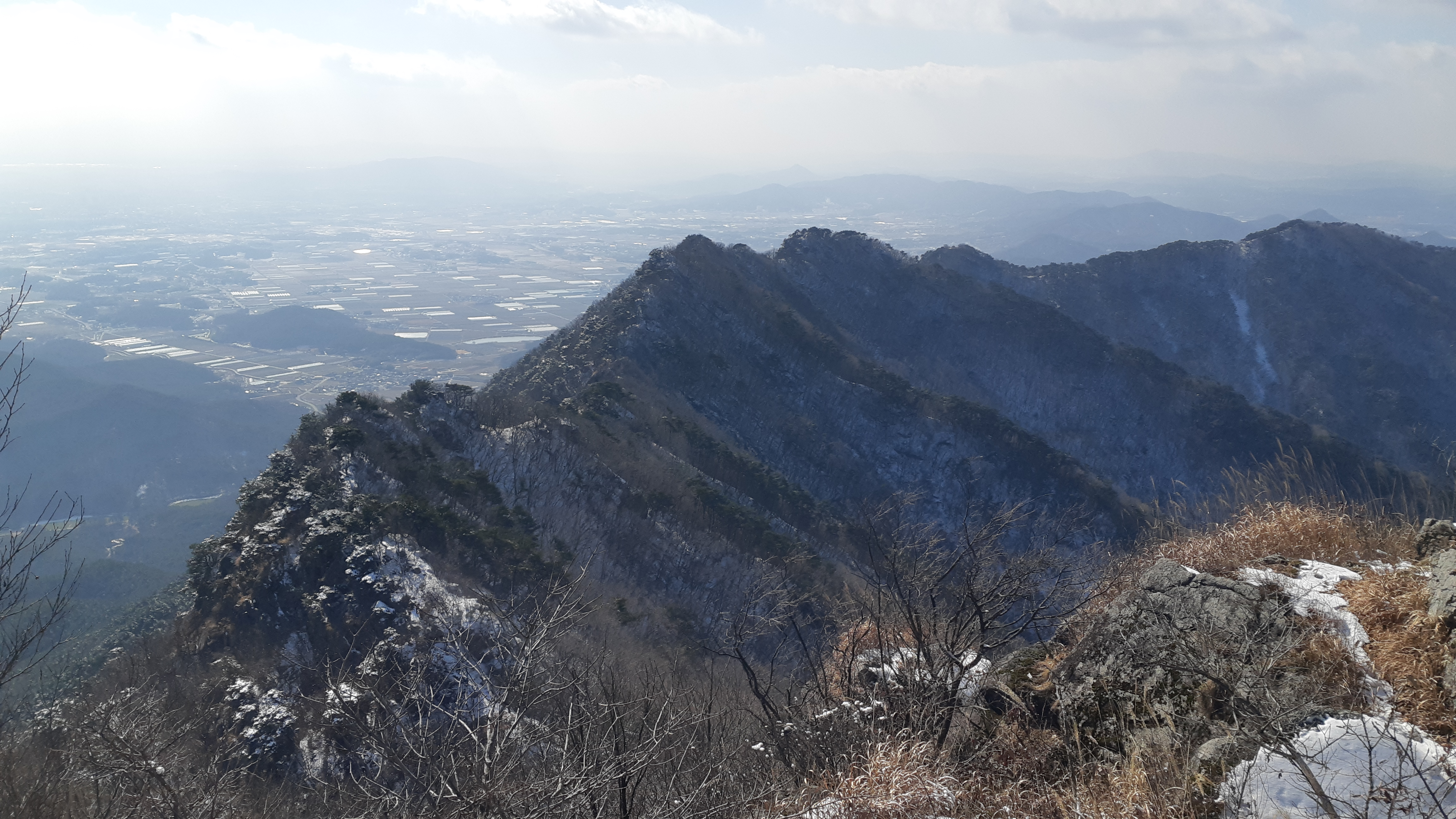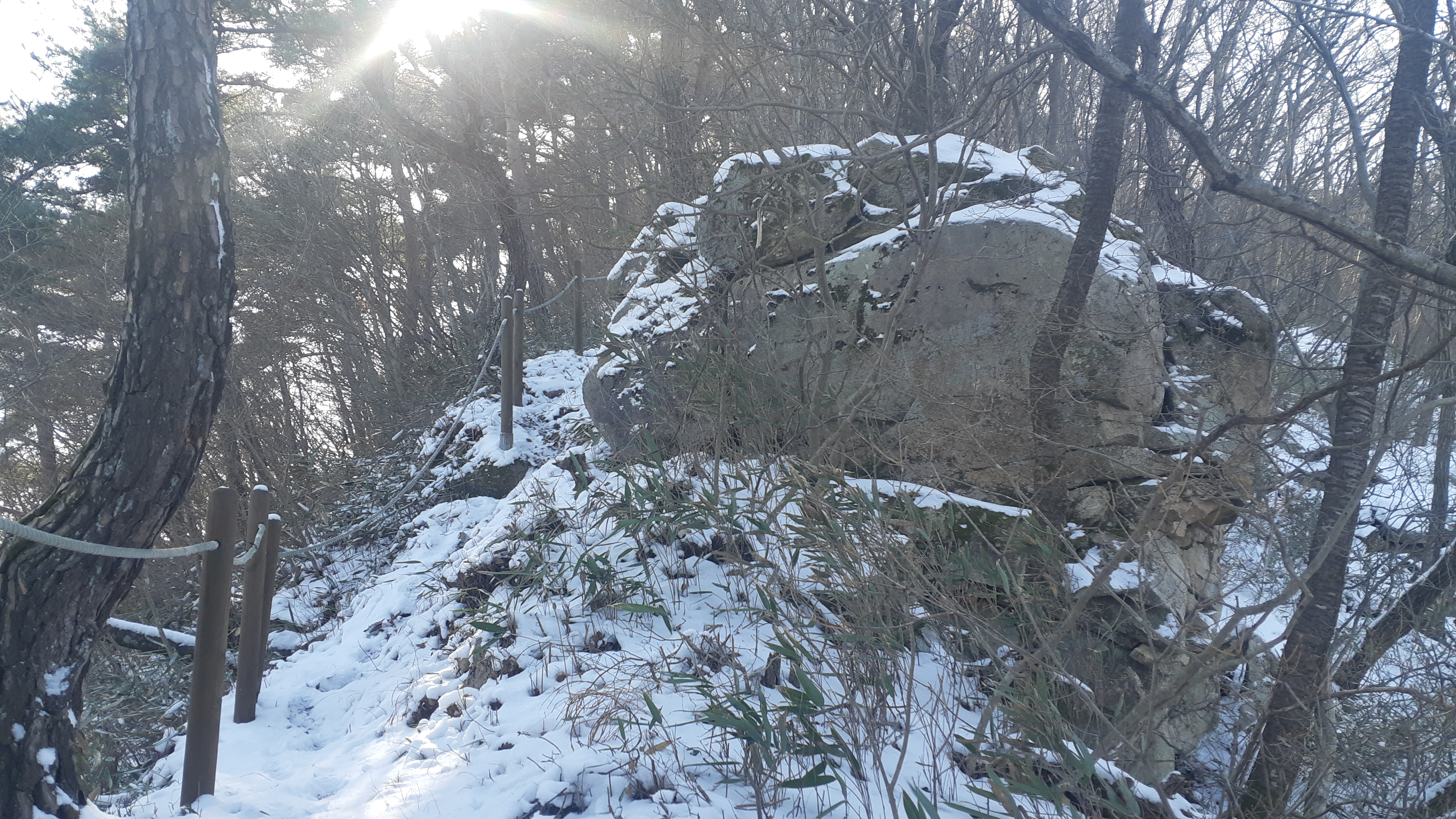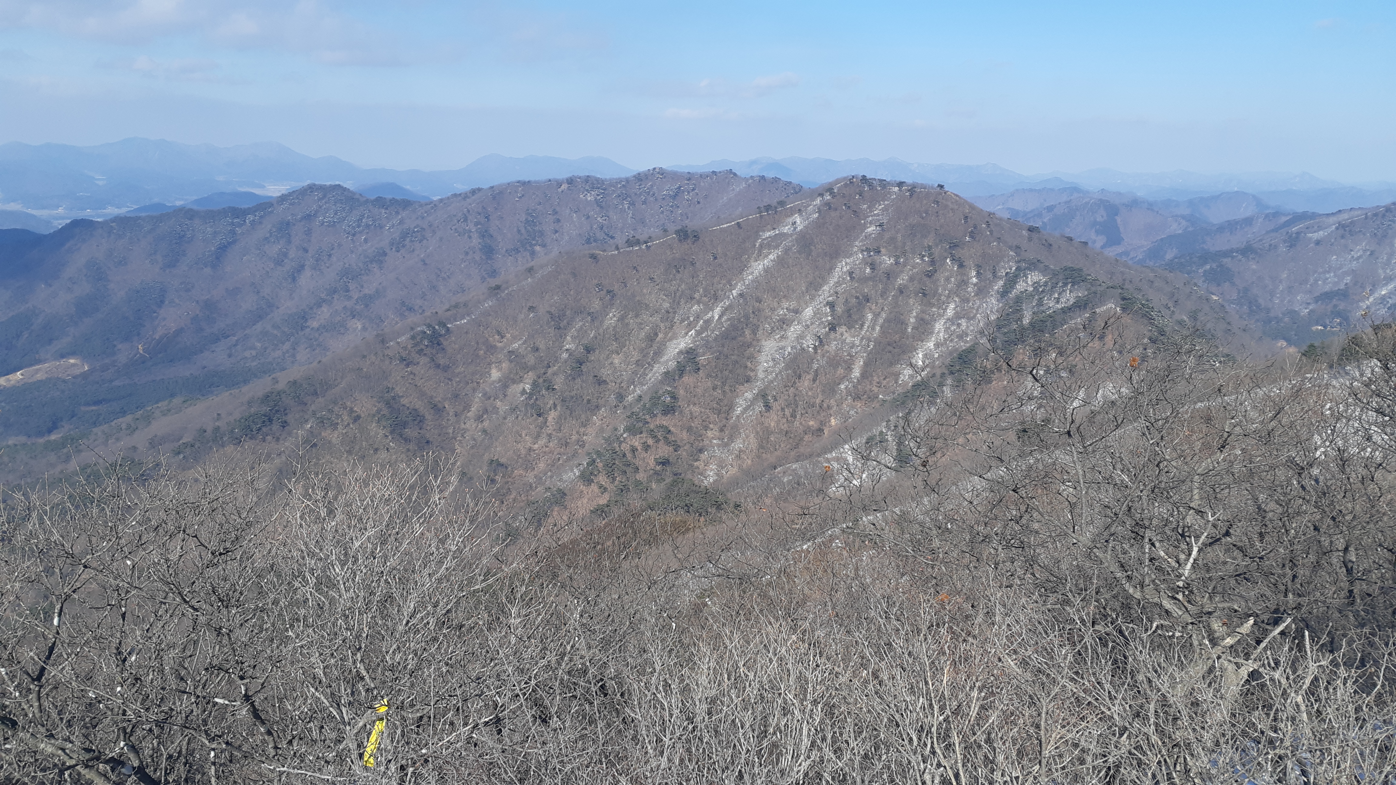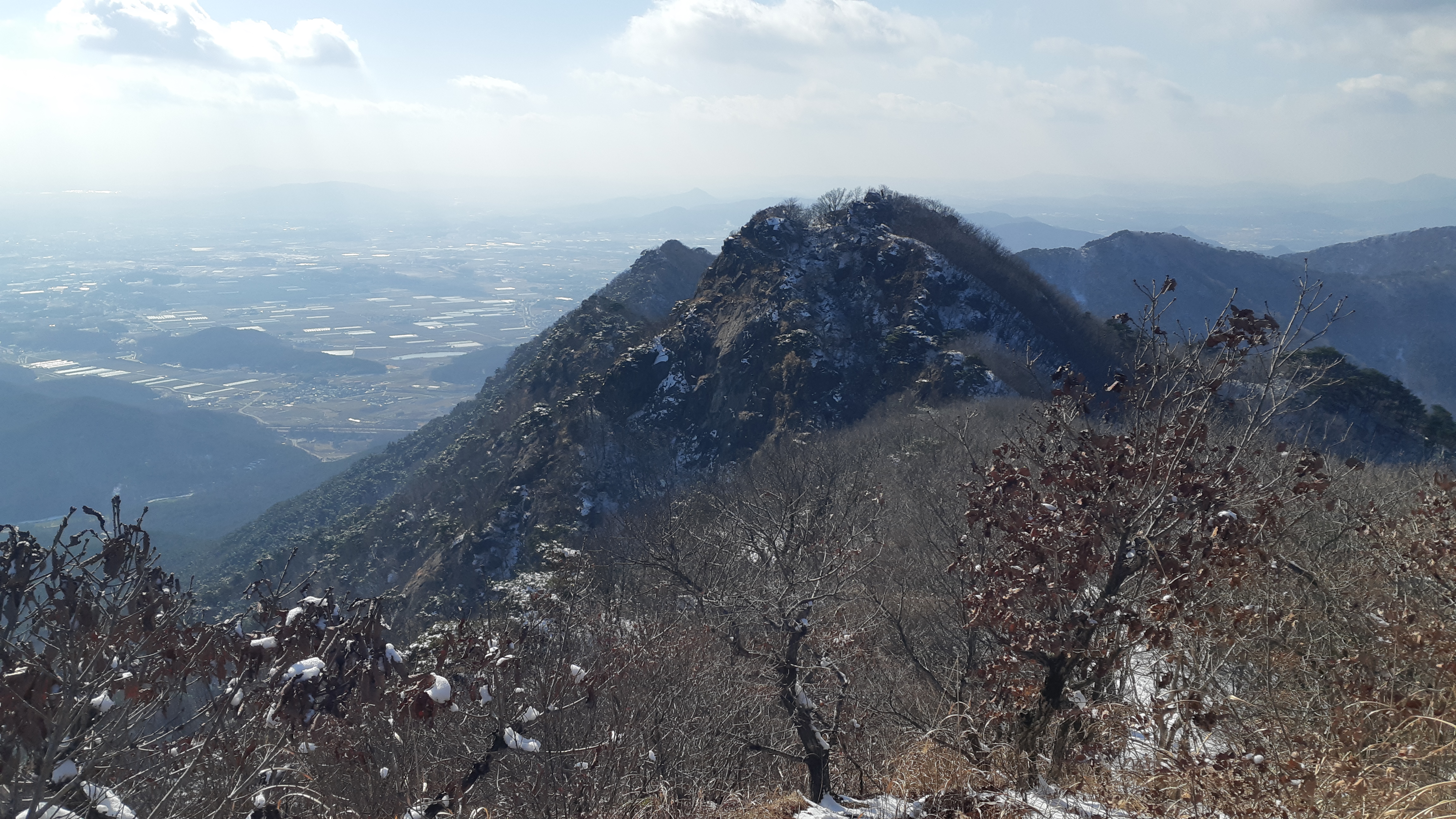 오른쪽으로 조망이 열리면서 멀리 무등산도 희미하게나마 선보인다. 가파른 암릉길에 로프가 걸려있다만 혹시나 로프가 낡아서 끊어질까 걱정도 앞서며 위험을 느끼곤 한다. 두 번째 봉인 갓봉(721m)에 올라서고 미끄러운 등로를 왼쪽으로 휘돌아 내려선다. 오르는 양지에는 내린 눈들이 녹았지만 내리막길인 음지에는 제법 많은 눈이 쌓여있어 조심스레 내려간다. 정상석이 서있는 불태봉(729m)에 올라선다. 불태봉 정산에 서니 주위의 산세가 수려하고 조망 또한 뛰어나다.