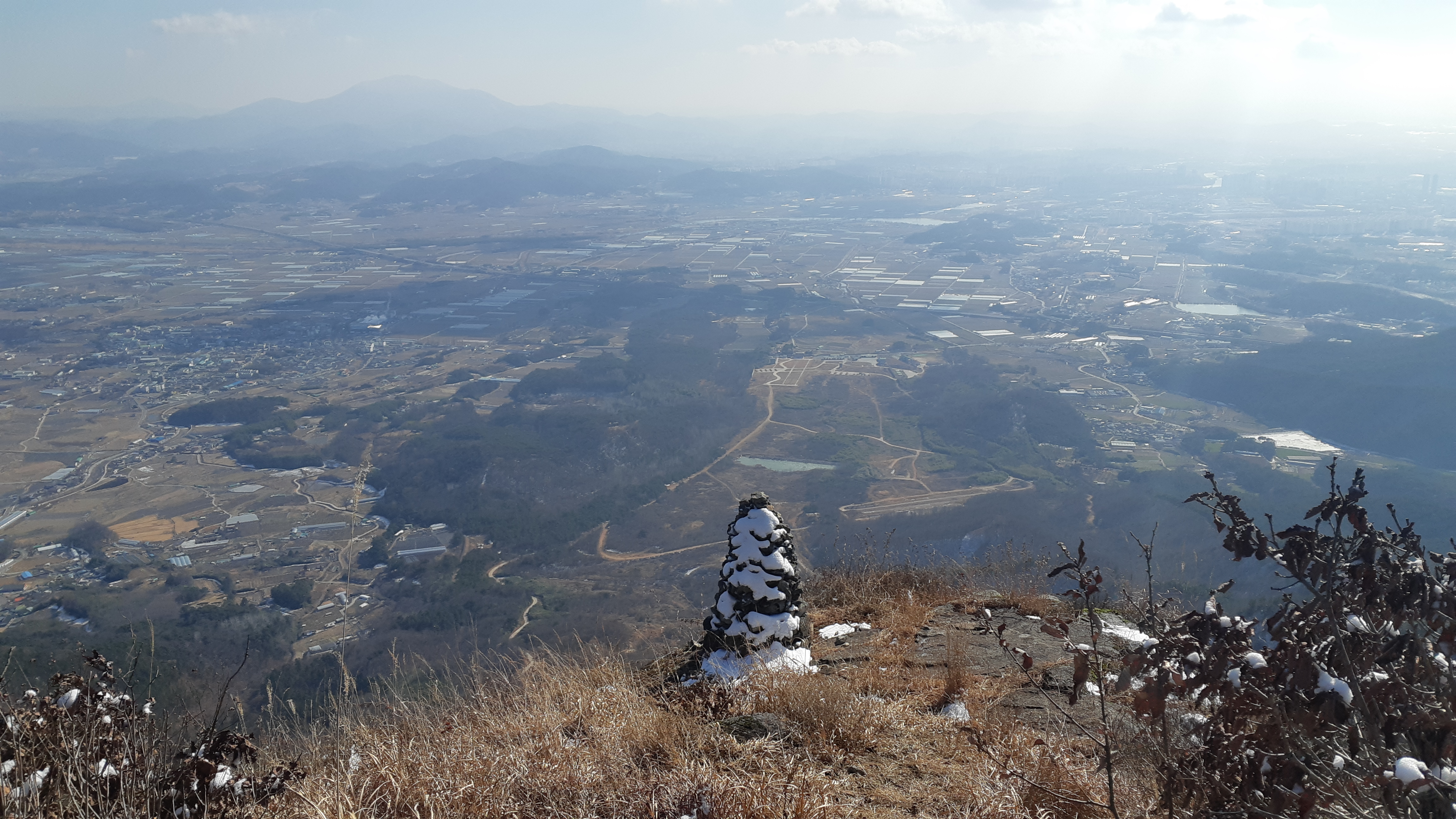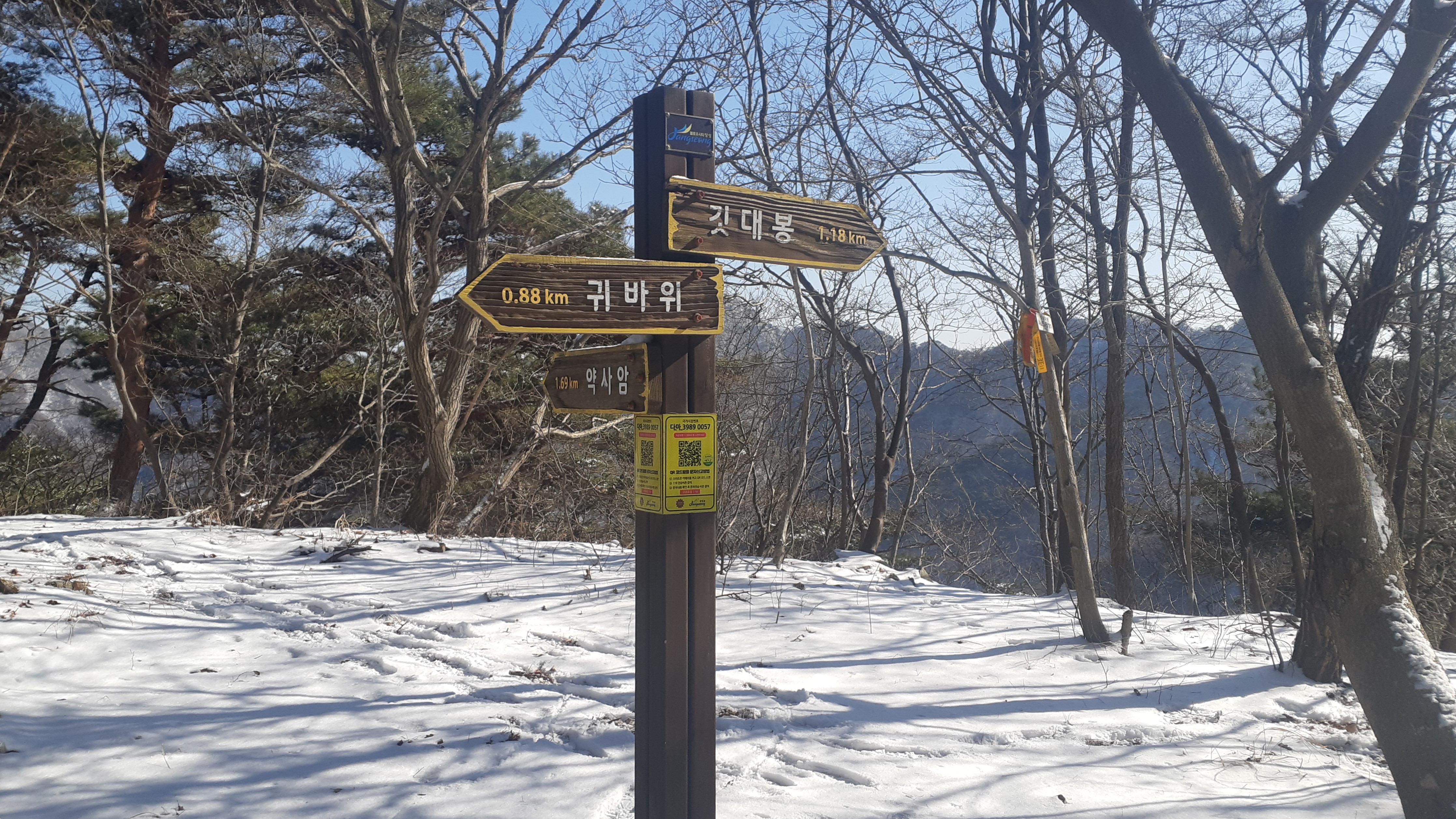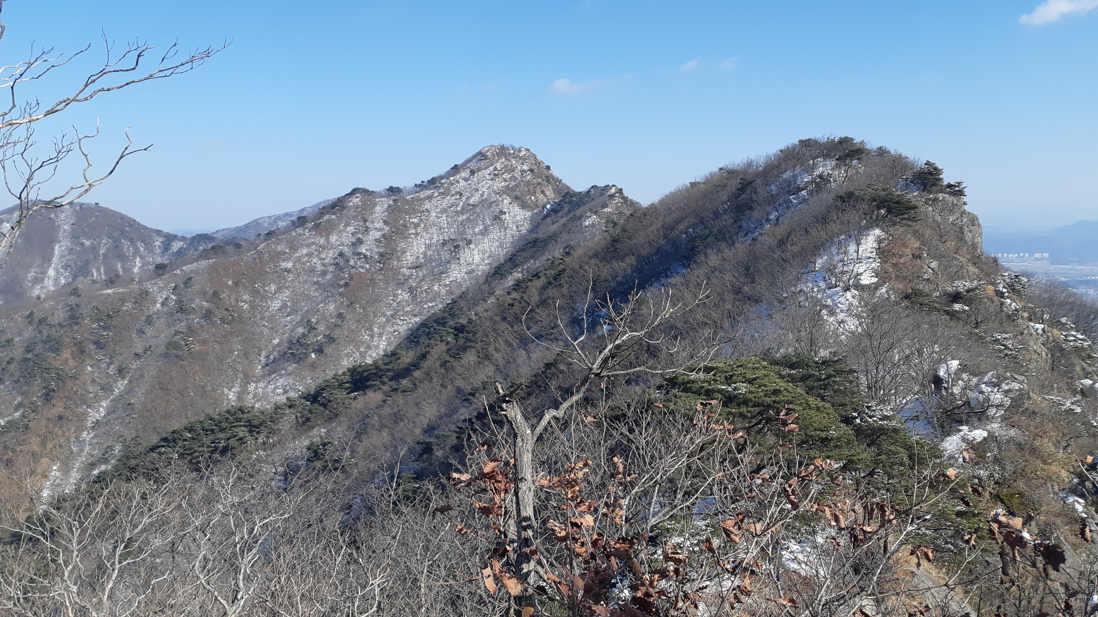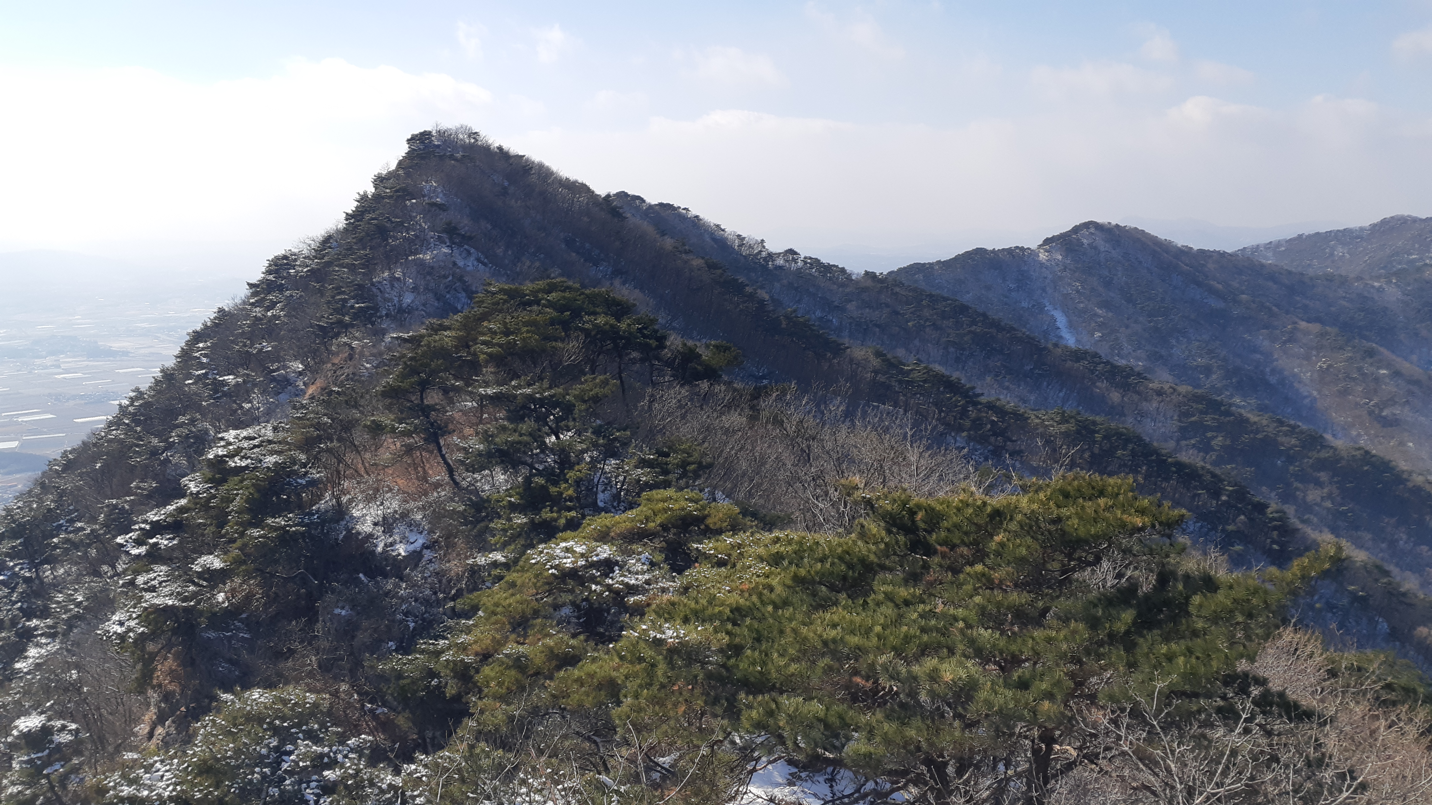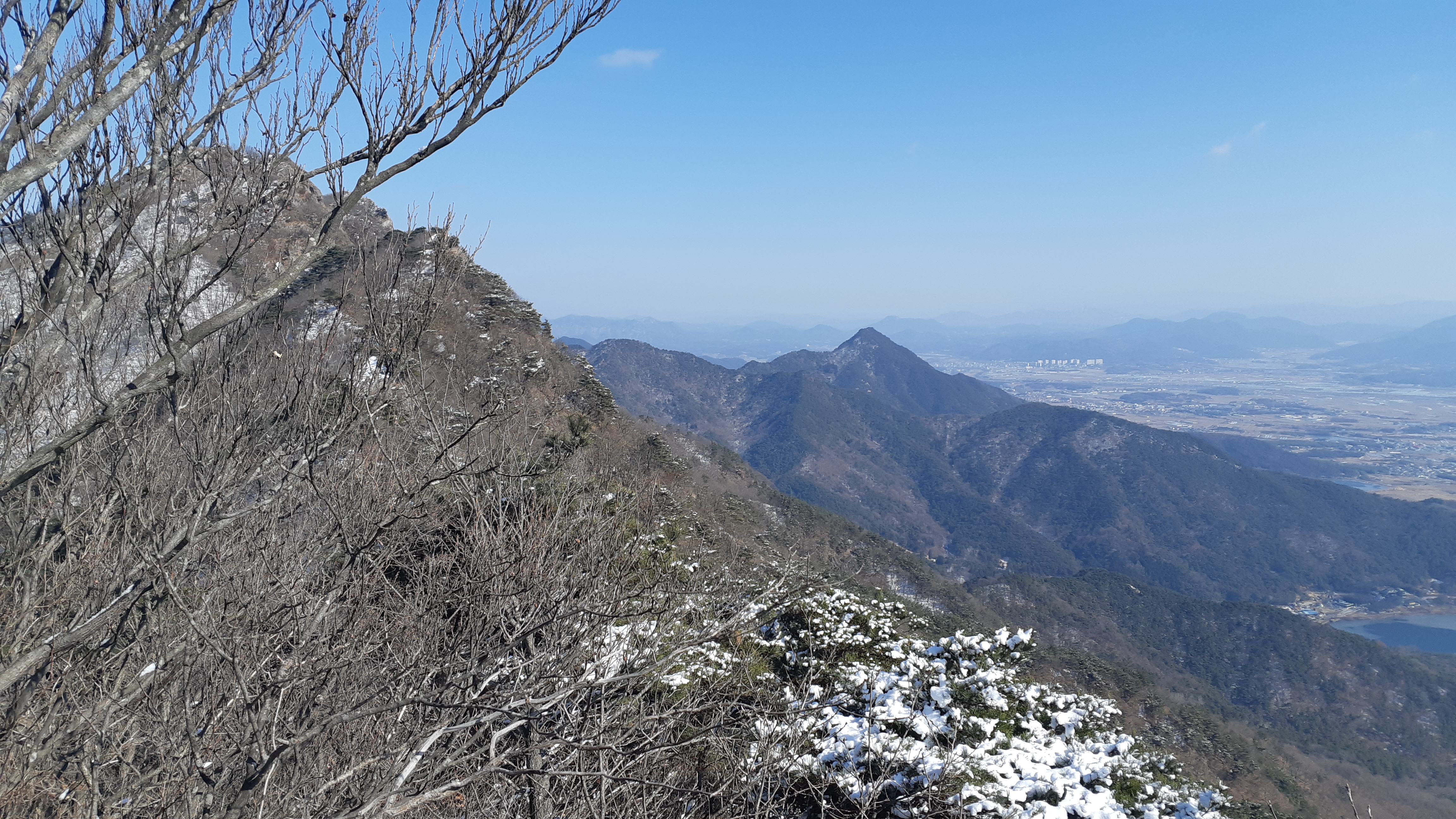 오른쪽으로 조망이 열리면서 멀리 무등산도 희미하게나마 선보인다. 가파른 암릉길에 로프가 걸려있다만 혹시나 로프가 낡아서 끊어질까 걱정도 앞서며 위험을 느끼곤 한다. 두 번째 봉인 갓봉(721m)에 올라서고 미끄러운 등로를 왼쪽으로 휘돌아 내려선다. 오르는 양지에는 내린 눈들이 녹았지만 내리막길인 음지에는 제법 많은 눈이 쌓여있어 조심스레 내려간다. 정상석이 서있는 불태봉(729m)에 올라선다. 불태봉 정산에 서니 주위의 산세가 수려하고 조망 또한 뛰어나다.