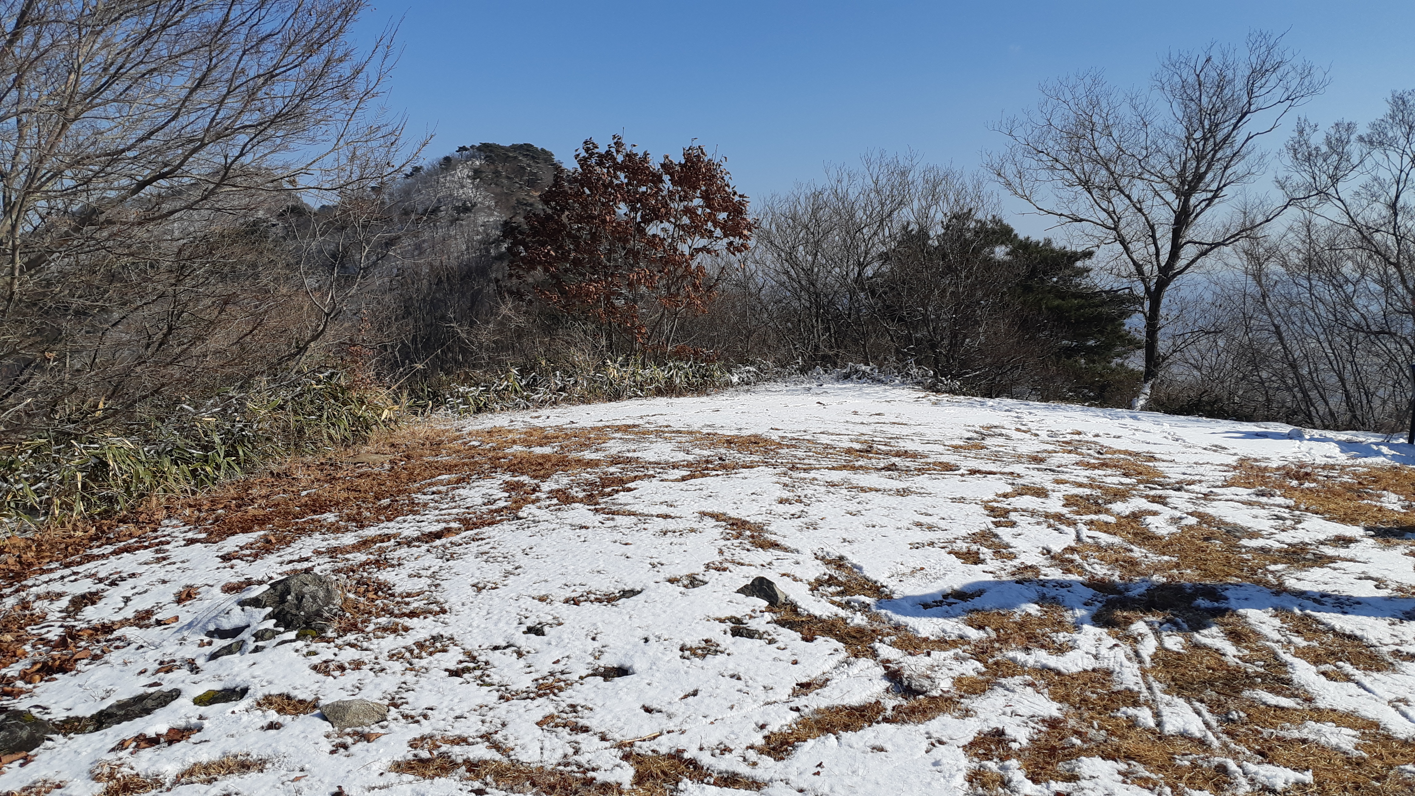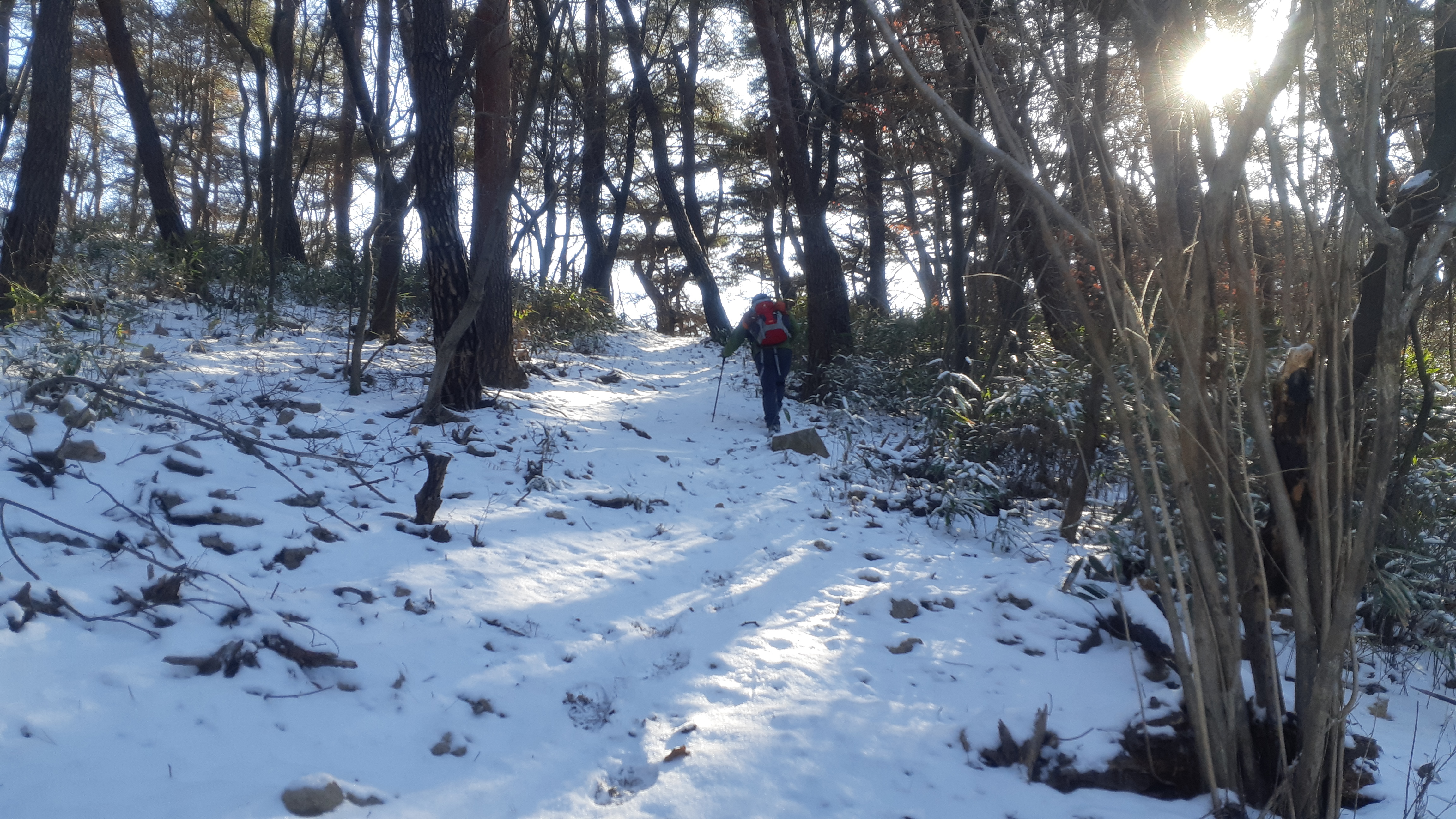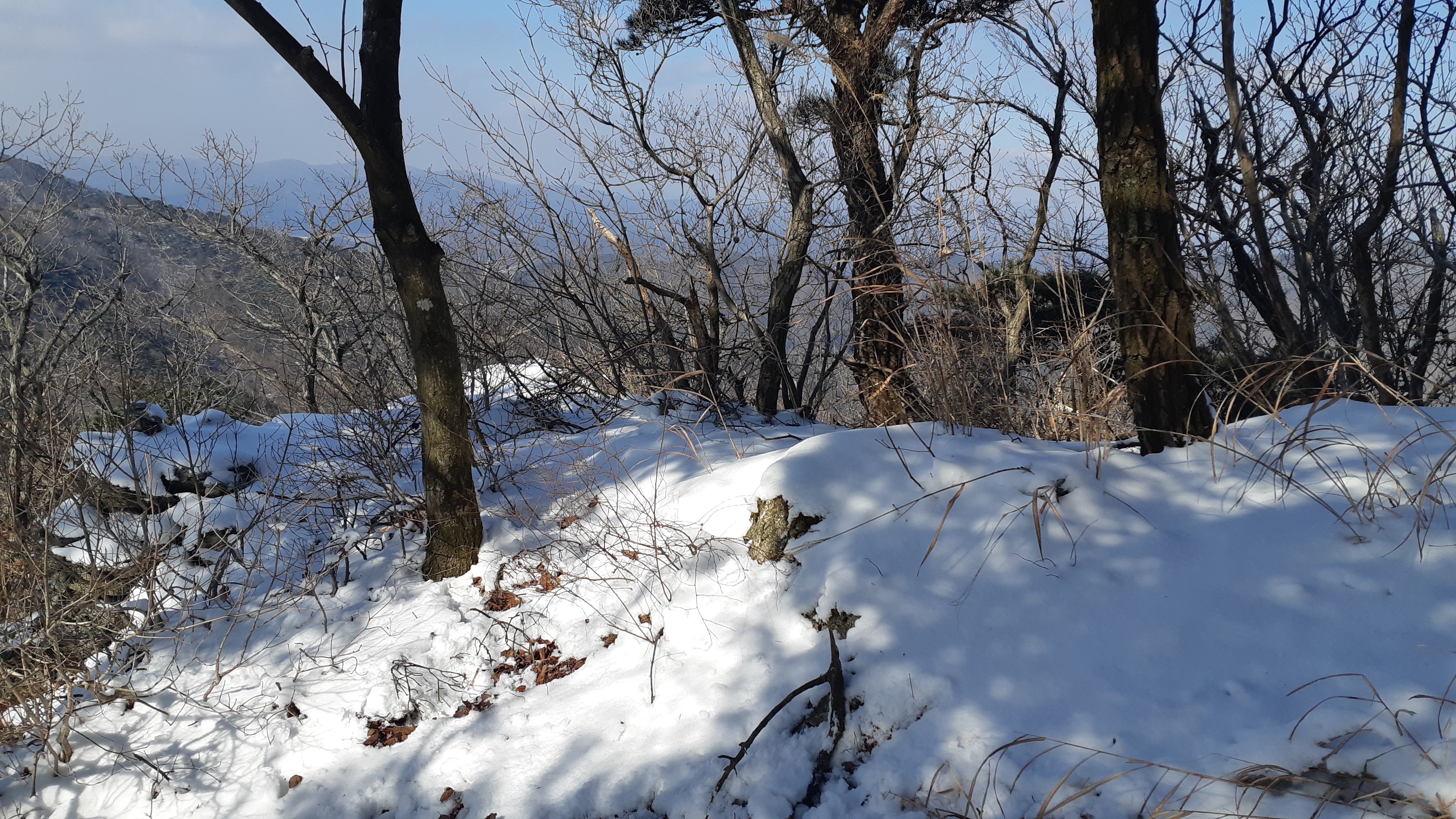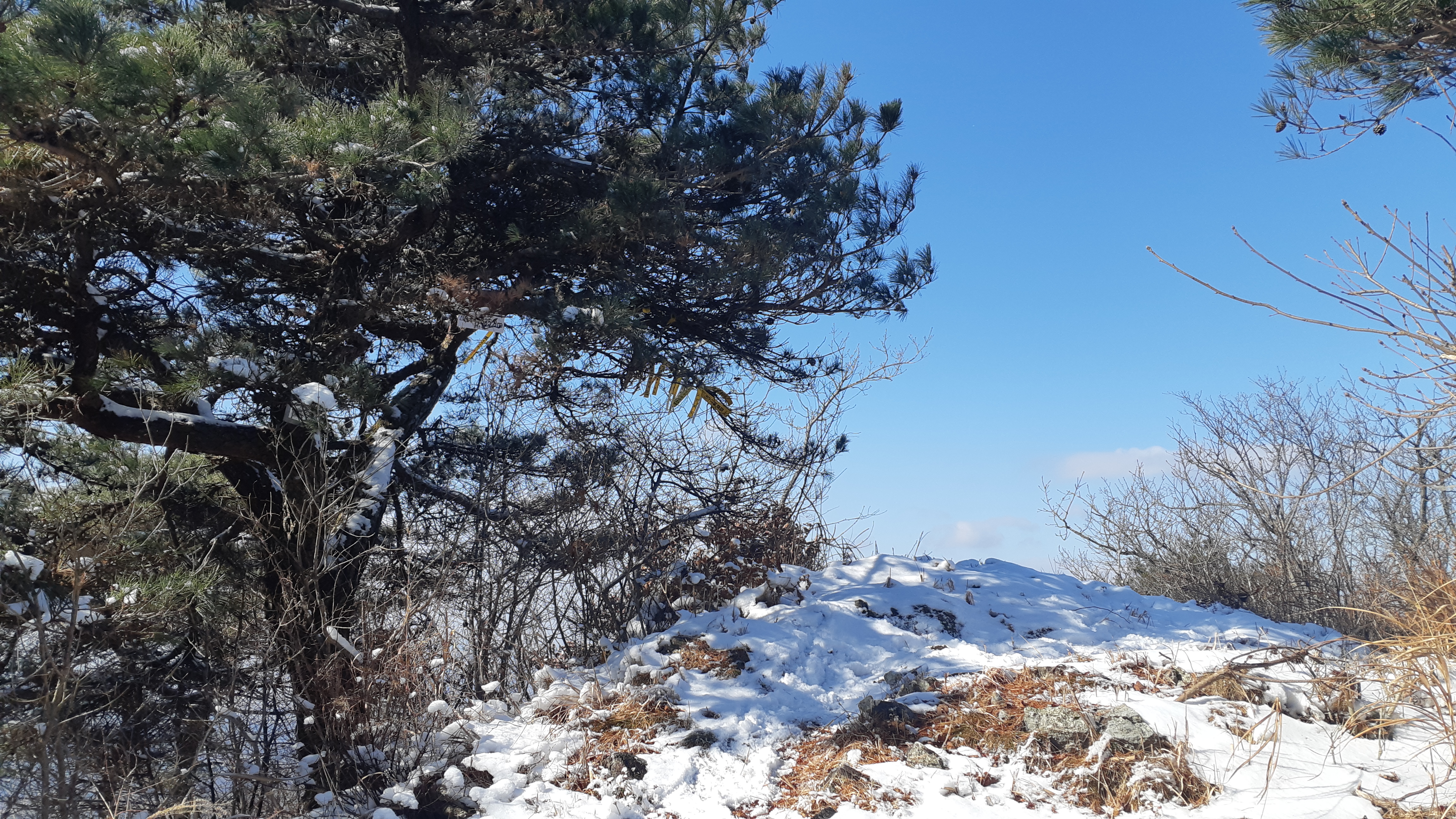 양지쪽이라 눈이 녹아 별 어려움 없이 오를 수 있는 갓봉(13:20)