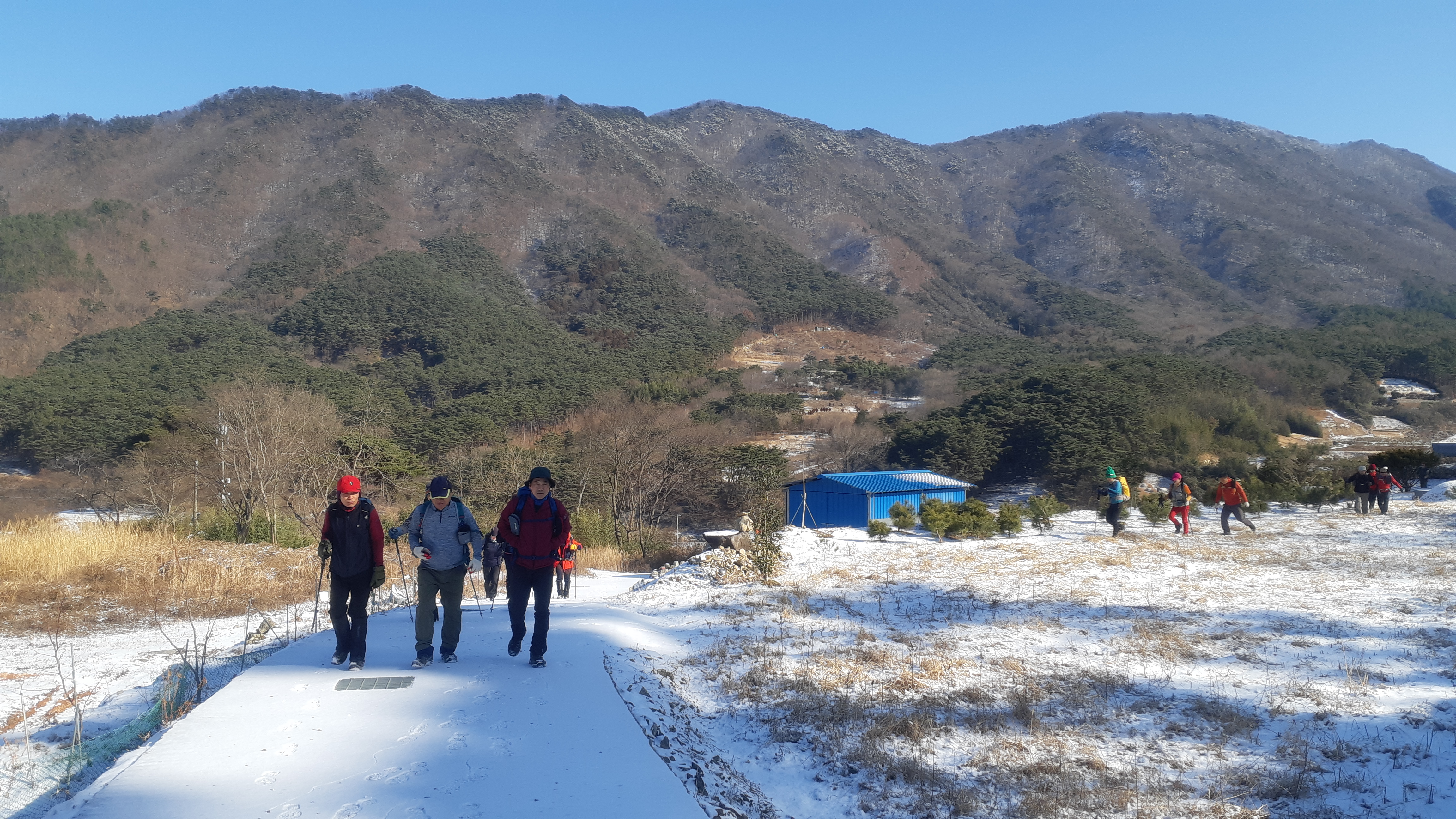 오늘은 올해 들어 처음 부산푸르나산악회를 따라 장성군 장성읍과 담양군 대전면에 위치한 불태산~갓봉~불태봉~천봉으로 간다. 오늘 찾는 이곳은 병풍지맥의 한 자락이지만 아직 미답의 곳이기도 하여 그 산행의미가 높다고 하겠다. 부산 동래에서 아침 7시15분에 출발한 버스가 약3시간20여분 걸려 장성읍 유탕리 서동정앞에 도착한다. 바로 산행채비 후 눈 쌓인 들머리로 향한다. 임도를 올라서니 석물(石物)이 설치되어있는 잘 가꾸어진 첨지중추부사순천박공묘(僉知中樞府事順天朴公墓)를 지나면서 본격적인 산행이 시작된다.