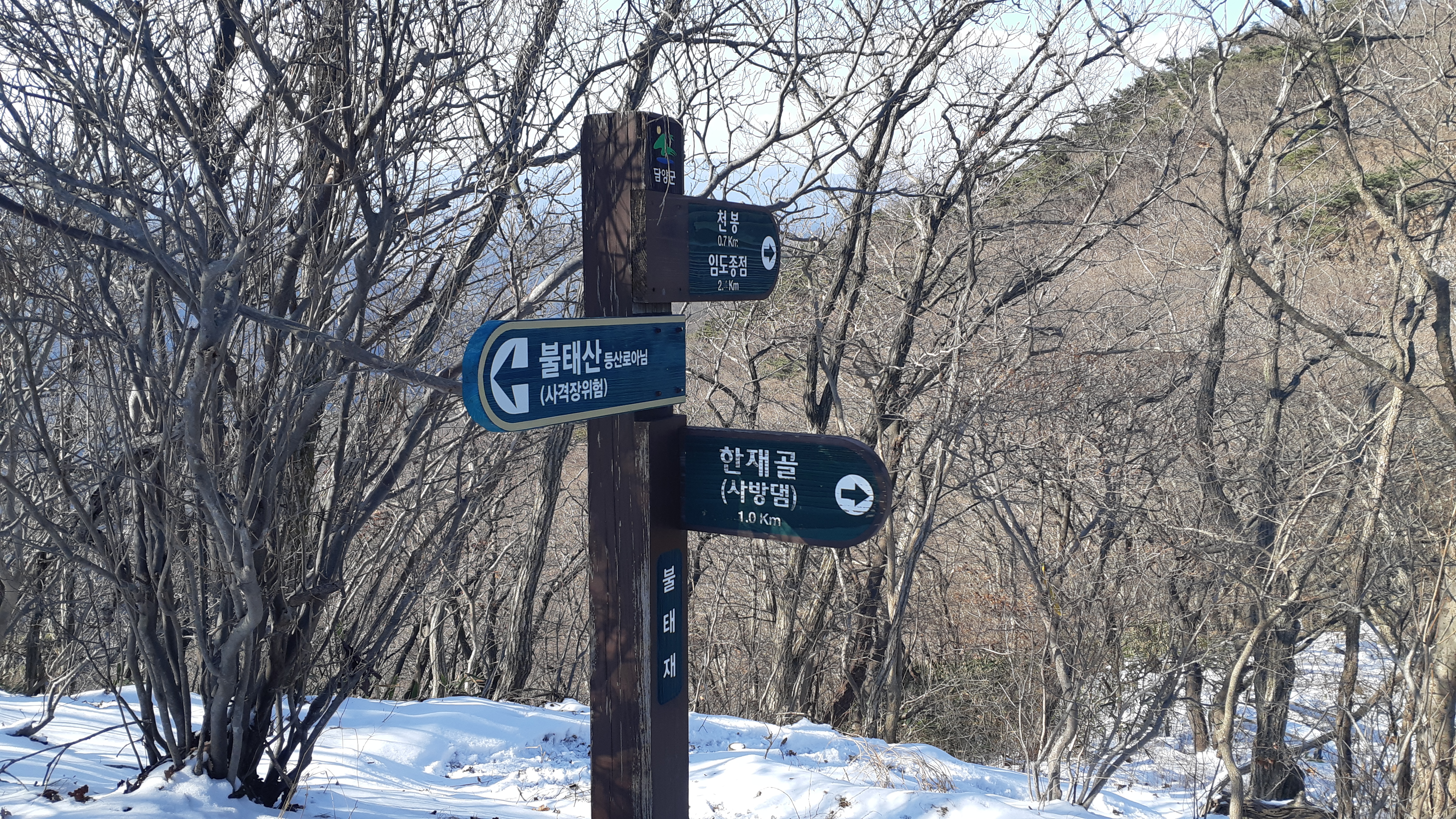 오른쪽 한재골 갈림길의 이정표(14:11)