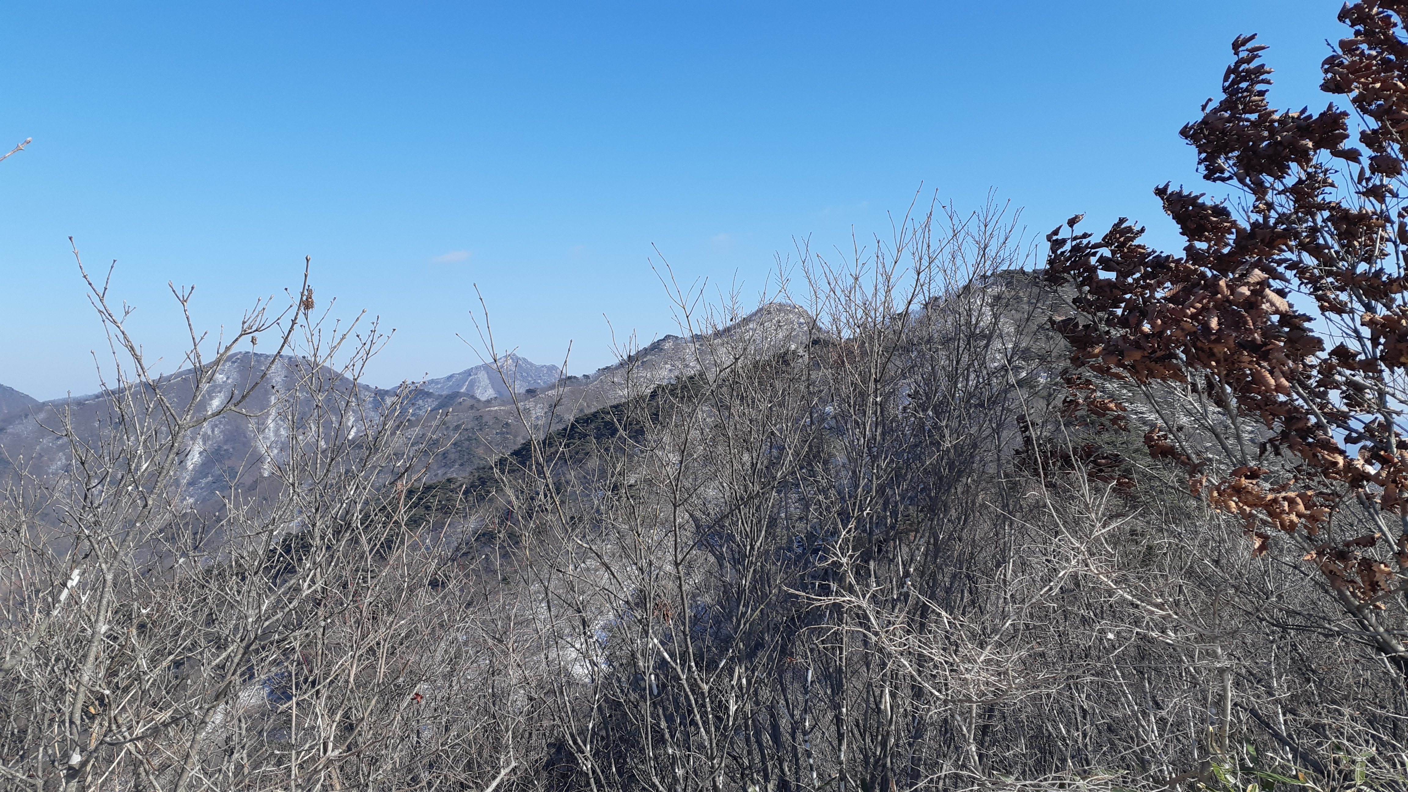 갓봉 정상에서 내려다본 불태산과 지나온 능선(13:32)