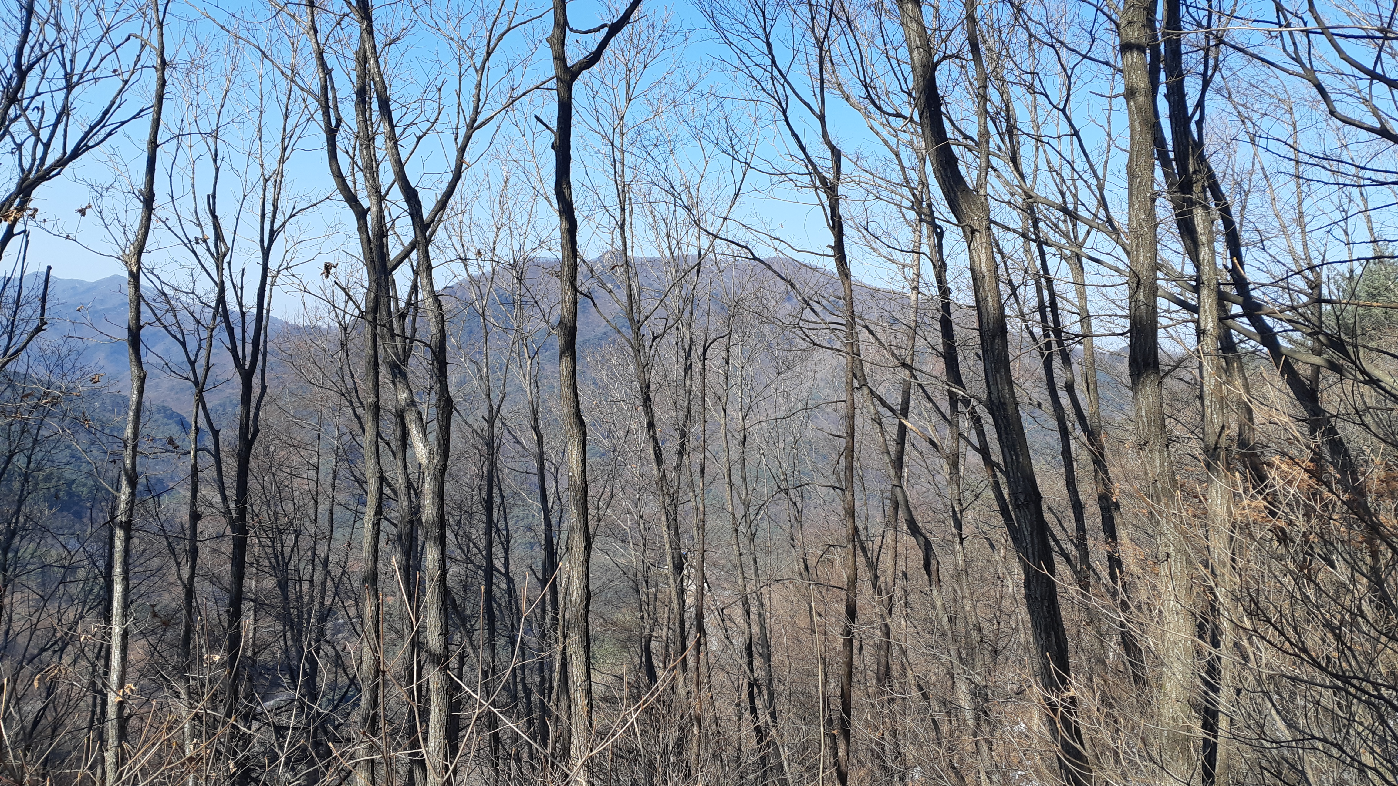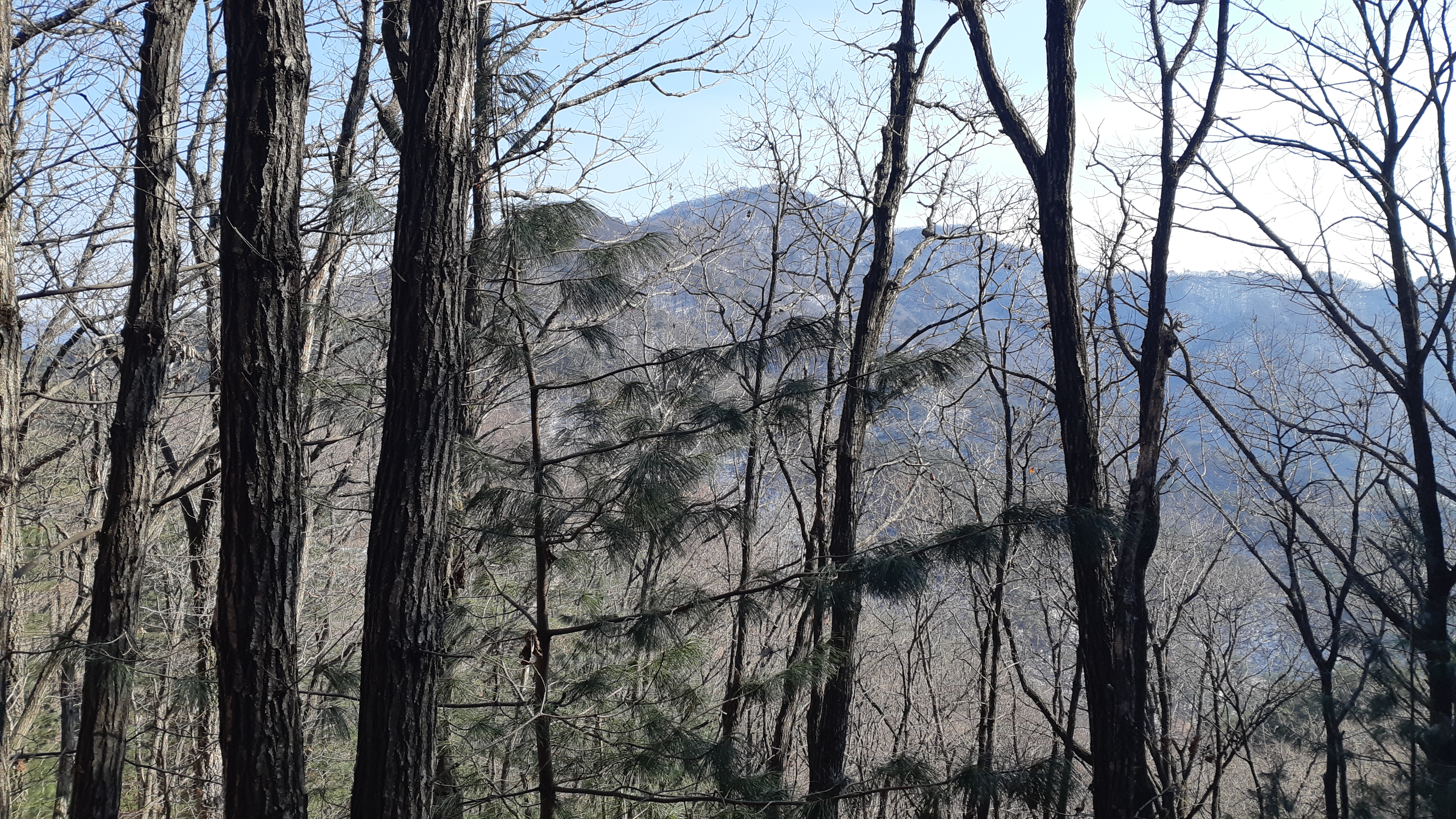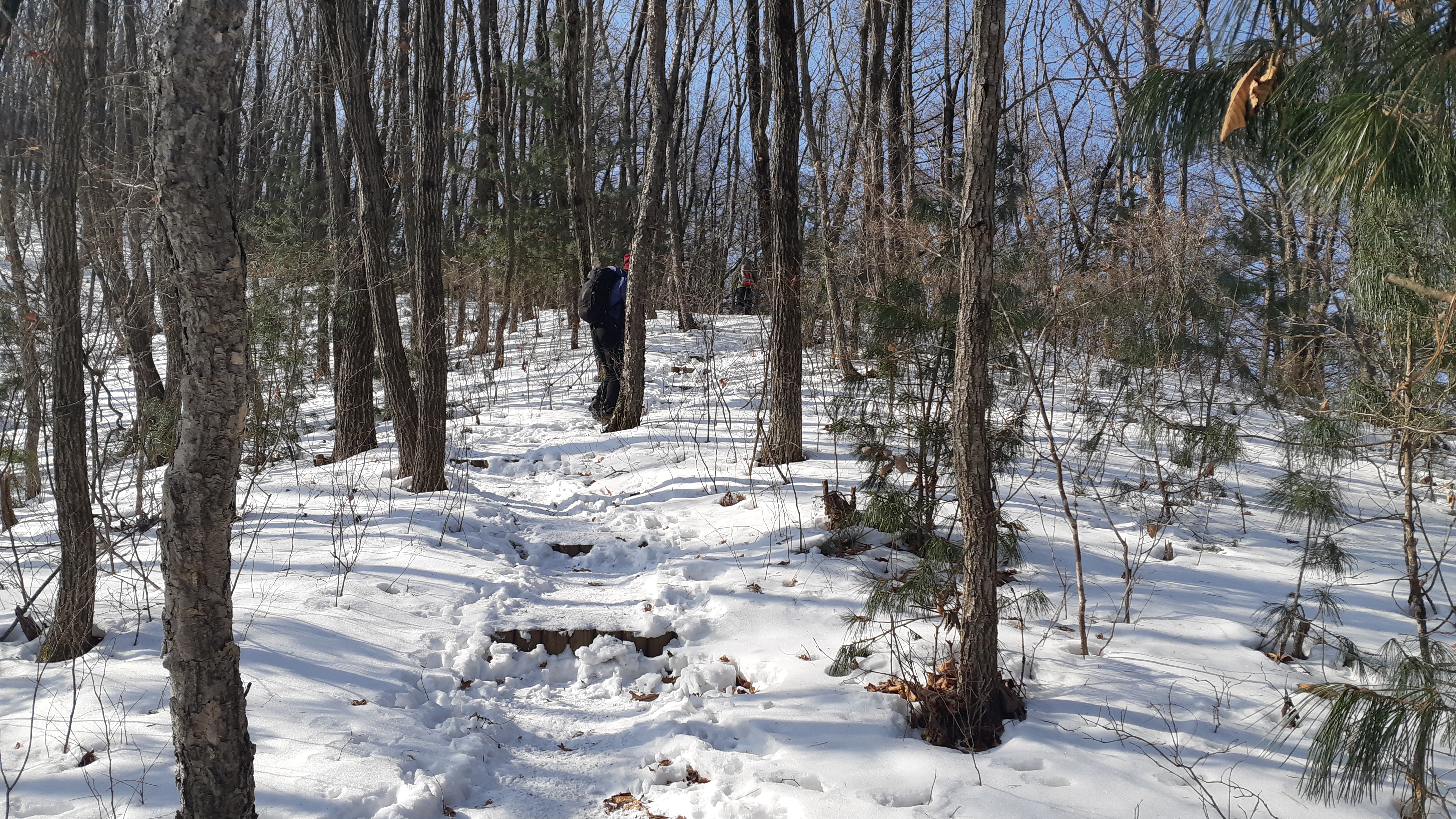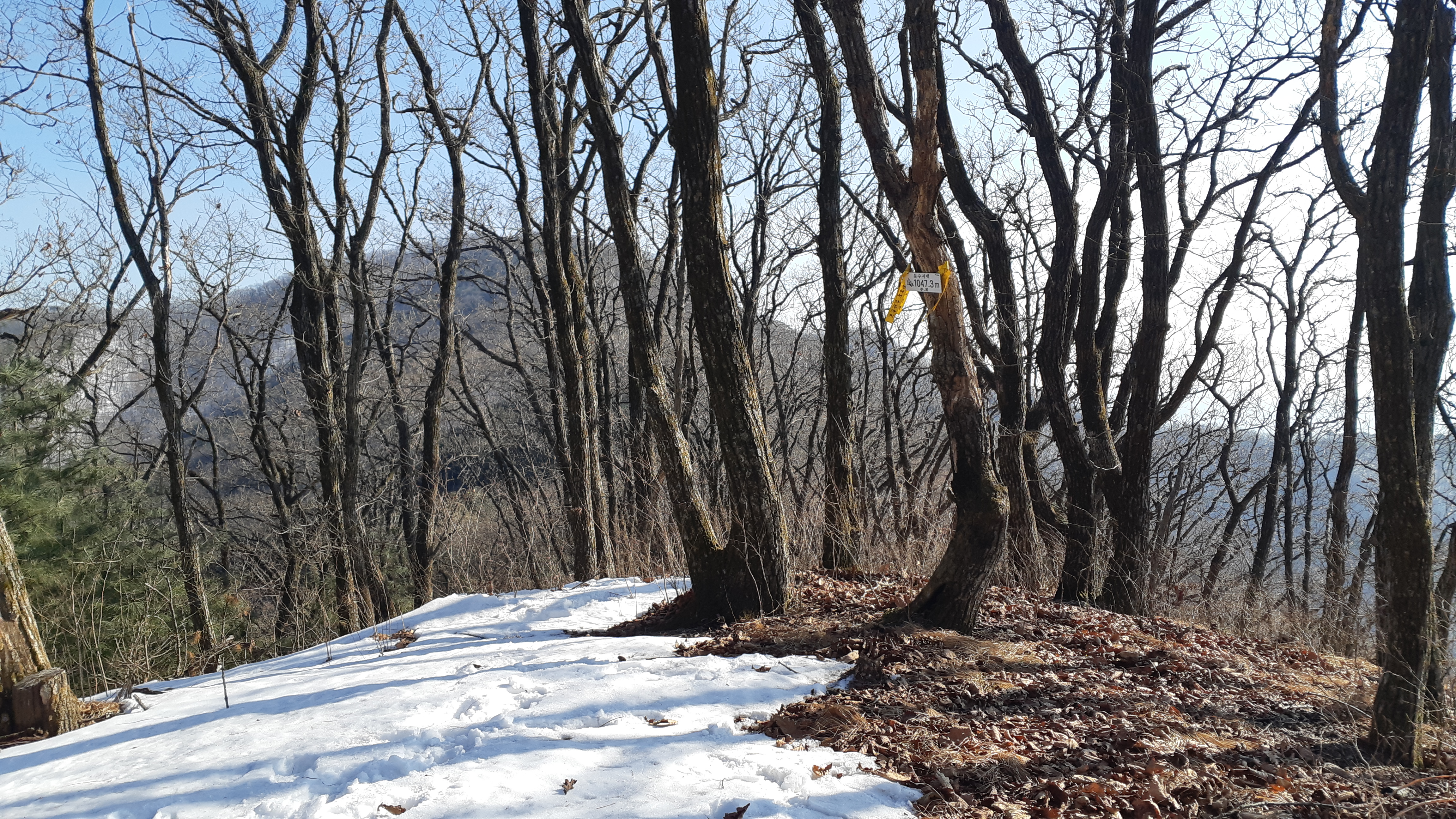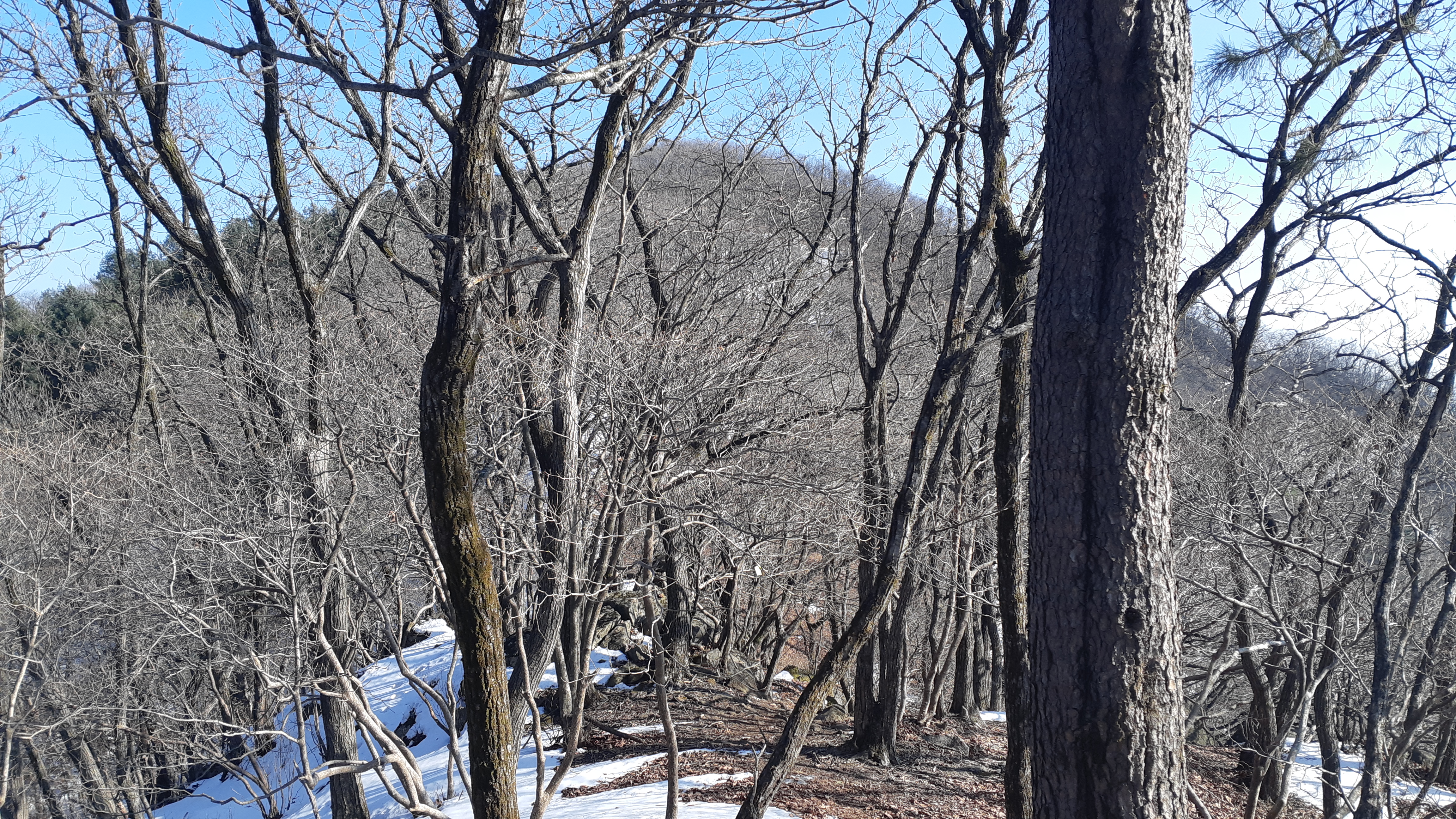 정면으로 보이는 문수산/계속된 눈길 산행이라 피로도는 갑절이다(14:58)