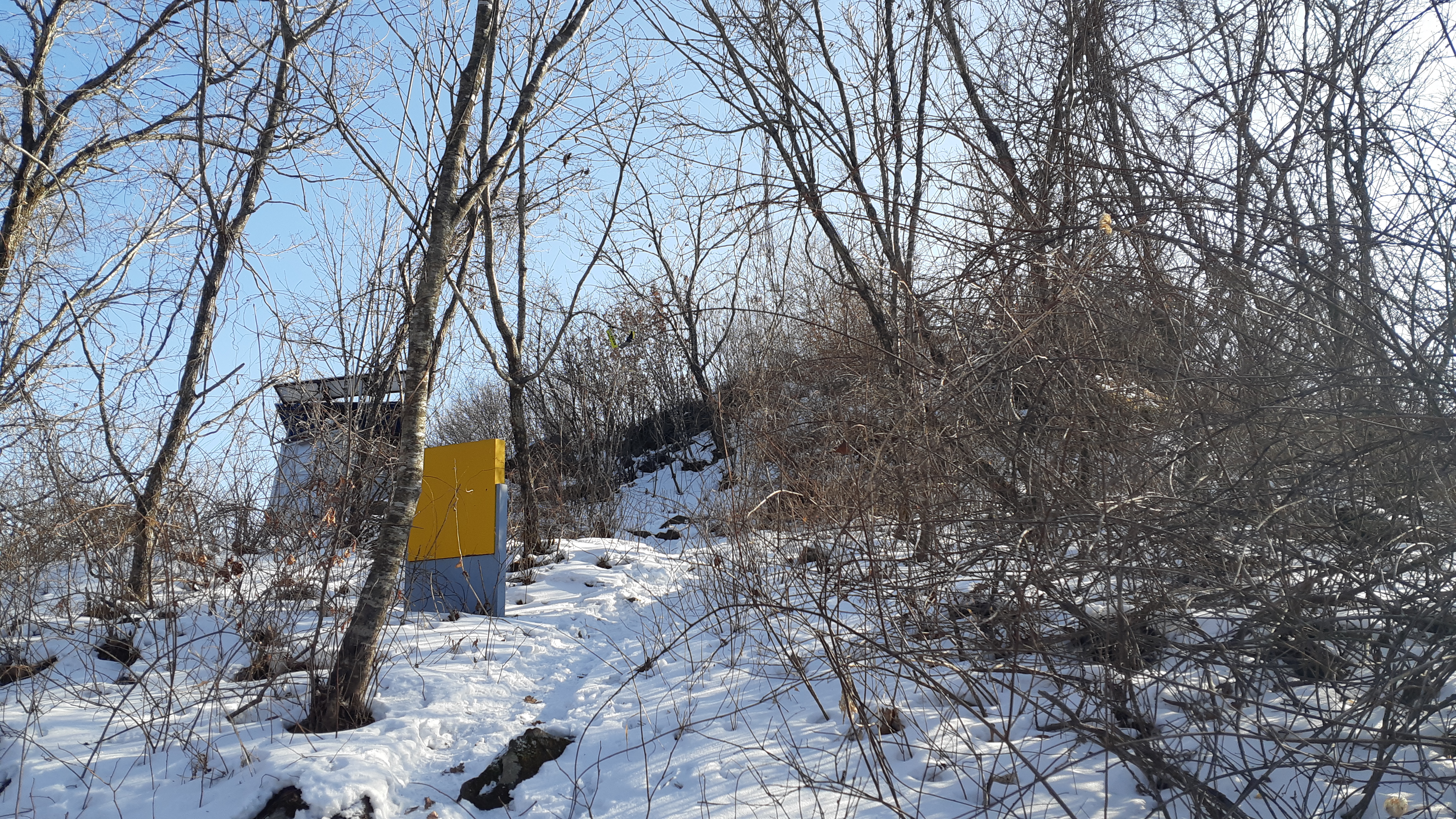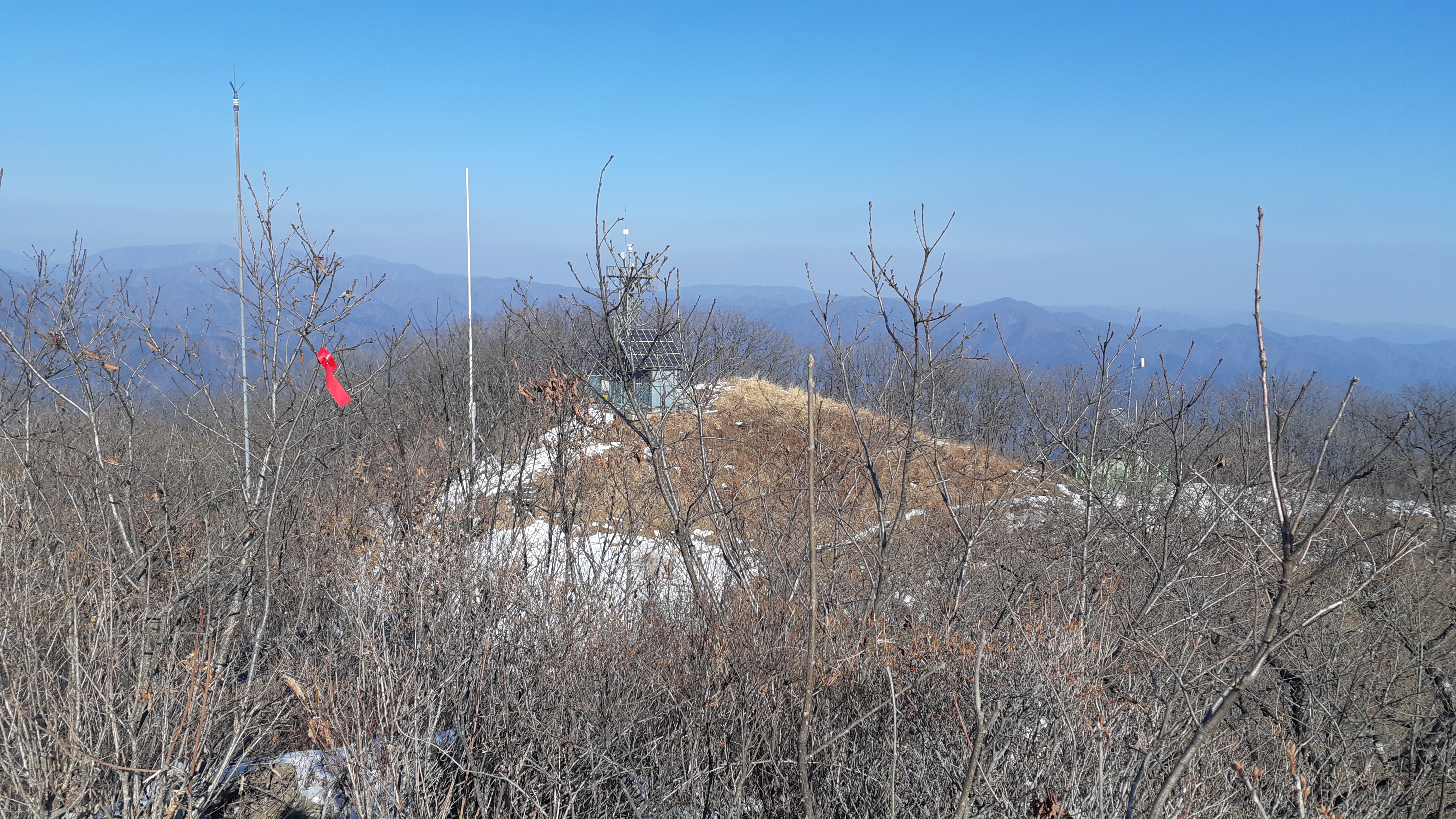 문수산 정상에서 바라본 헬기장 뒤로 무인산불감시초소(15:05)