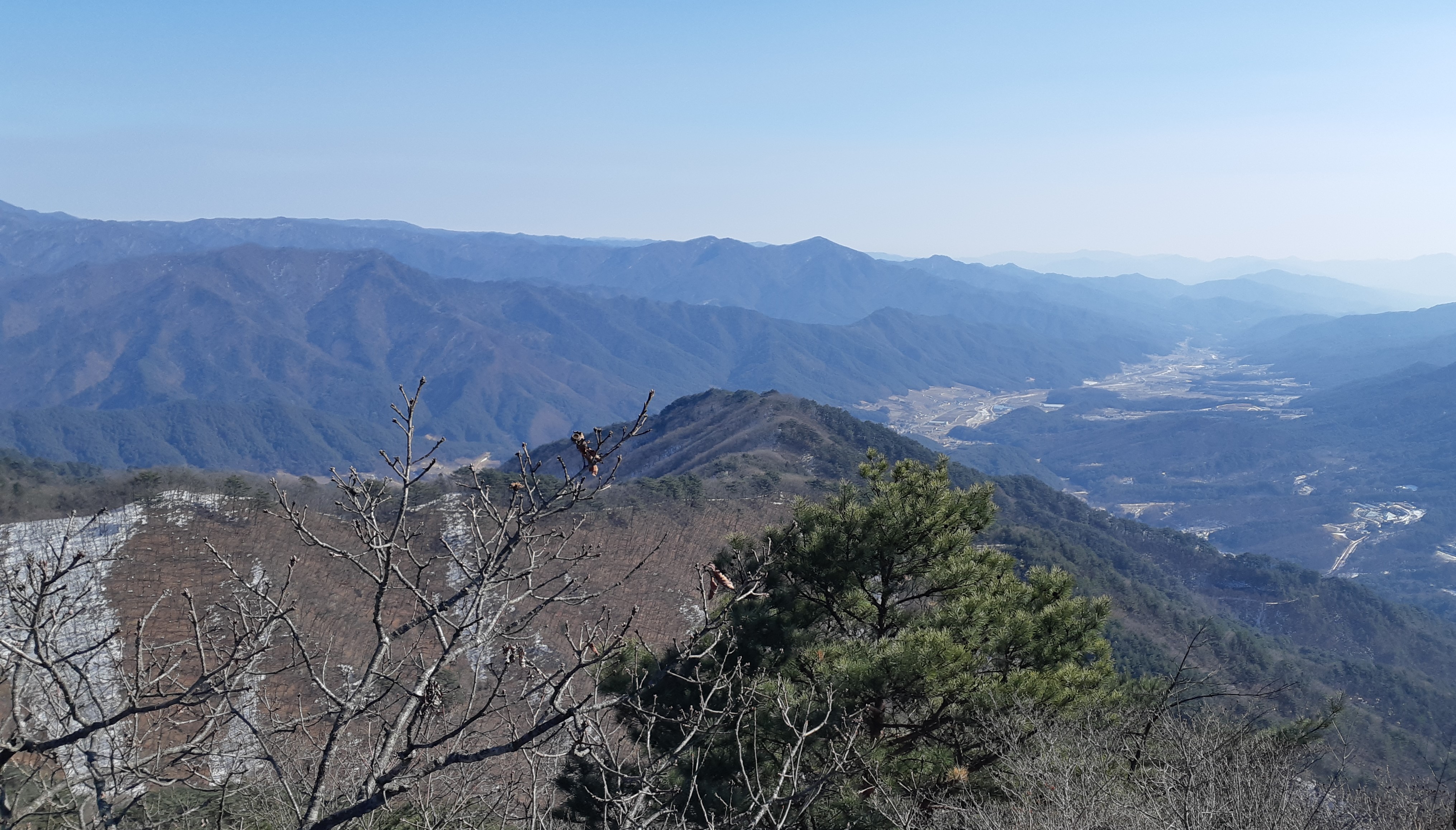 오른쪽으로 옥석산을 지난 백두대간이 박달령으로 갈아 앉았다 선달산으로 솟구치는 웅장한 모습(12:12)