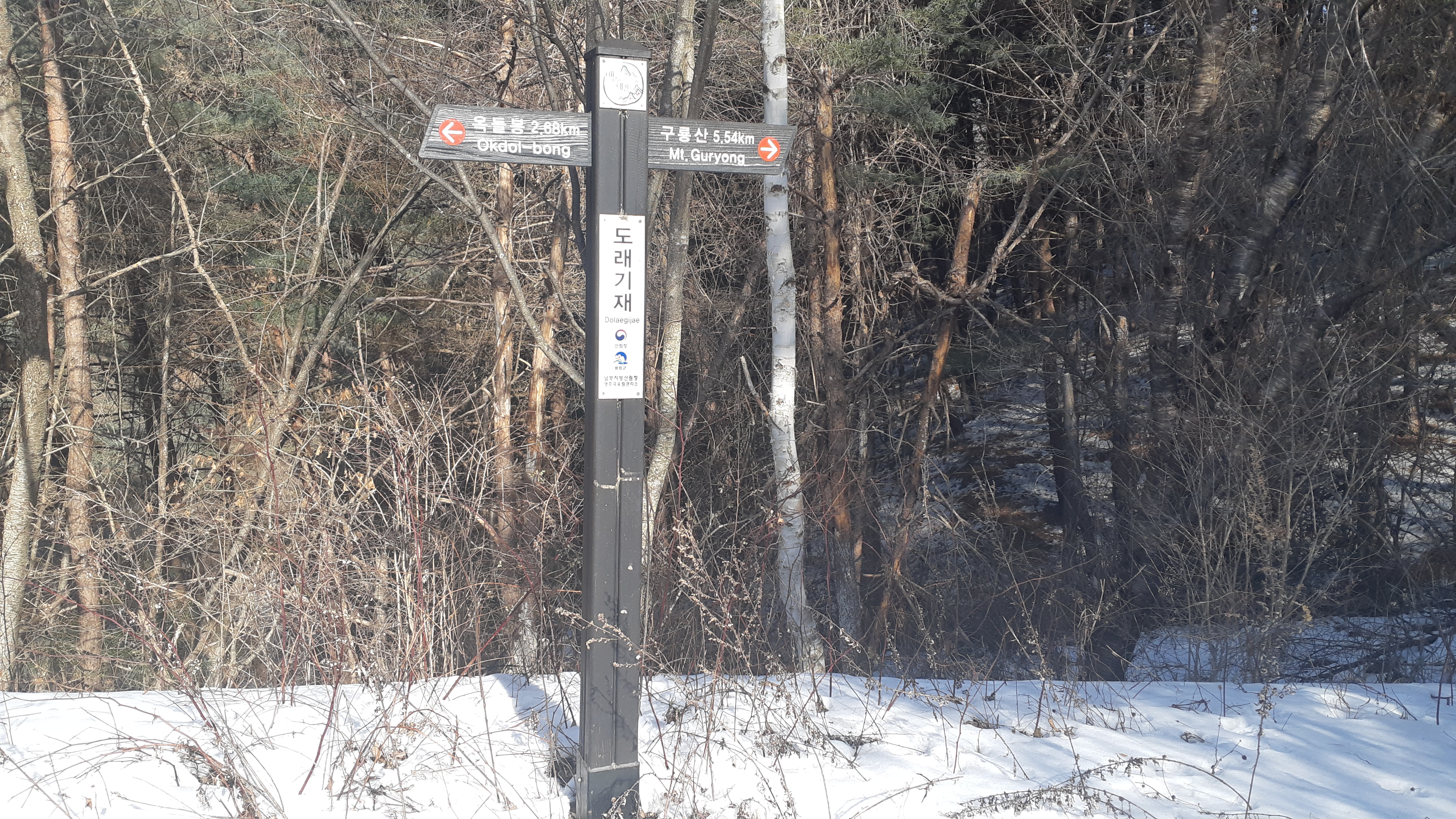 부산푸르나산악회를 따라 오늘은 한파가 절정에 달한다고 하거니와 경북에서 가장 춥다는 봉화군 춘양면과 물야면 봉성면에 걸쳐있는 옥석산~옥돌봉~문수산으로 간다. 오늘 찾는 이곳의 일부구간은 백두대간 상·하행시와 문수지맥 종주시 밟은 곳이라 낯설지는 않은 곳이다. 부산 동래에서 7시15분에 출발한 버스가 약3시간20여분 걸려 봉화군 춘양면 우구치리 동물이동통로가 지나는 도래기재에 도착한다. 음지에는 눈도 제법 쌓여있어 손이 시리기 전에 아이젠을 장착하고 출발하기로 한다.