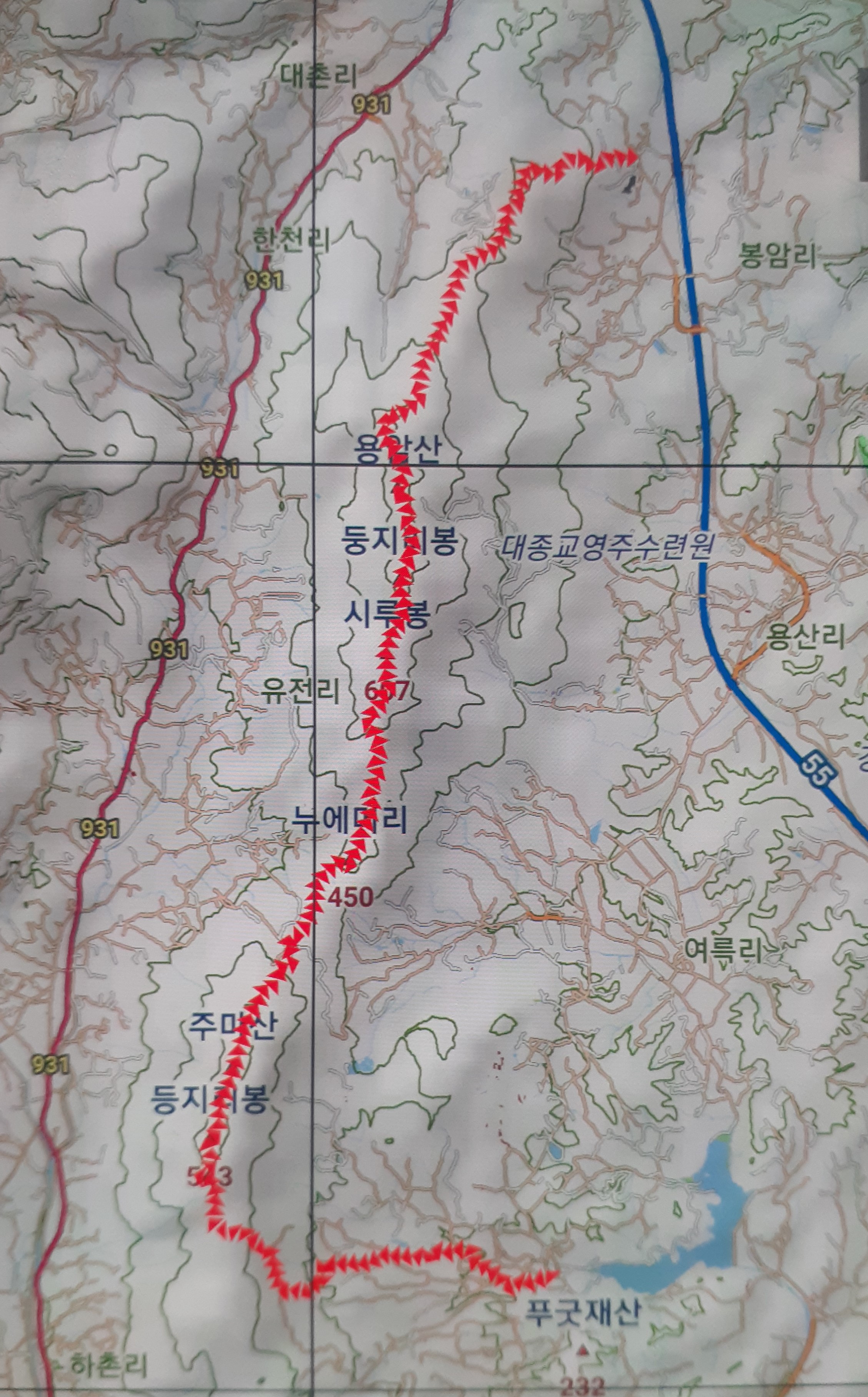 2. 오른산 : 등지리봉(543m), 주마산(544m), 시루봉(606m), 용암산(635m)